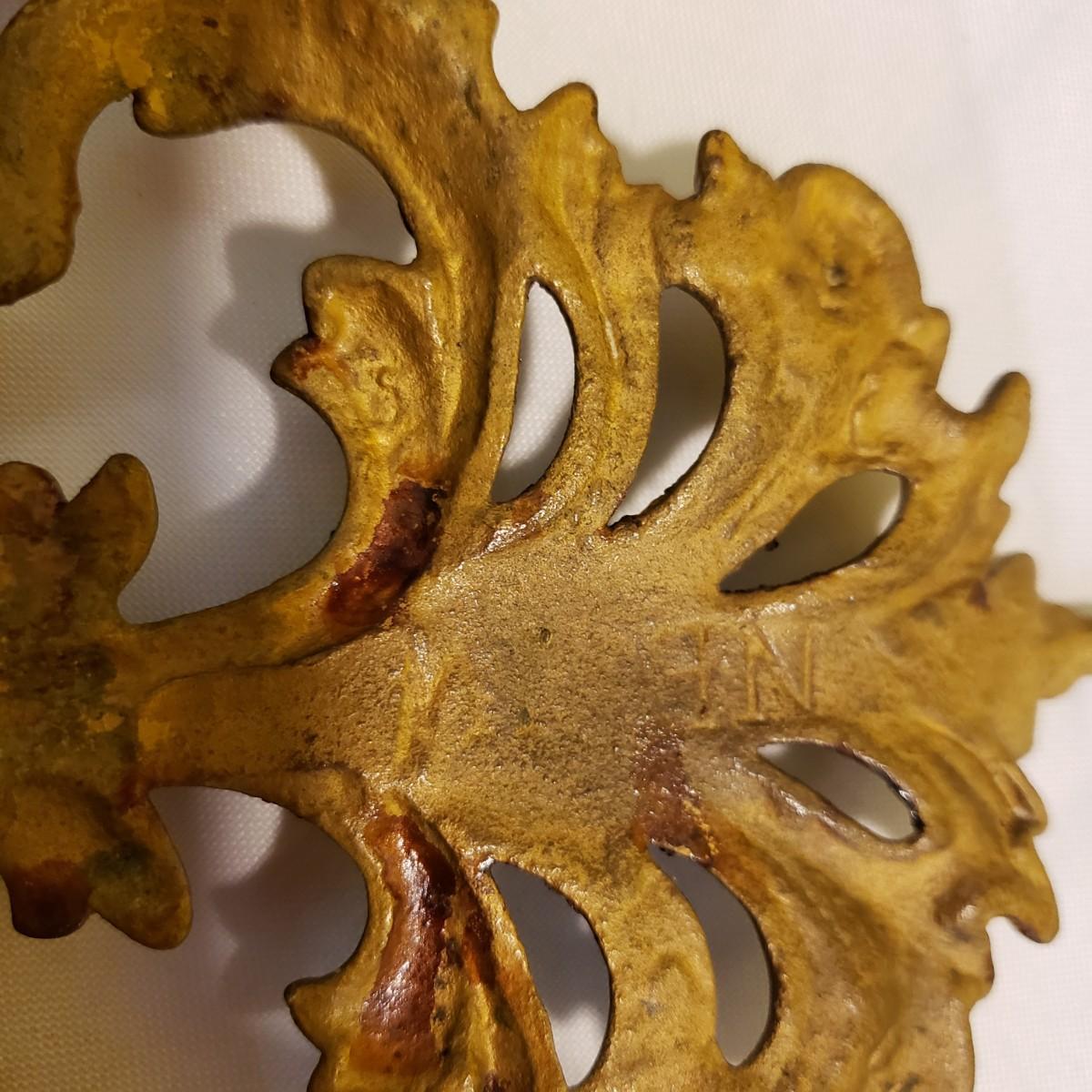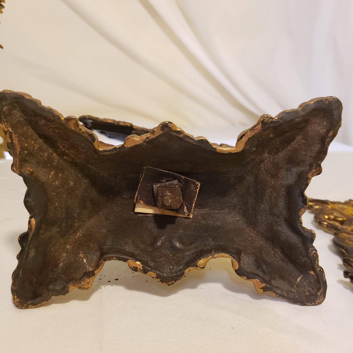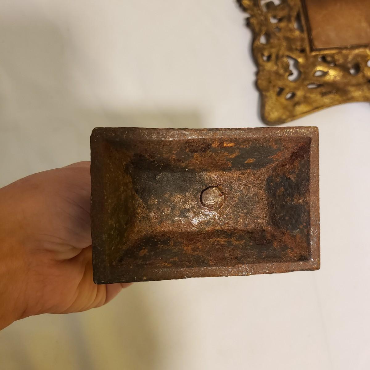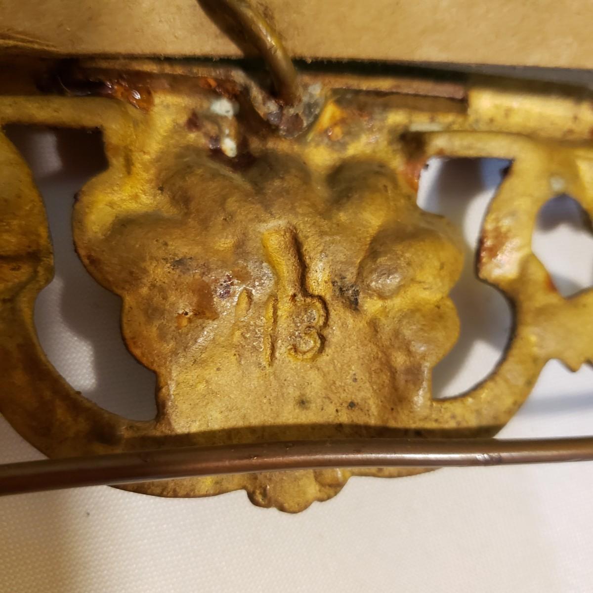 All these pieces are made from a casted metal. The frame with the pull out stand in the back of it measures 9"x13". The other frame measures 9.5"x17" has a broken stand on the back of it as seen in the pictures. The adjustable mirror on a stand measures 9.5"x17". The mirror itself has some black marks on it as seen in the pictures. The wheat door stop measures 4"x7". All pieces are also heavy, which will affect shipping costs.