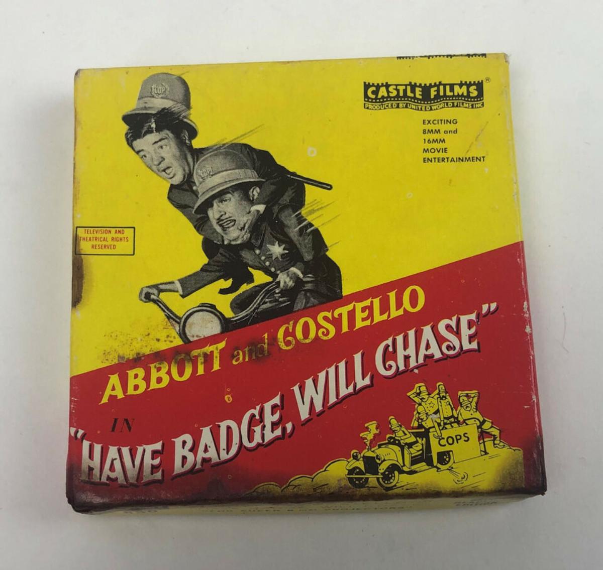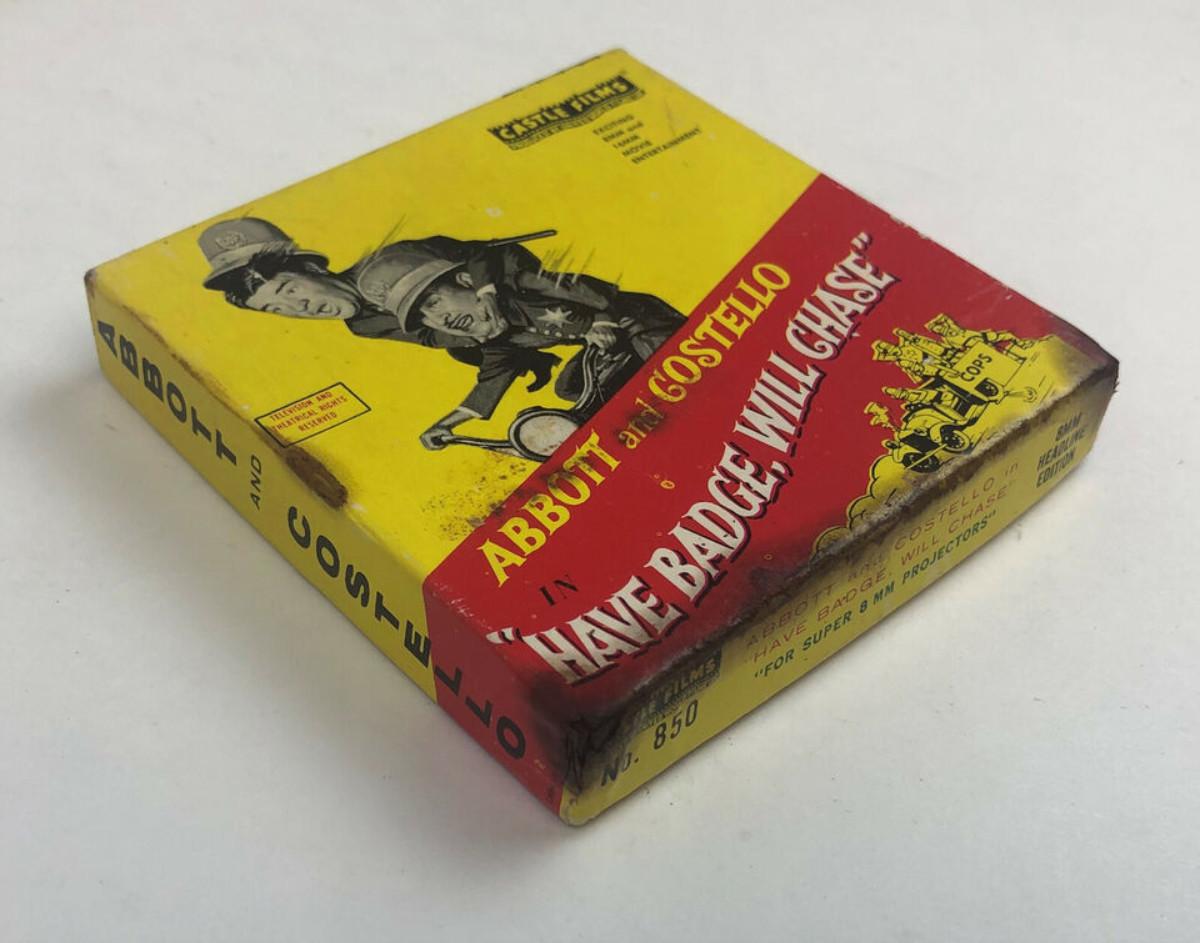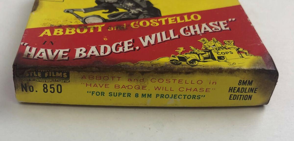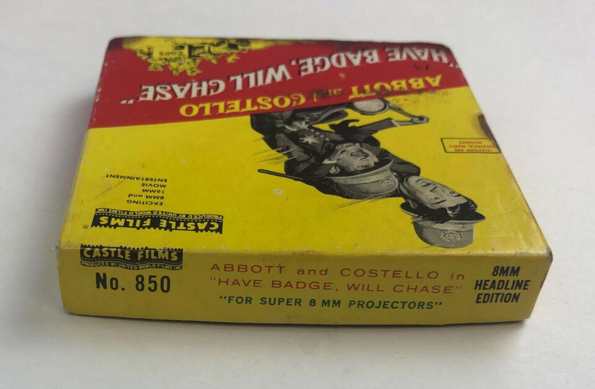 vintage Castle Film No. 850...ABBOTT and COSTELLO in "HAVE BADGE, WILL CHASE" 8mm Headline Edition for Super 8 Projectors...We have not viewed this film and offer it as found...Damage to outer box.
