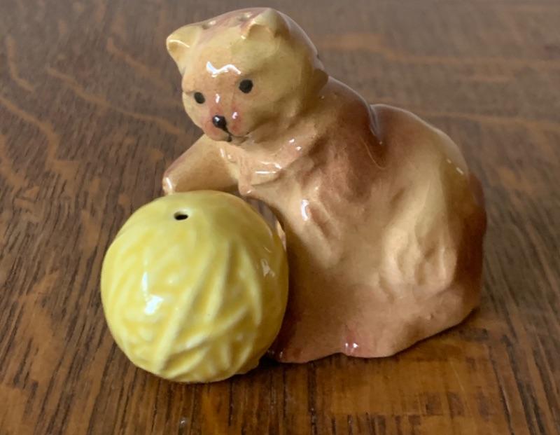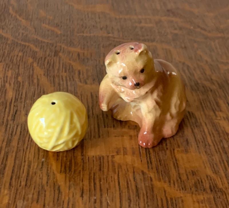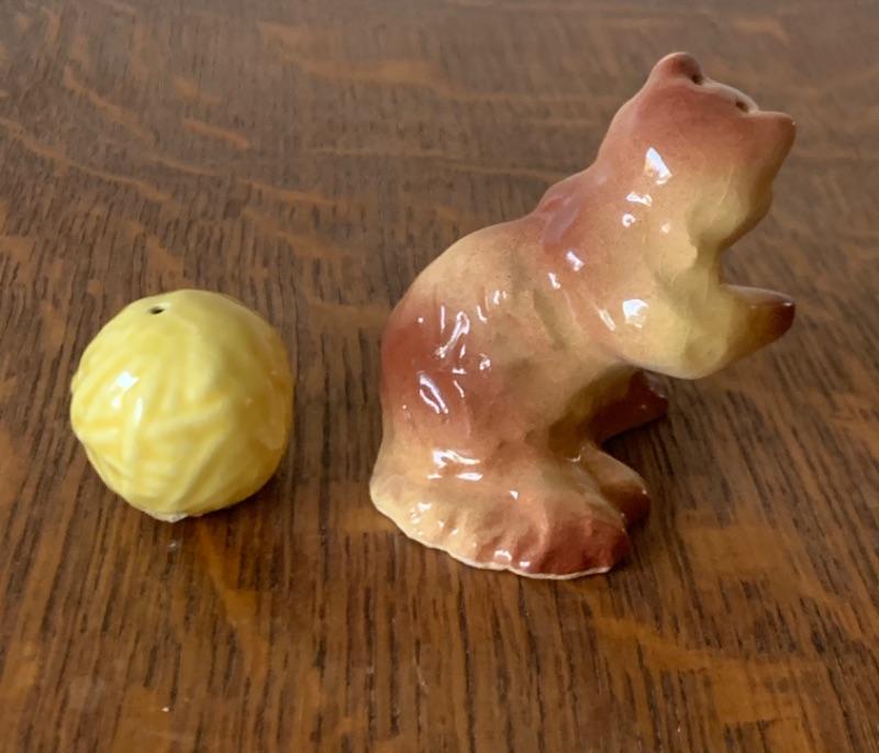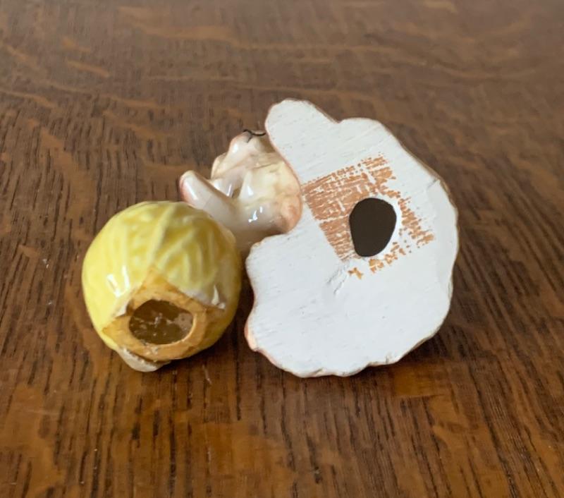 Adorable cat with yarn ball. 2 3/4”. Light crazing.