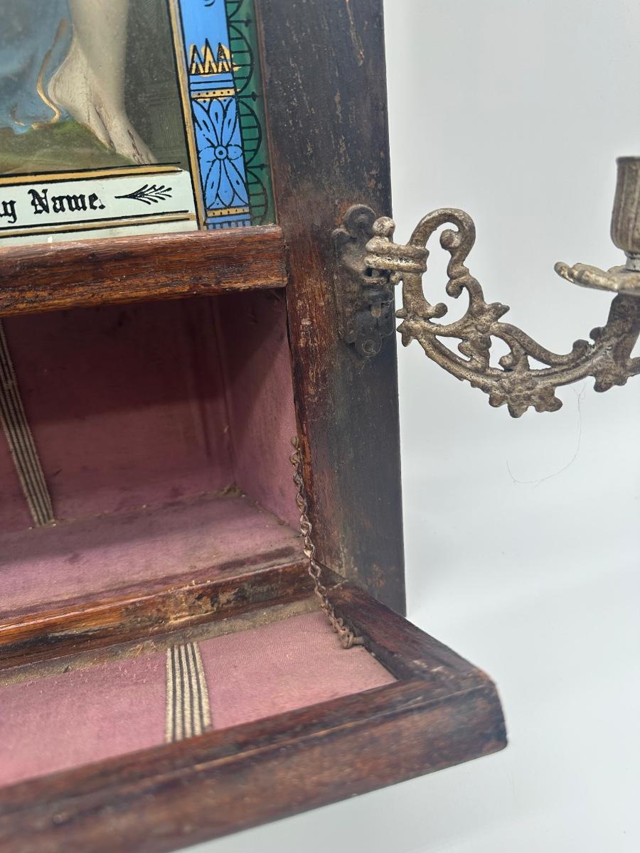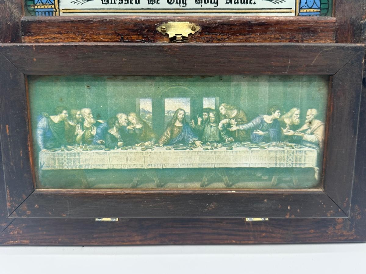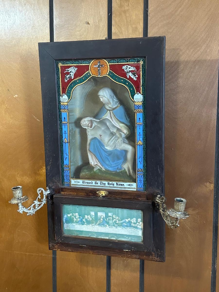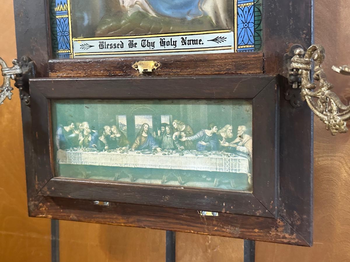 Vintage Catholic devotional wall shrine shadow box featuring a Pietà image of the Virgin Mary holding Christ, with the inscription “Blessed Be Thy Holy Name,” and a lower panel depicting The Last Supper. Displays beautiful, rich colors. Wooden shadow box frame with cast metal side candle arms and a hinged lower compartment lined in fabric. Surface wear, finish loss, and patina consistent with age; interior fabric shows wear.