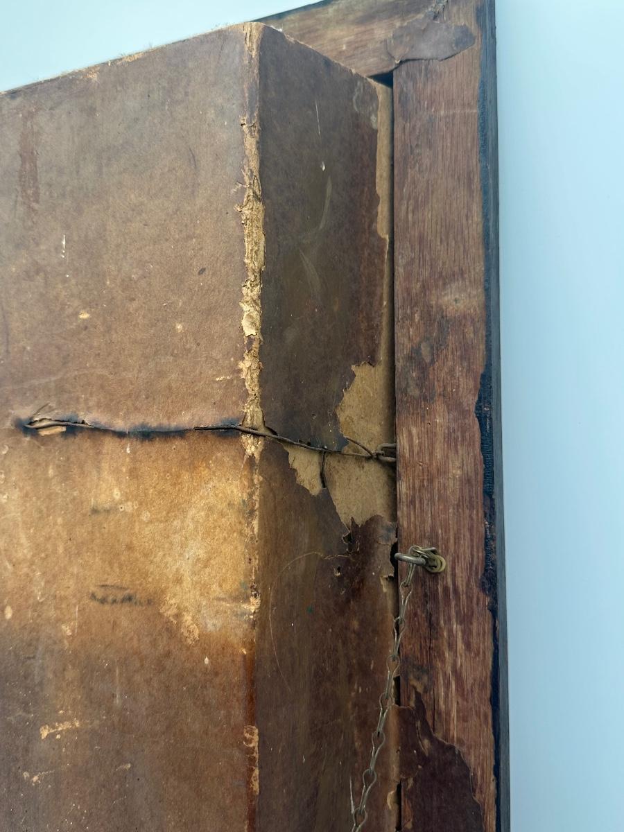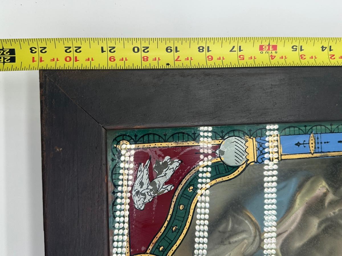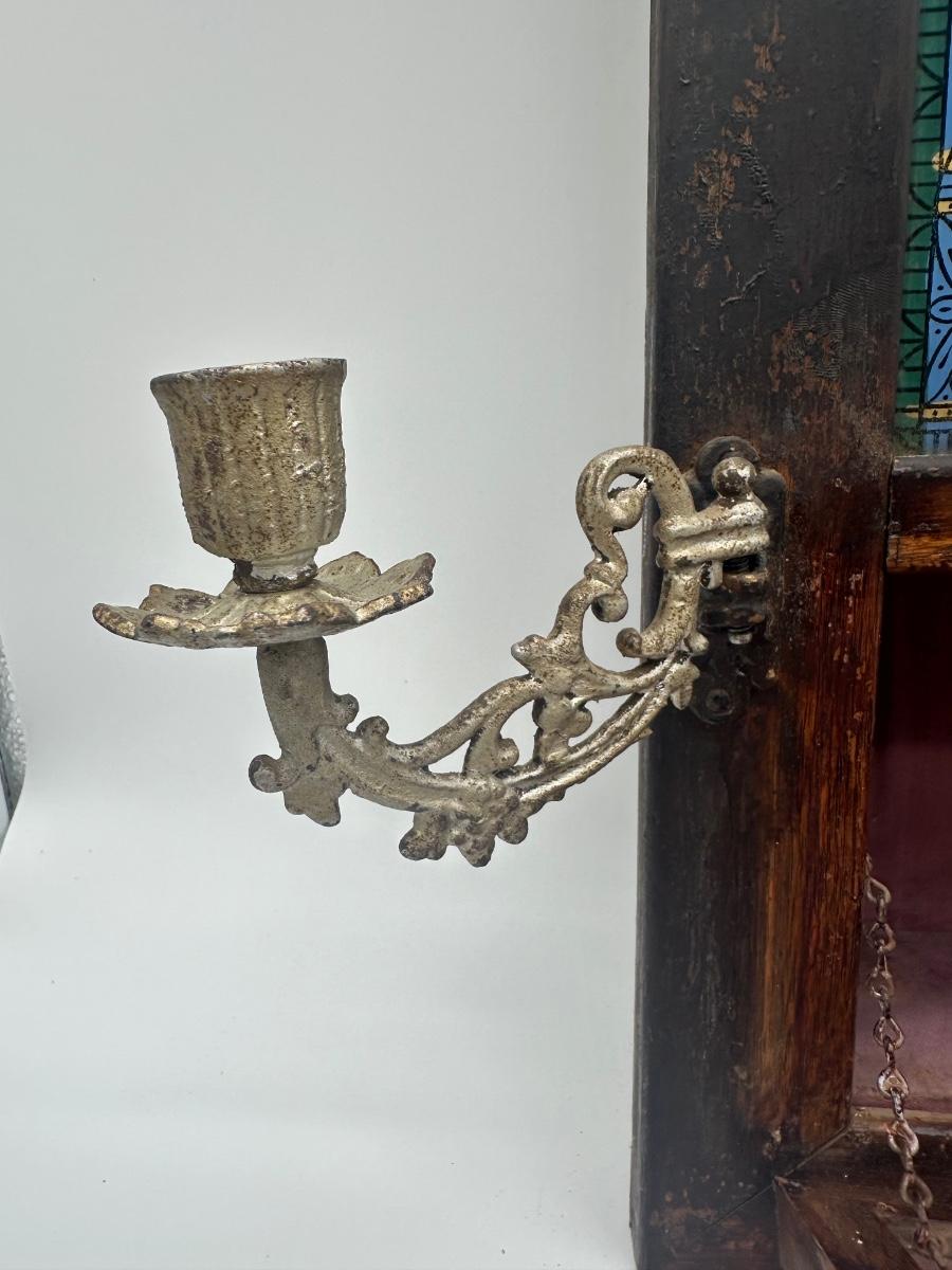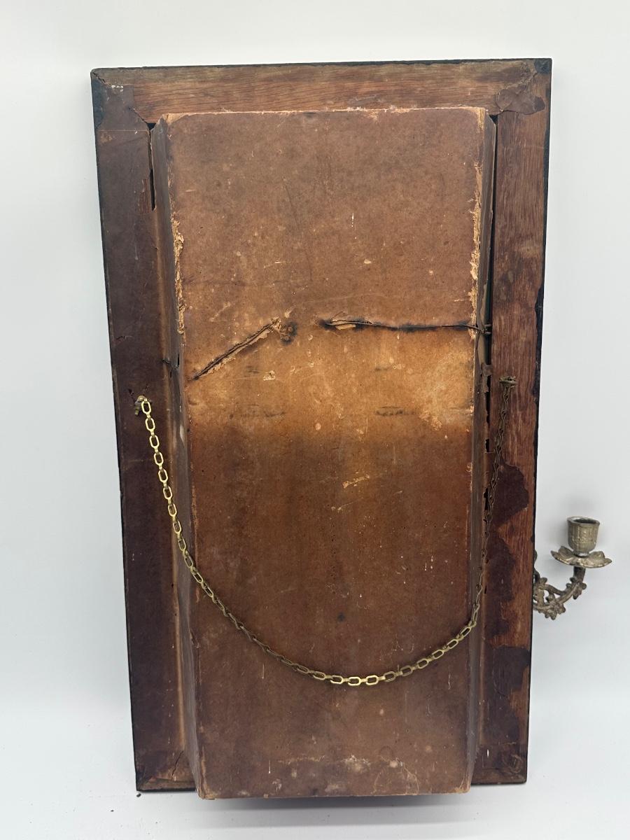 Vintage Catholic devotional wall shrine shadow box featuring a Pietà image of the Virgin Mary holding Christ, with the inscription “Blessed Be Thy Holy Name,” and a lower panel depicting The Last Supper. Displays beautiful, rich colors. Wooden shadow box frame with cast metal side candle arms and a hinged lower compartment lined in fabric. Surface wear, finish loss, and patina consistent with age; interior fabric shows wear.
