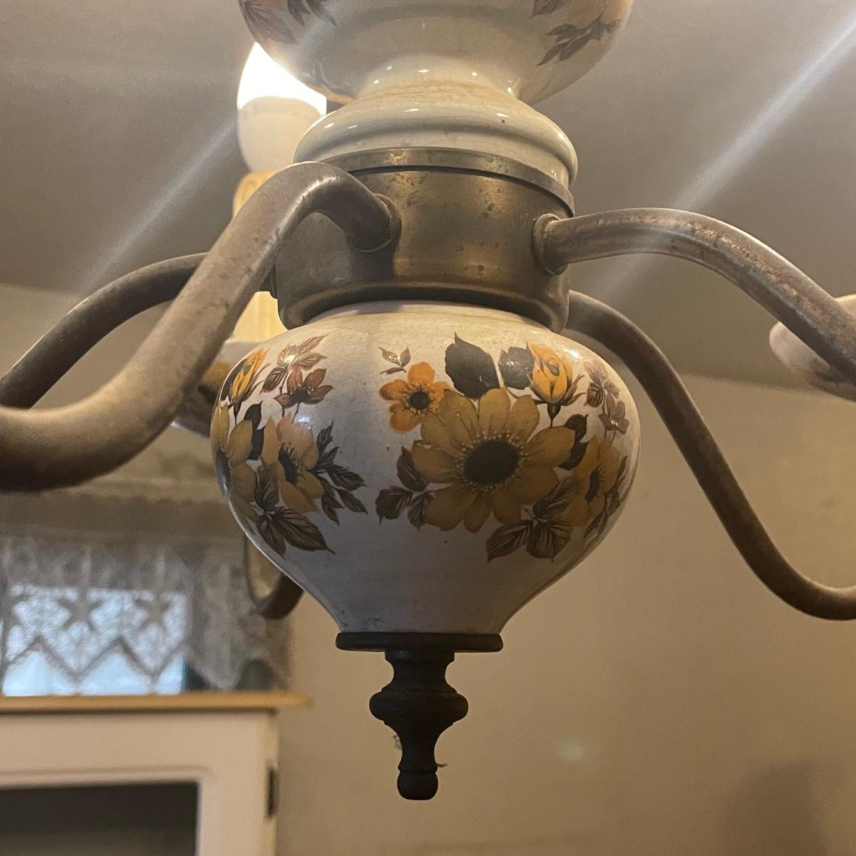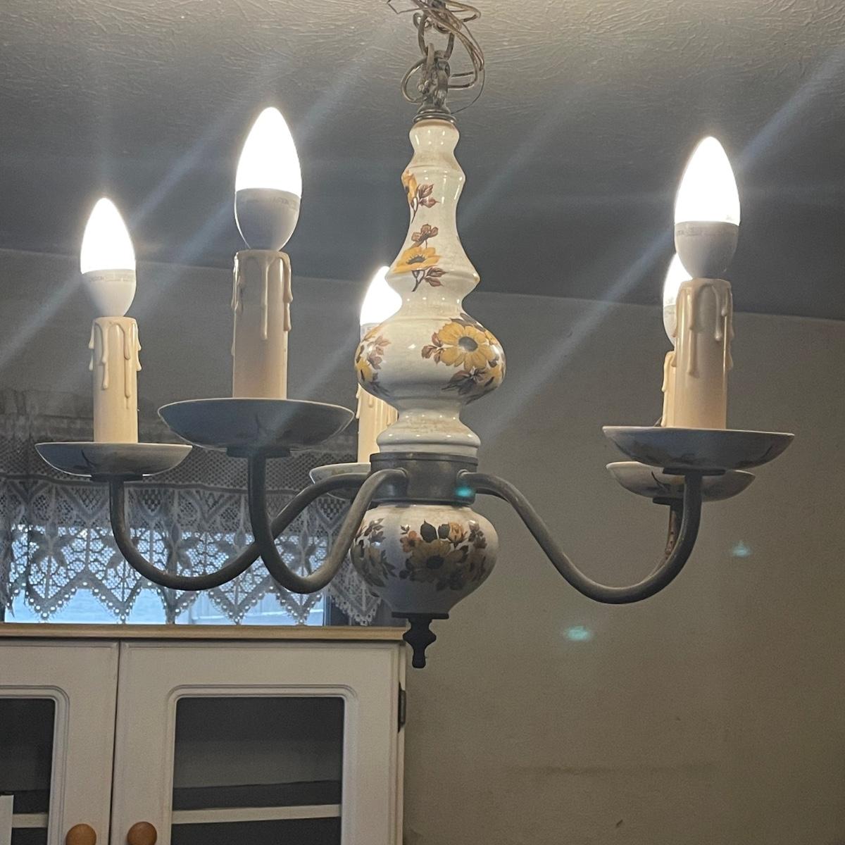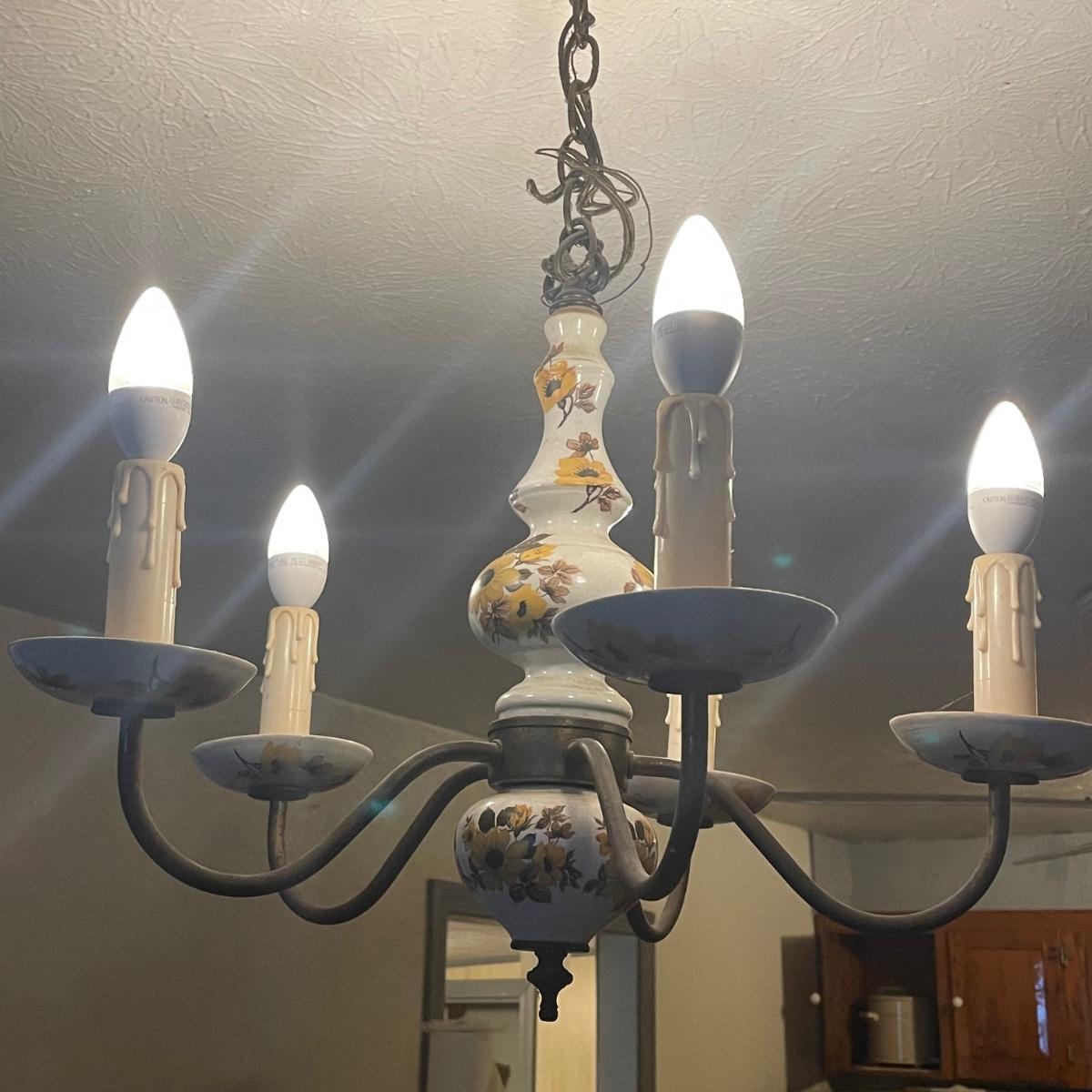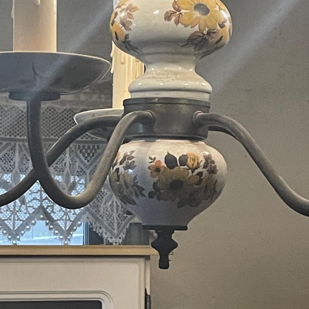 This vintage light is ceramic (with floral design) and metal with plastic faux candles that house the four bulbs. Comes with adjustable metal chain. It is the winning bidders responsibility to take the light down themselves.