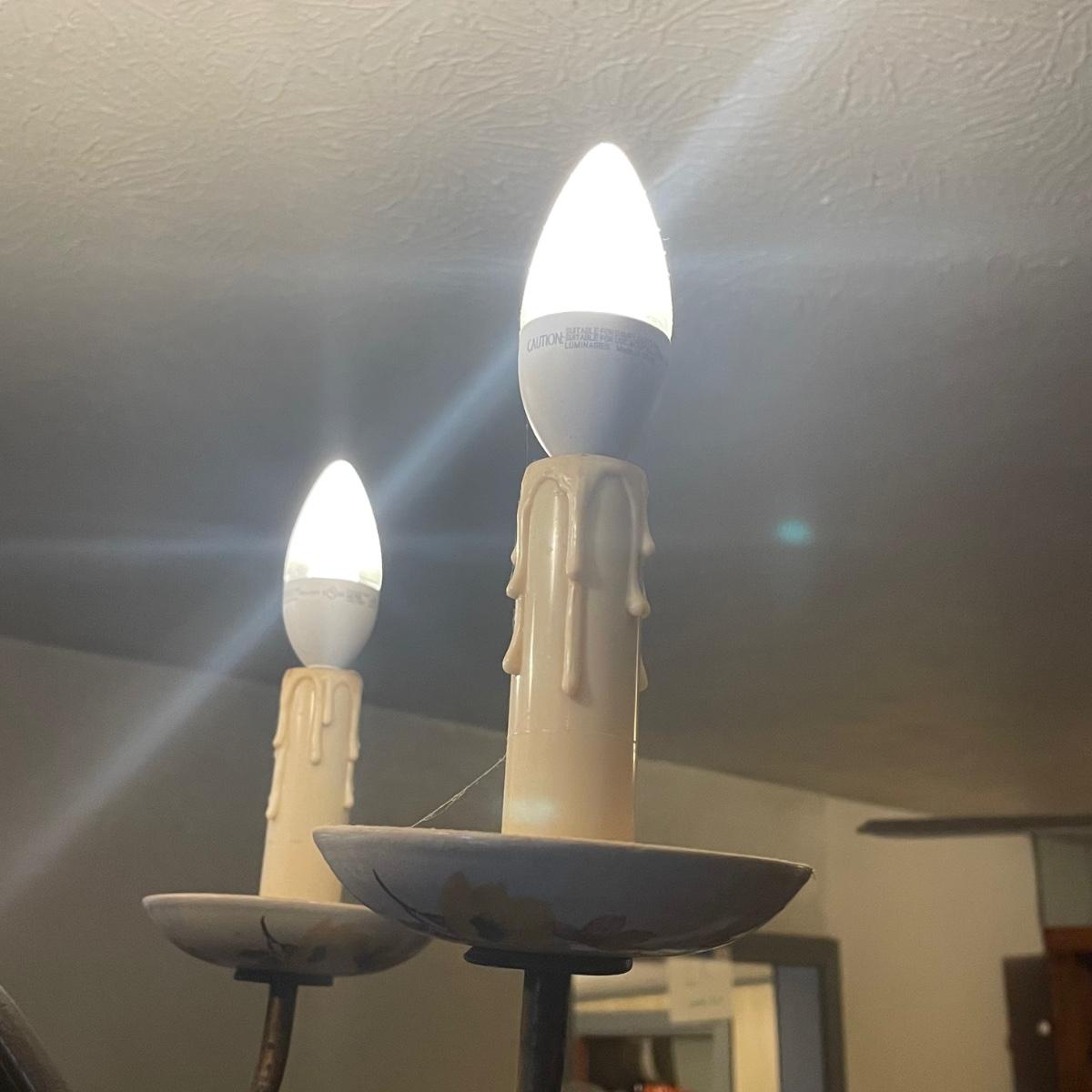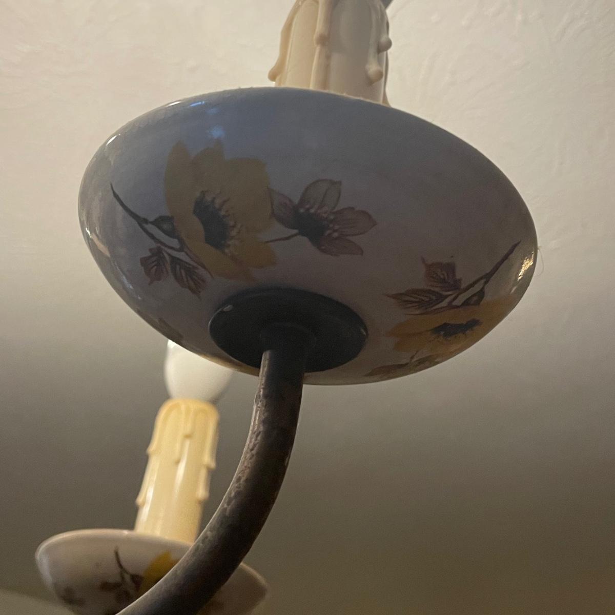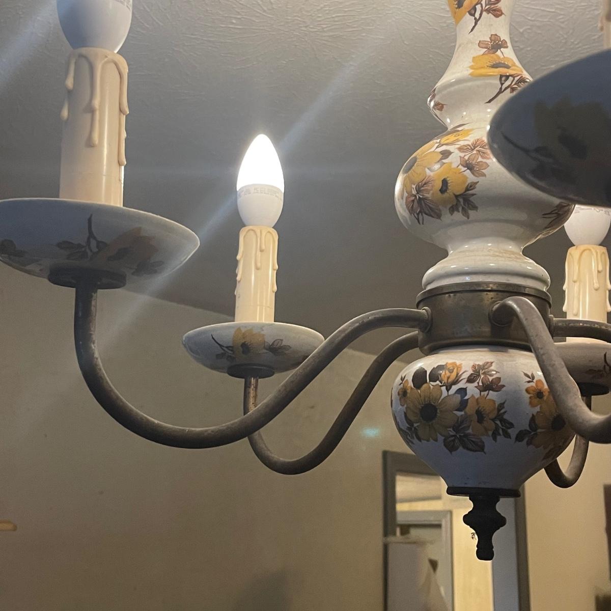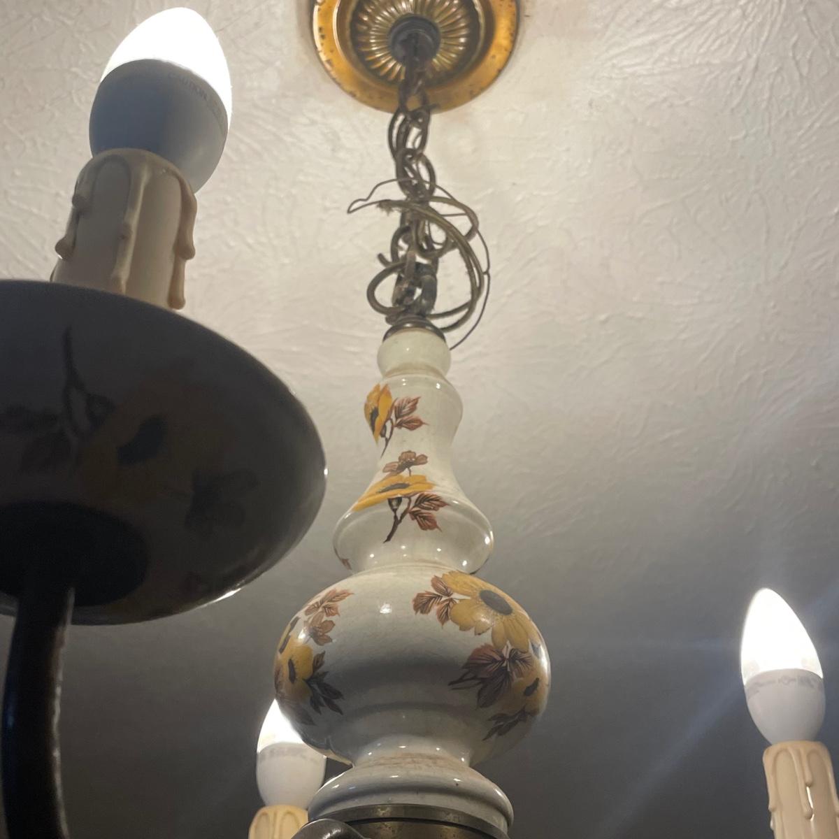 This vintage light is ceramic (with floral design) and metal with plastic faux candles that house the four bulbs. Comes with adjustable metal chain. It is the winning bidders responsibility to take the light down themselves.