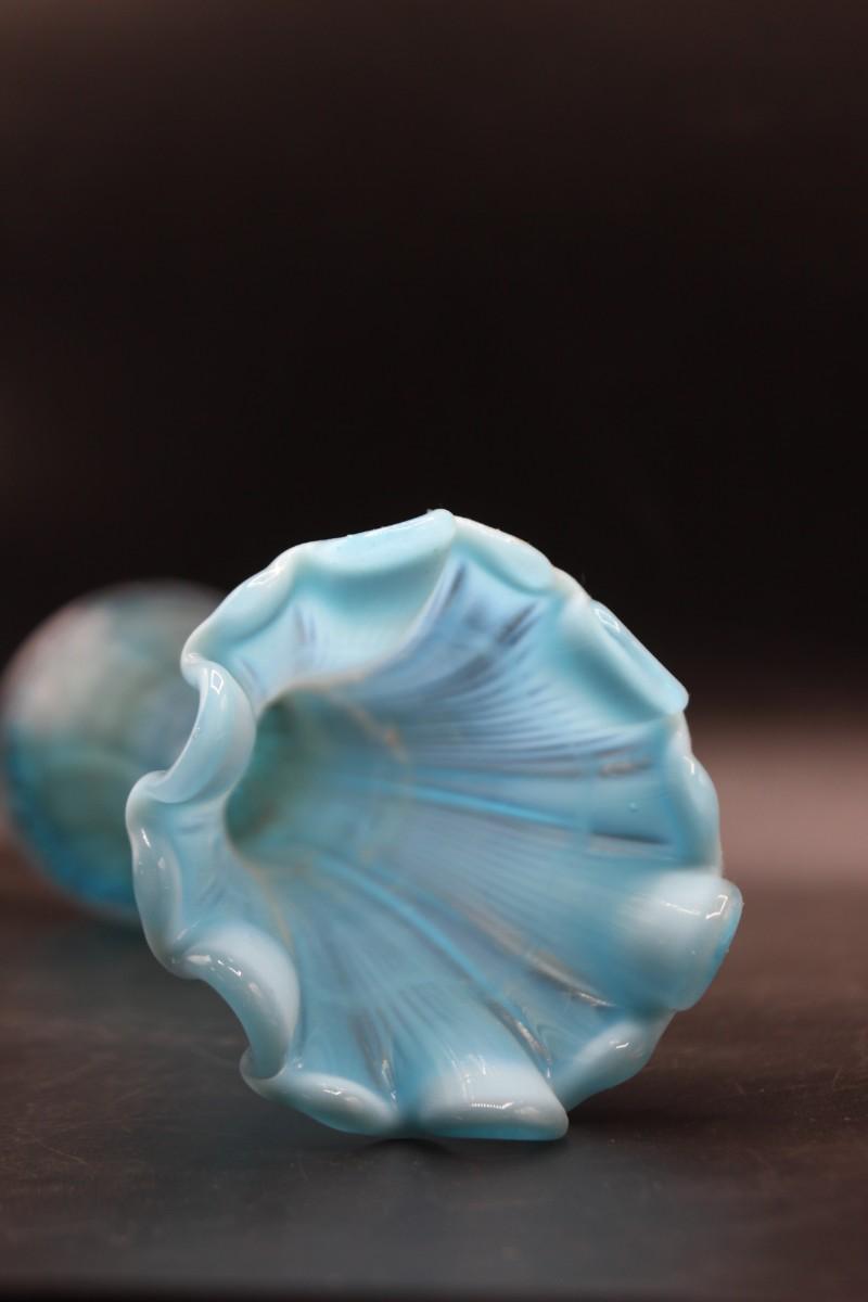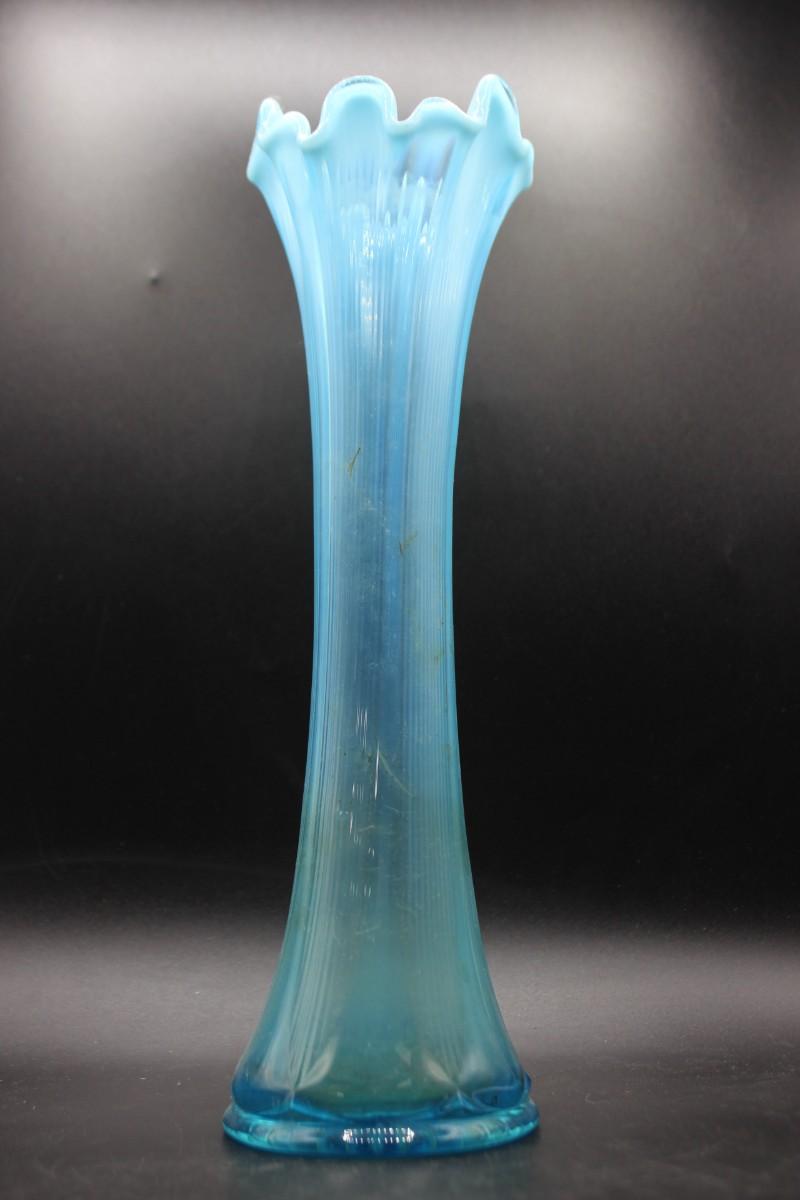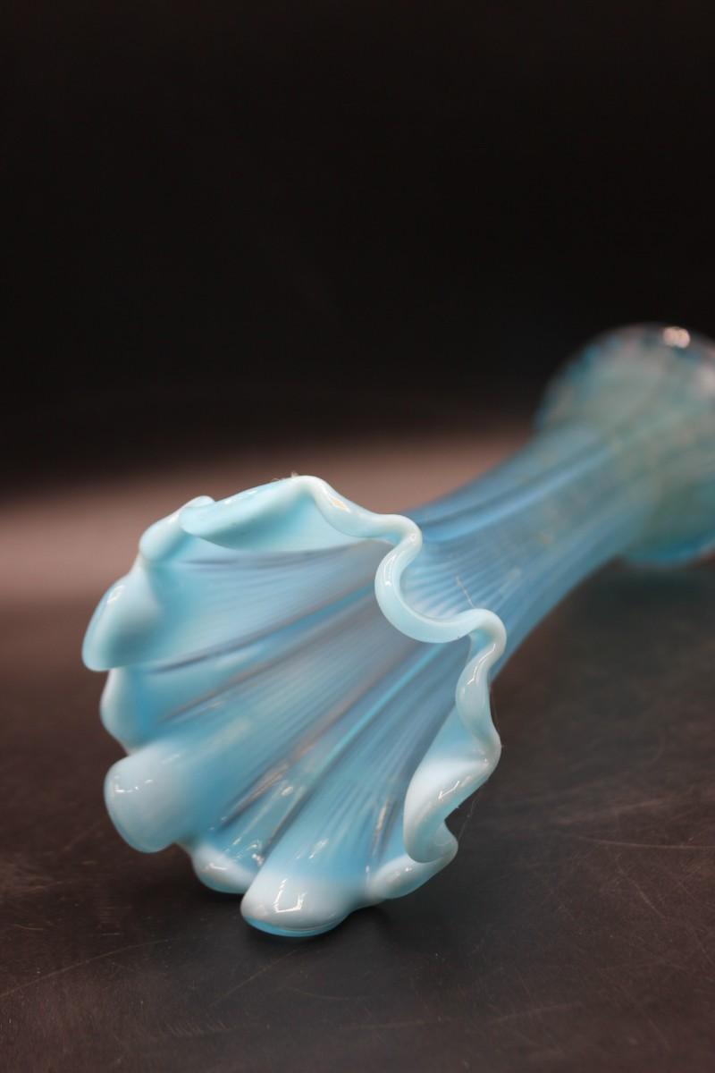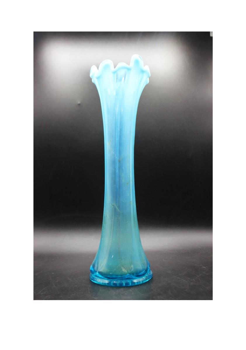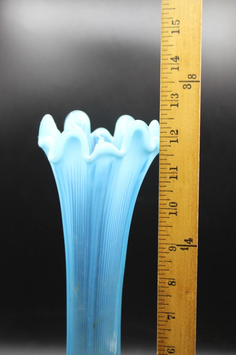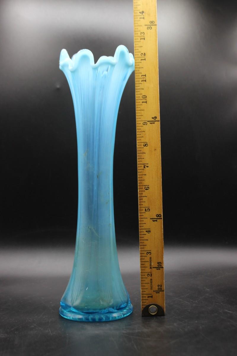 Vintage Celeste Blue Carnival Glass Fenton Flute Vase, there are no significant cracks or chips to the glass and is in good vintage condition. Has been slightly used and needs to be cleaned. Check pictures for more details and for sizing.