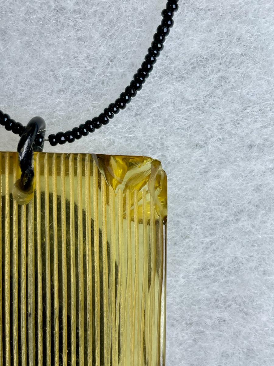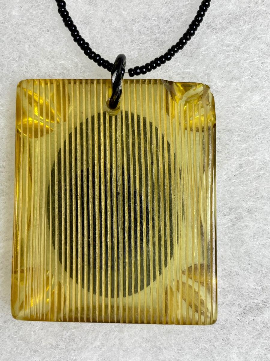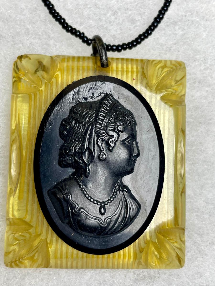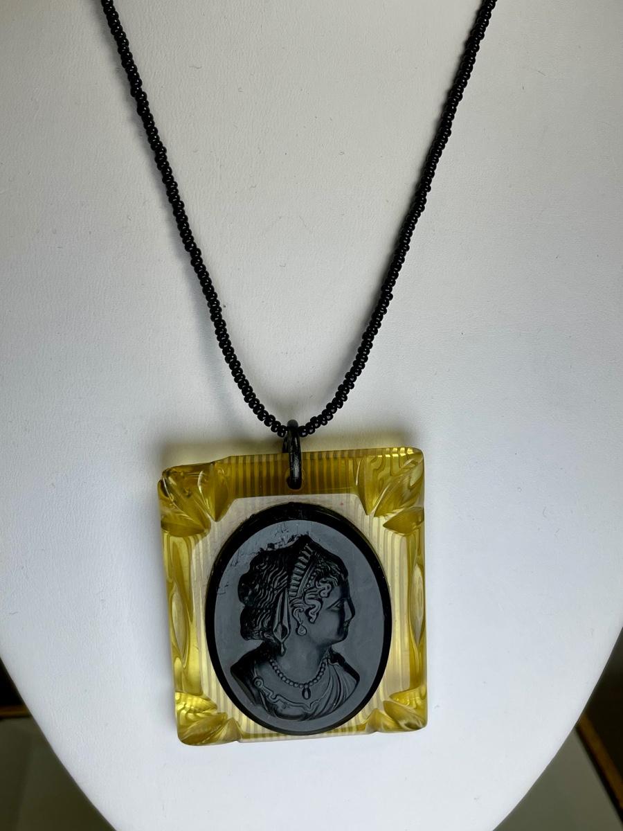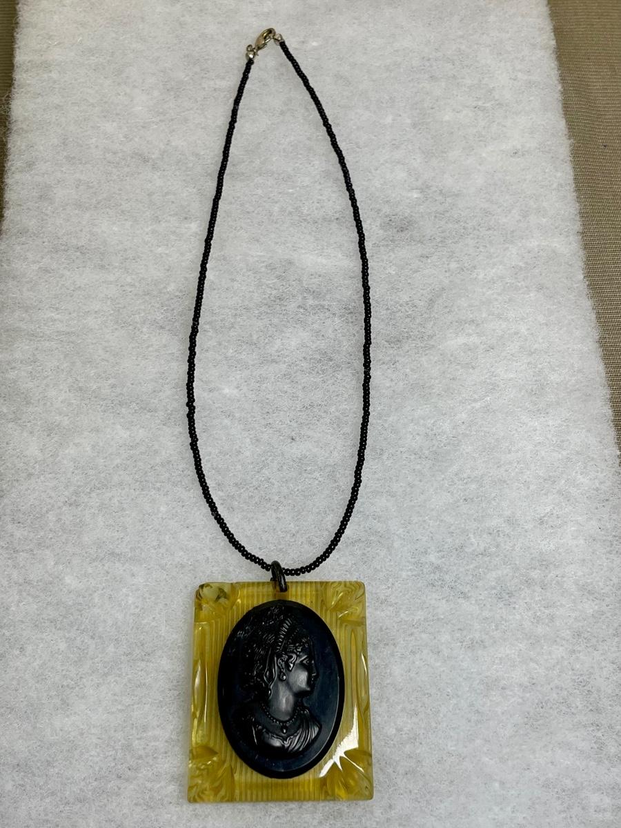 Vintage pendant on modern 16” seed bead necklace. It does have a small chip on the back upper corner as shown which is hardly noticeable when wearing it.