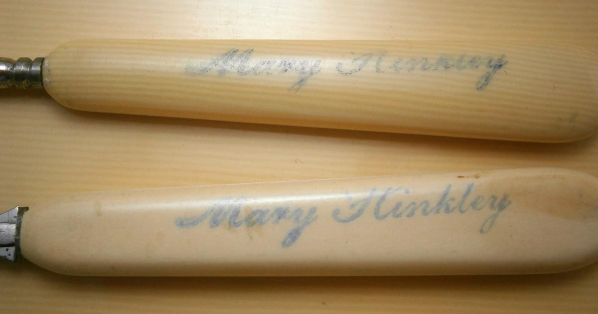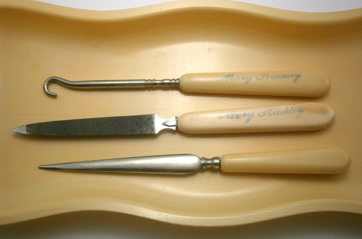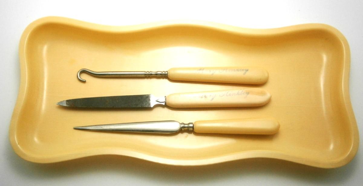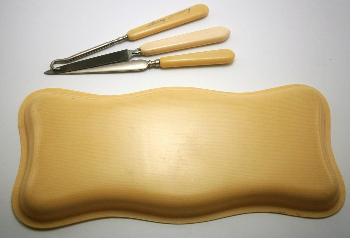 Vintage Celluloid Dresser Tray with Personalized Vanity Items from the 1920's-30's, tray is 9 1/4 in. long, the file is 6 in. long.
