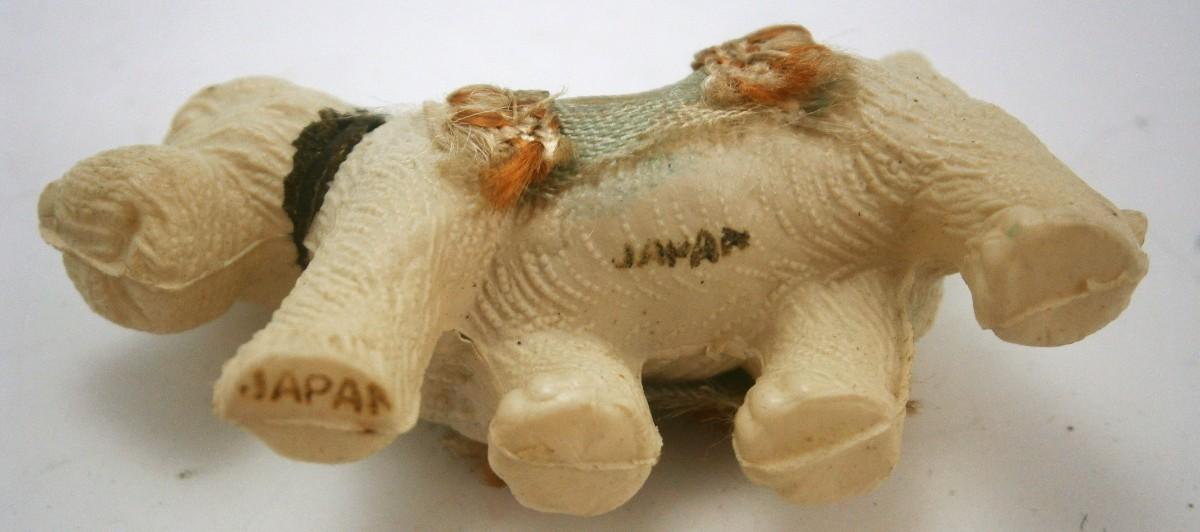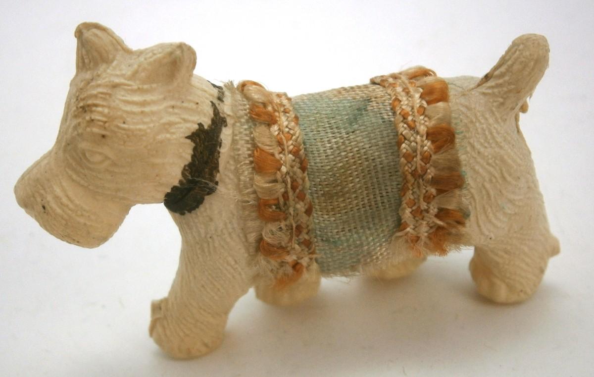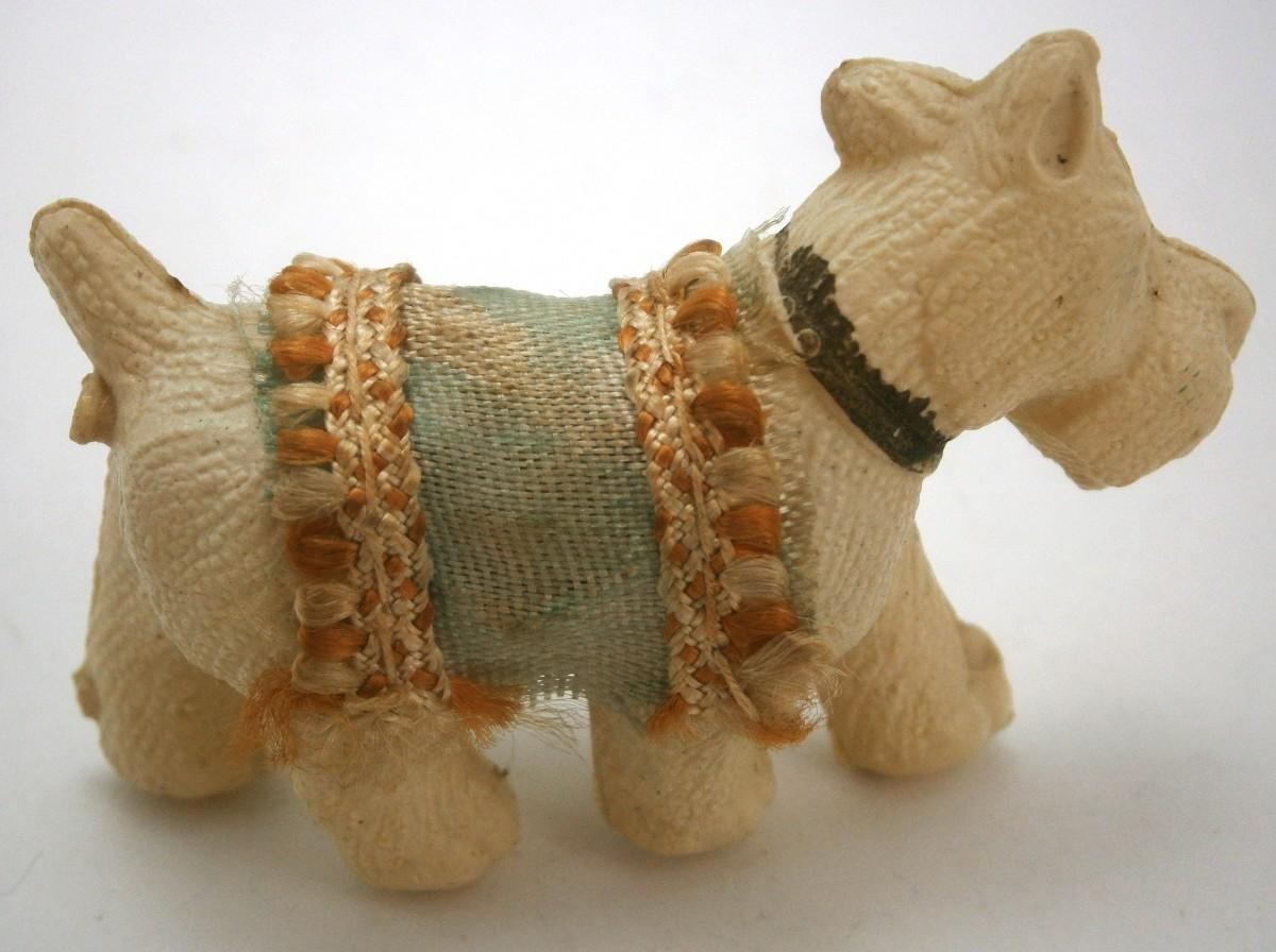 Vintage Celluloid Scottie Dog made in Pre WWII Japan, 2 1/4 inches long, celluloid with cloth blanket.