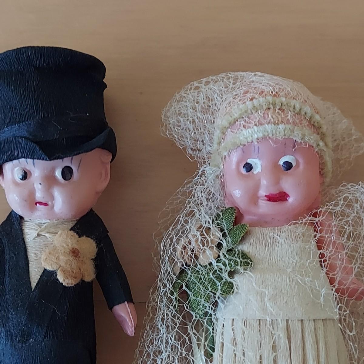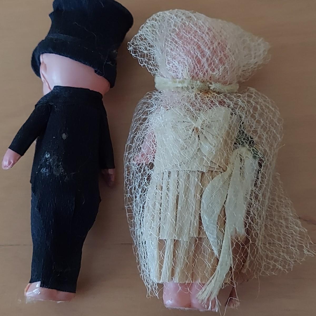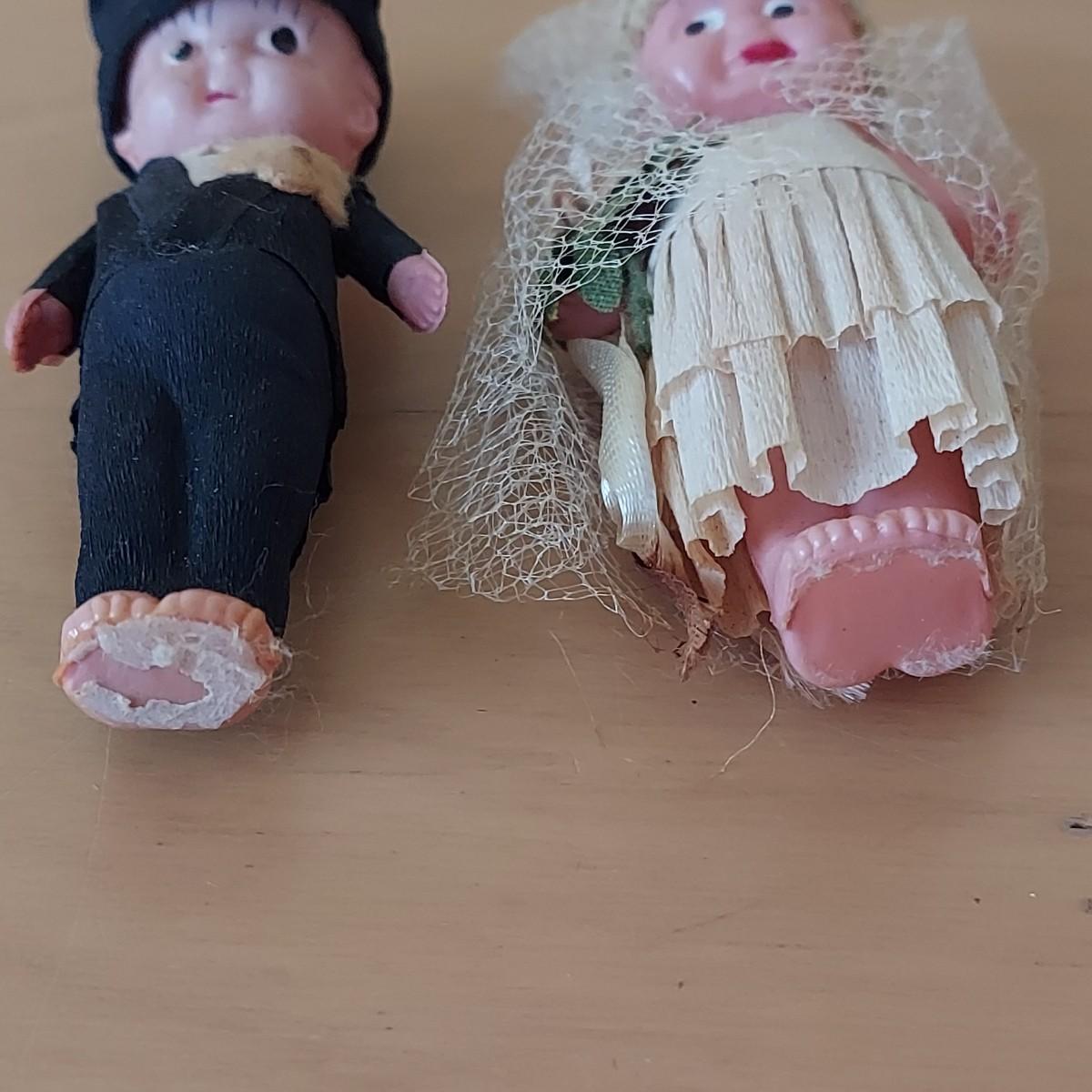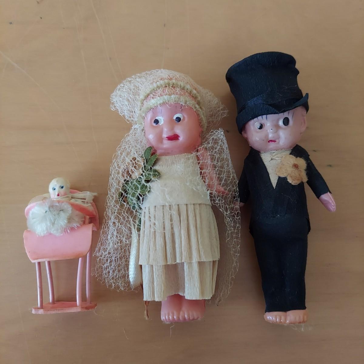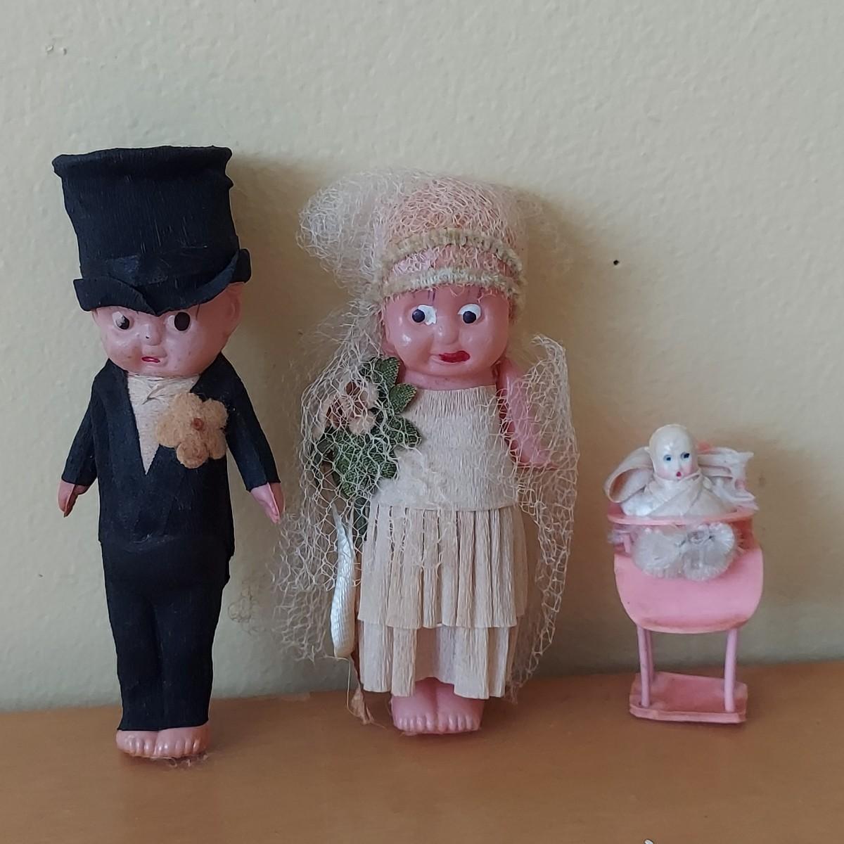 Lot contains a set of vintage cake toppers that appear to be celluloid bodies with paper clothing. The Kewpie style bride and groom are approximately 3.5"H. Also includes a baby. Please see photos for details. Shipping available