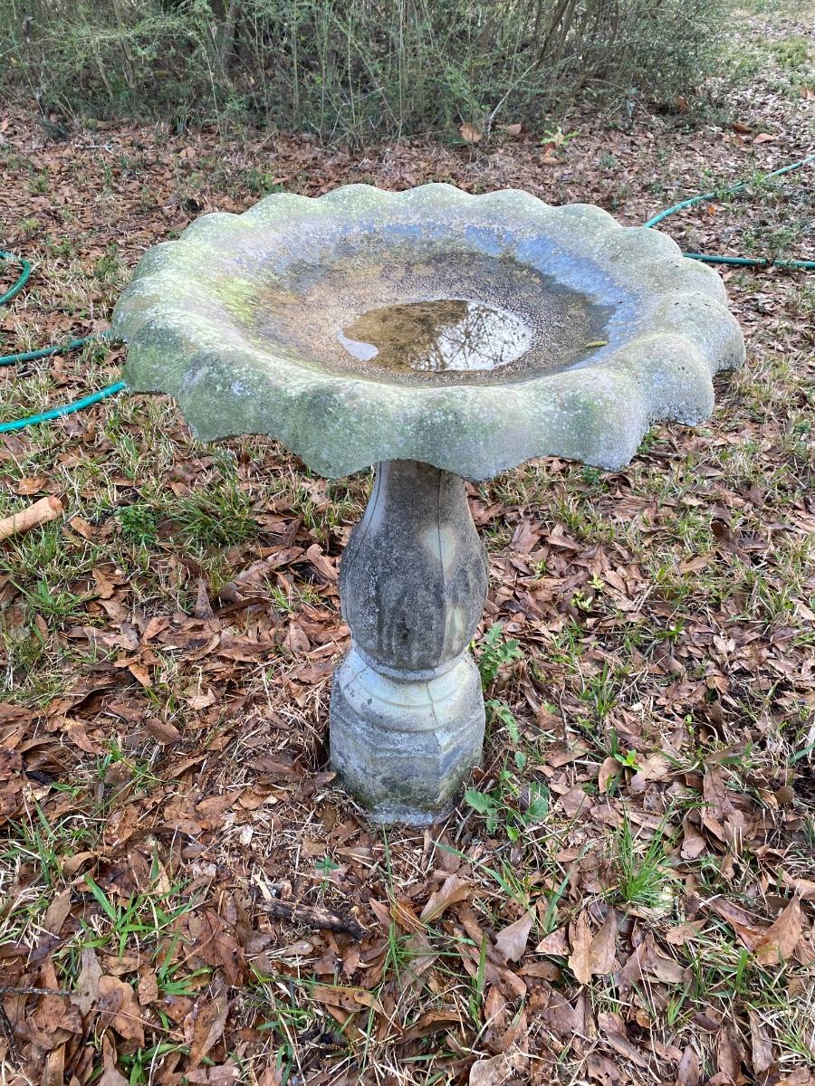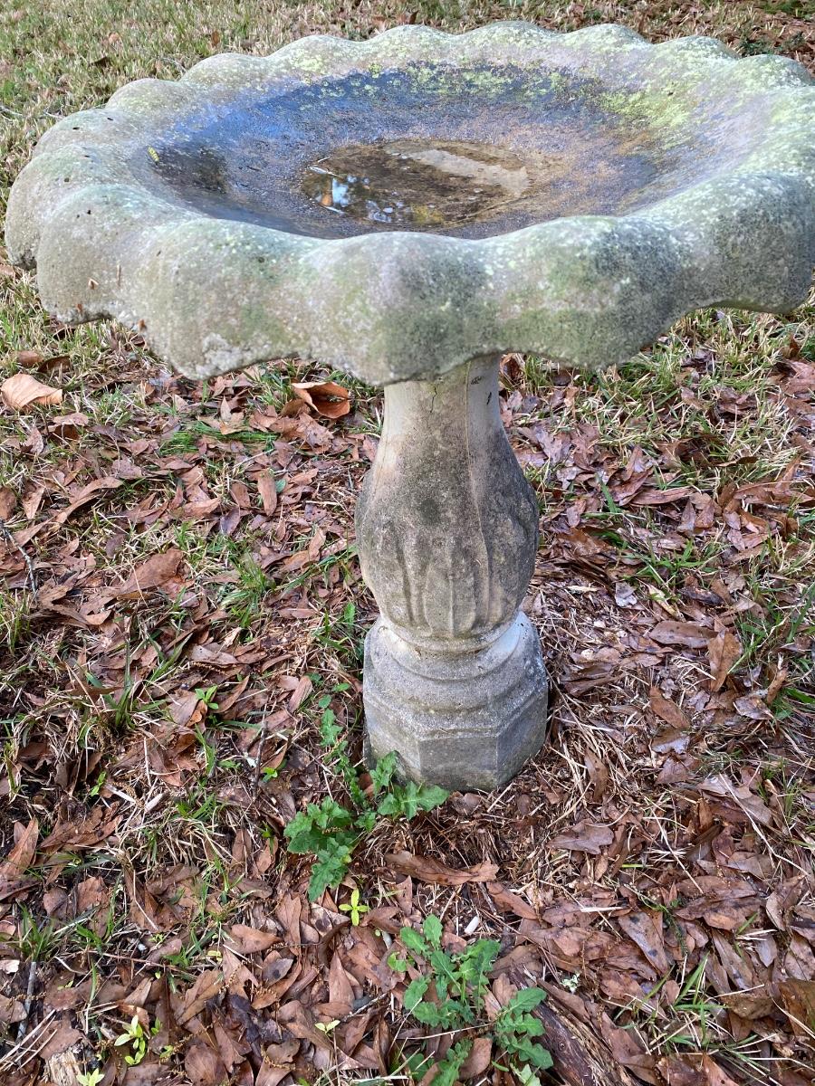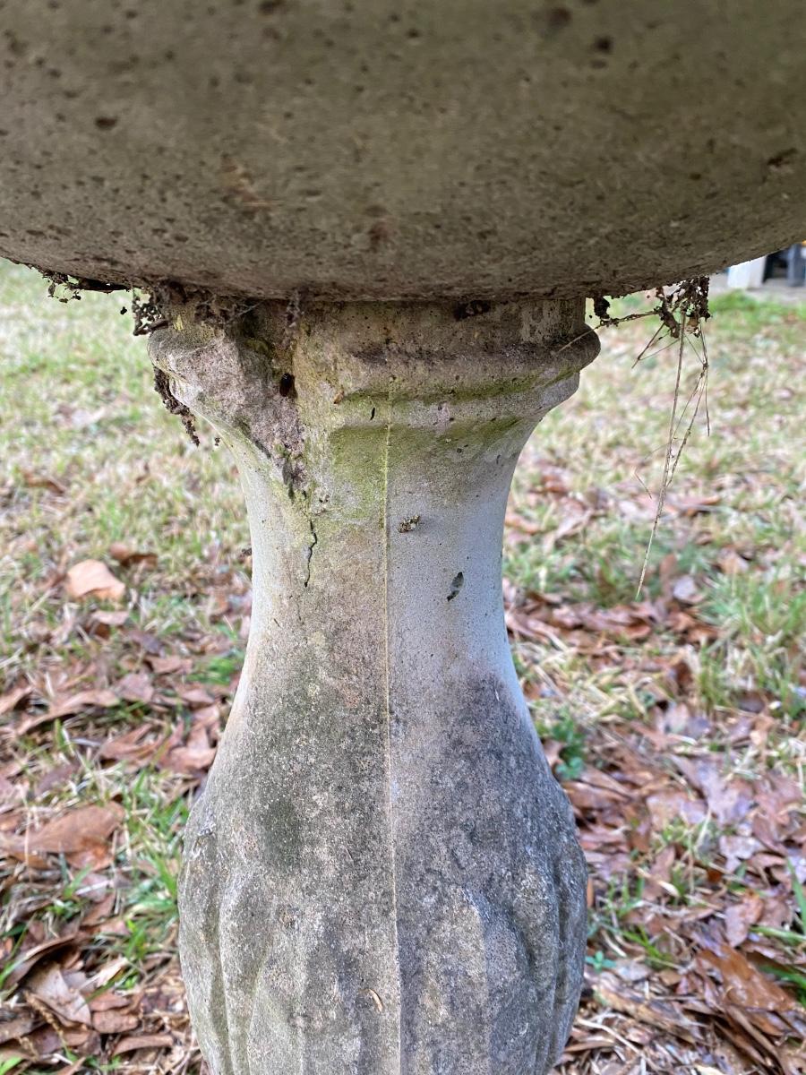 Vintage cement birdbath on pedestal. Top of pedestal has a chip that is not visible from above. Very heavy - Must bring help. Approx 29”h x 23”dia