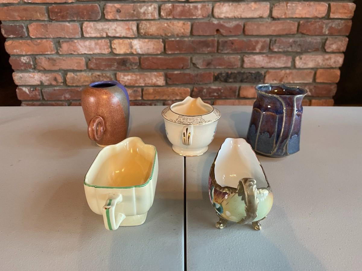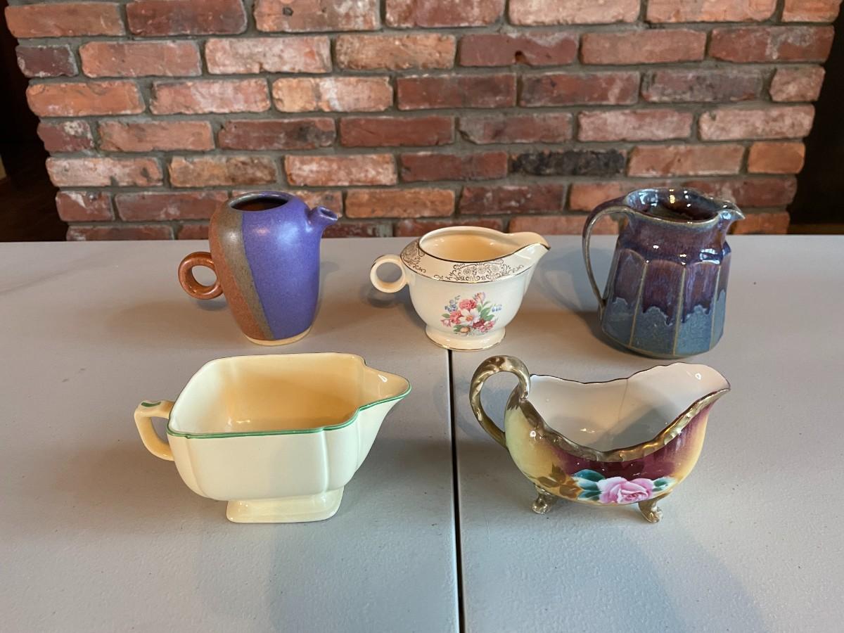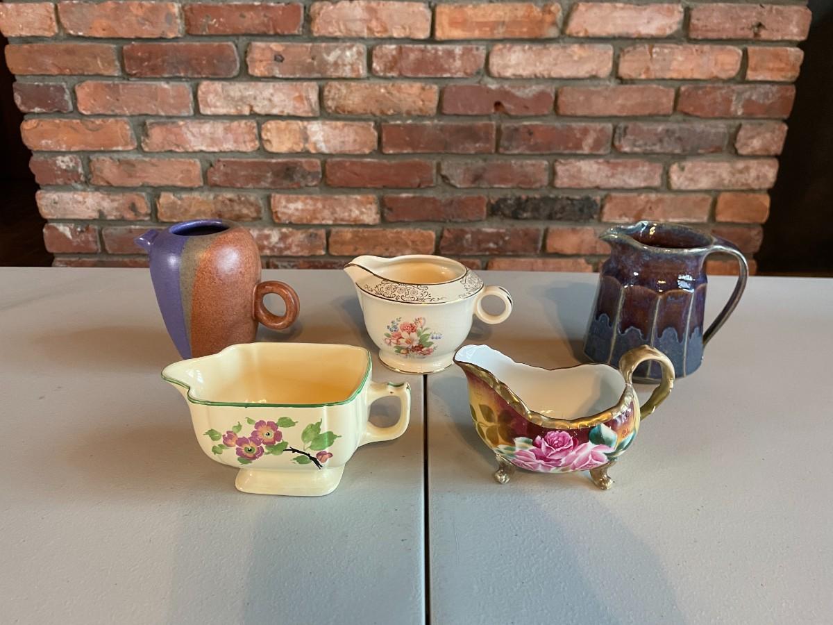 5 Pieces. Vintage Homer Laughlin creamer, Vintage 3 Footed creamer, Paden City creamer and pottery creamer’s. Blue and Purple Pitcher: 4 1/2W x 4 1/2H.