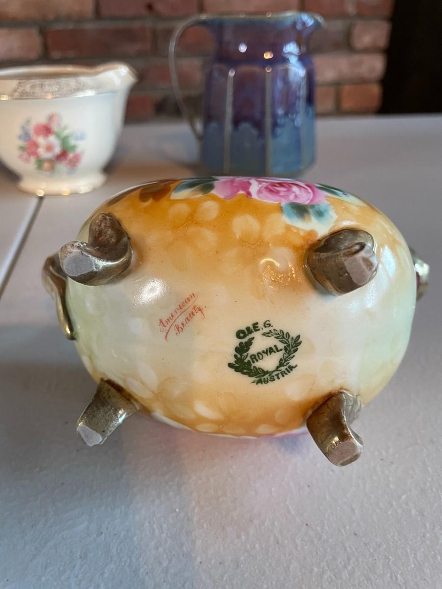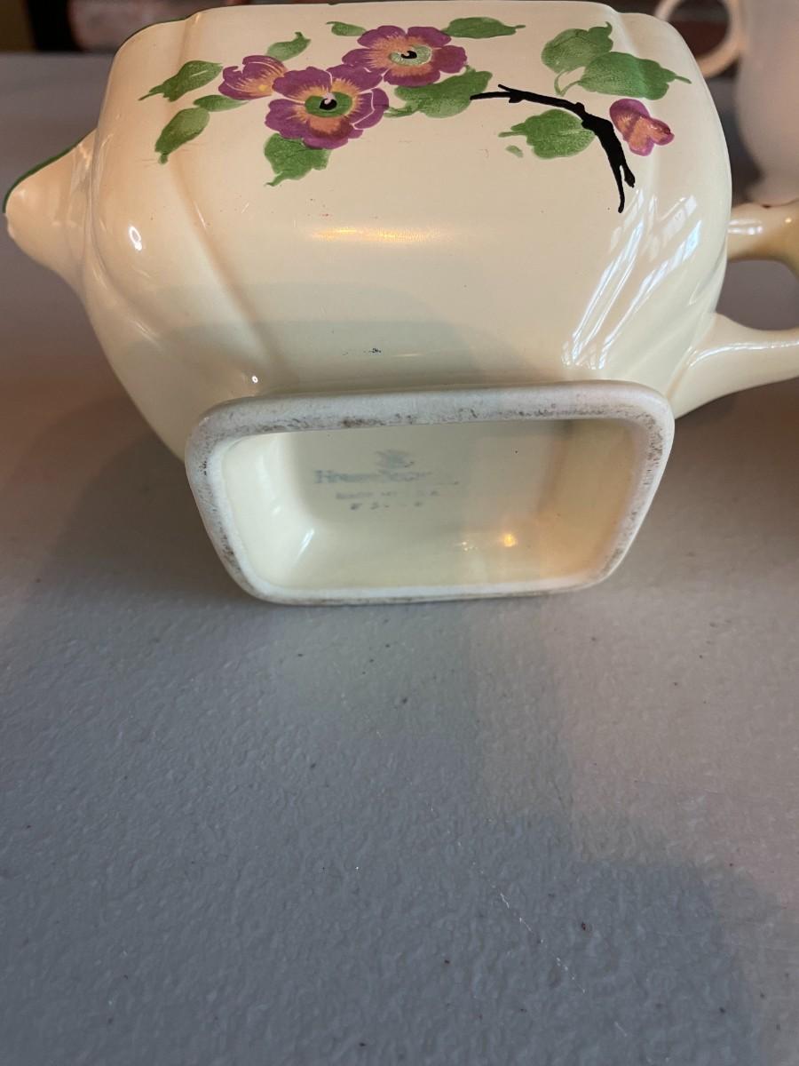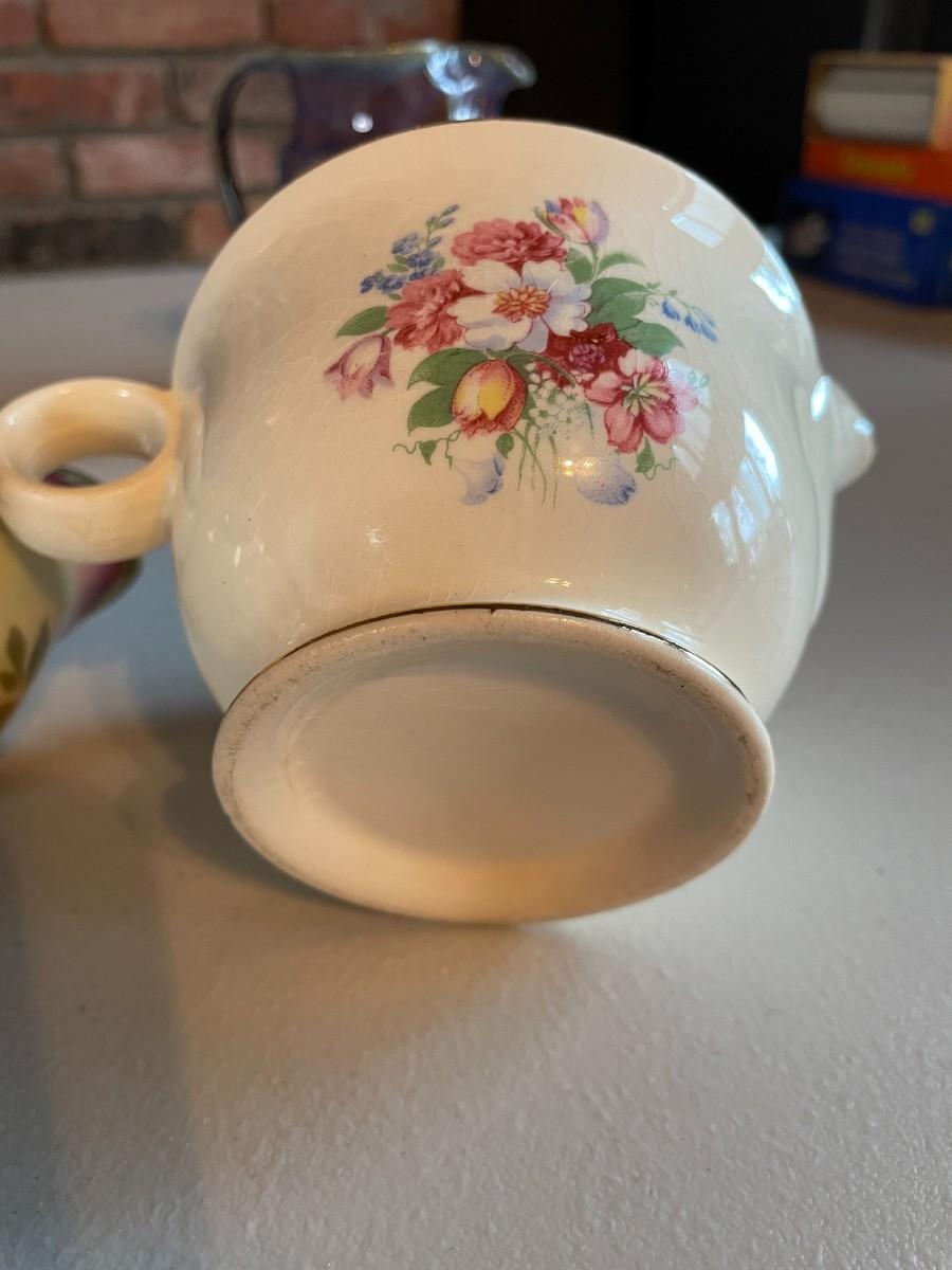 5 Pieces. Vintage Homer Laughlin creamer, Vintage 3 Footed creamer, Paden City creamer and pottery creamer’s. Blue and Purple Pitcher: 4 1/2W x 4 1/2H.
