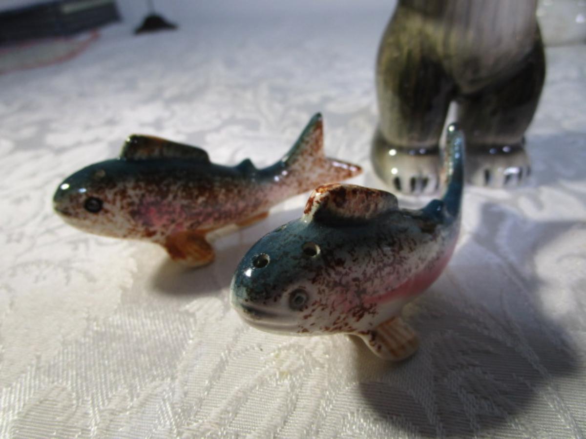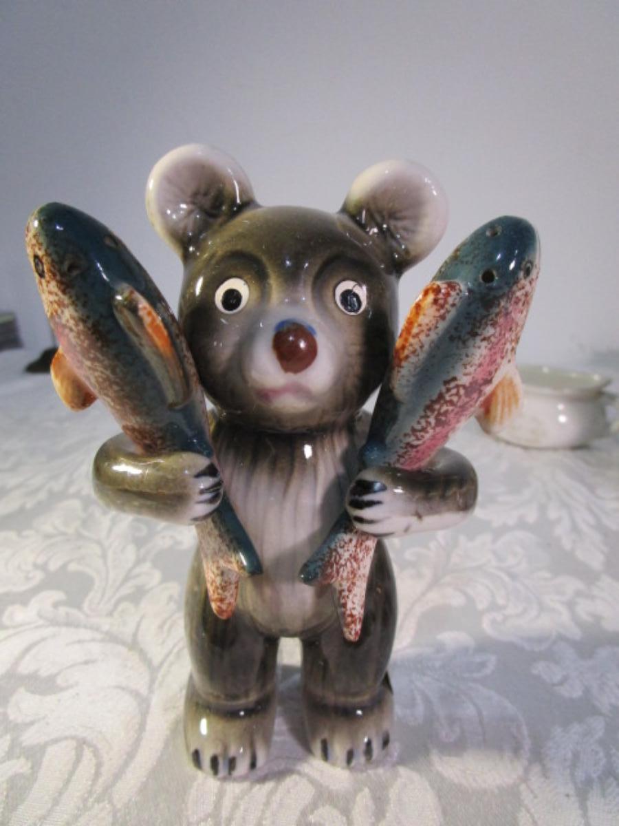 Vintage ceramic Bear & fishes salt & pepper shakers