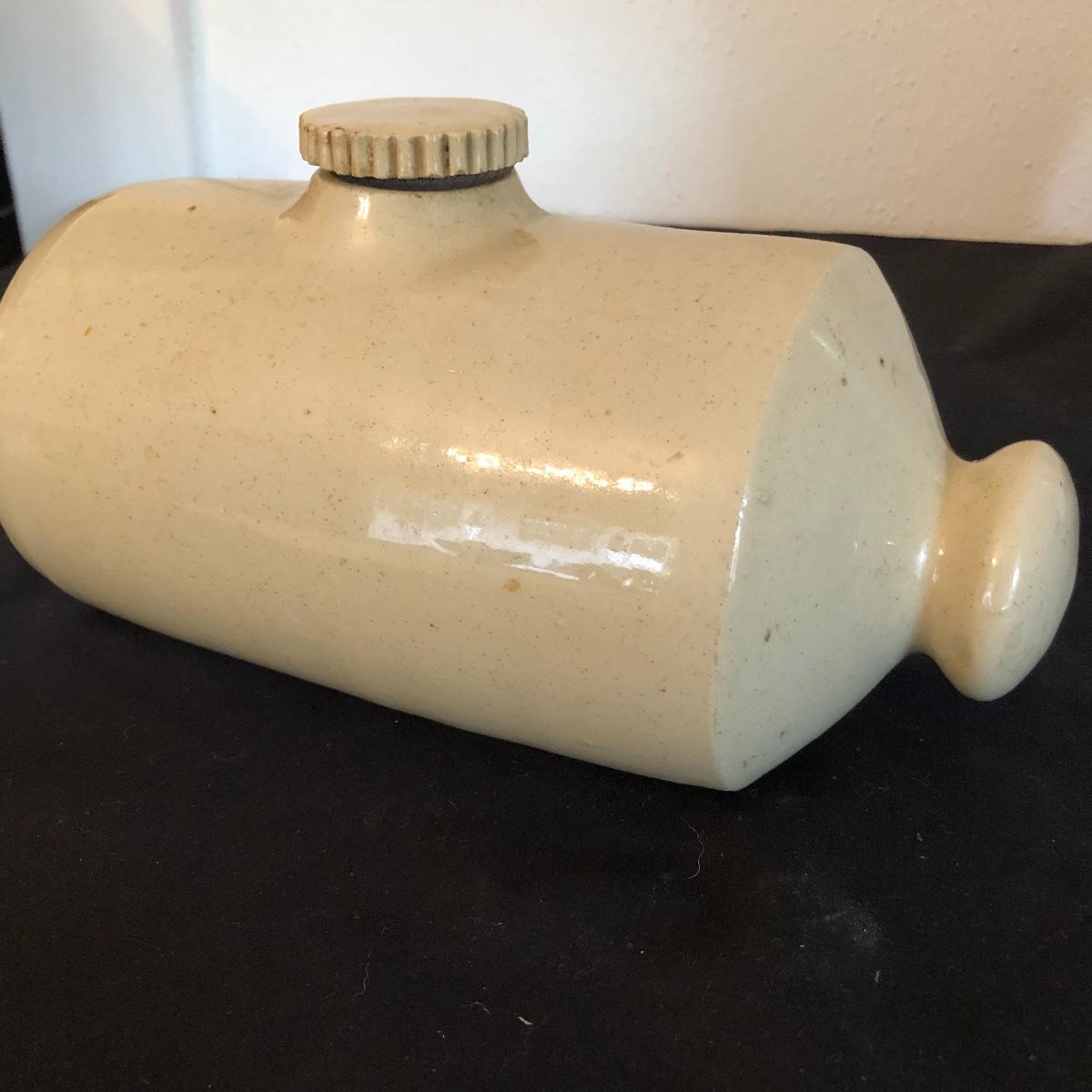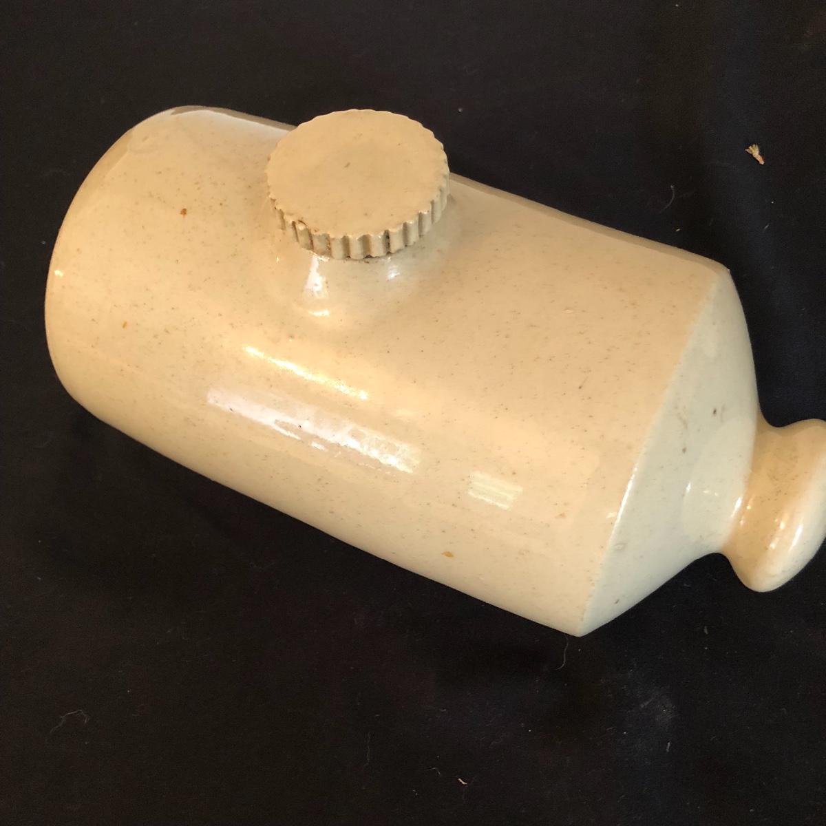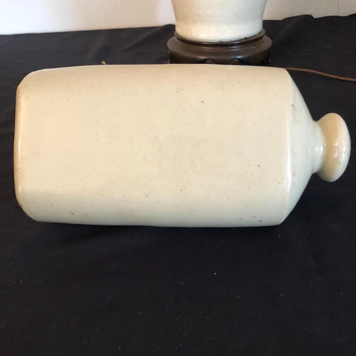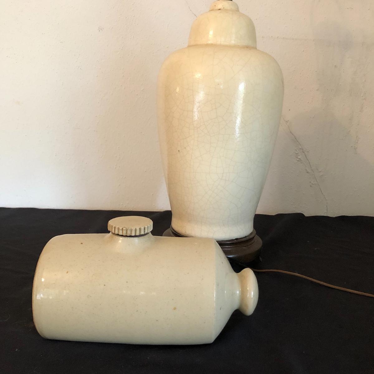 This vintage stoneware ceramic bed warmer is a buff color and in perfect condition. We have paired it with a cream ceramic lamp with a crazed glaze pattern on a wood foot that measures 27” tall.