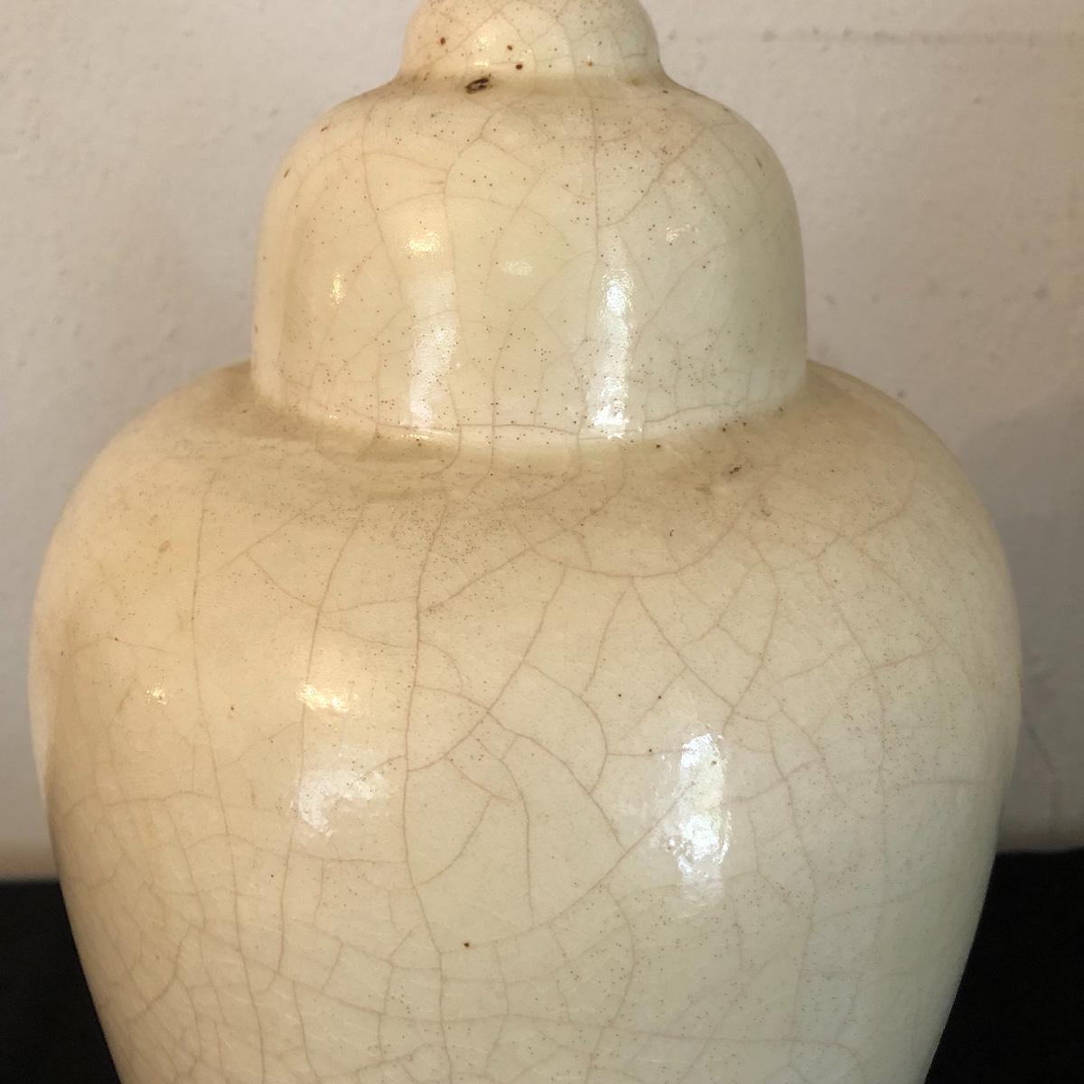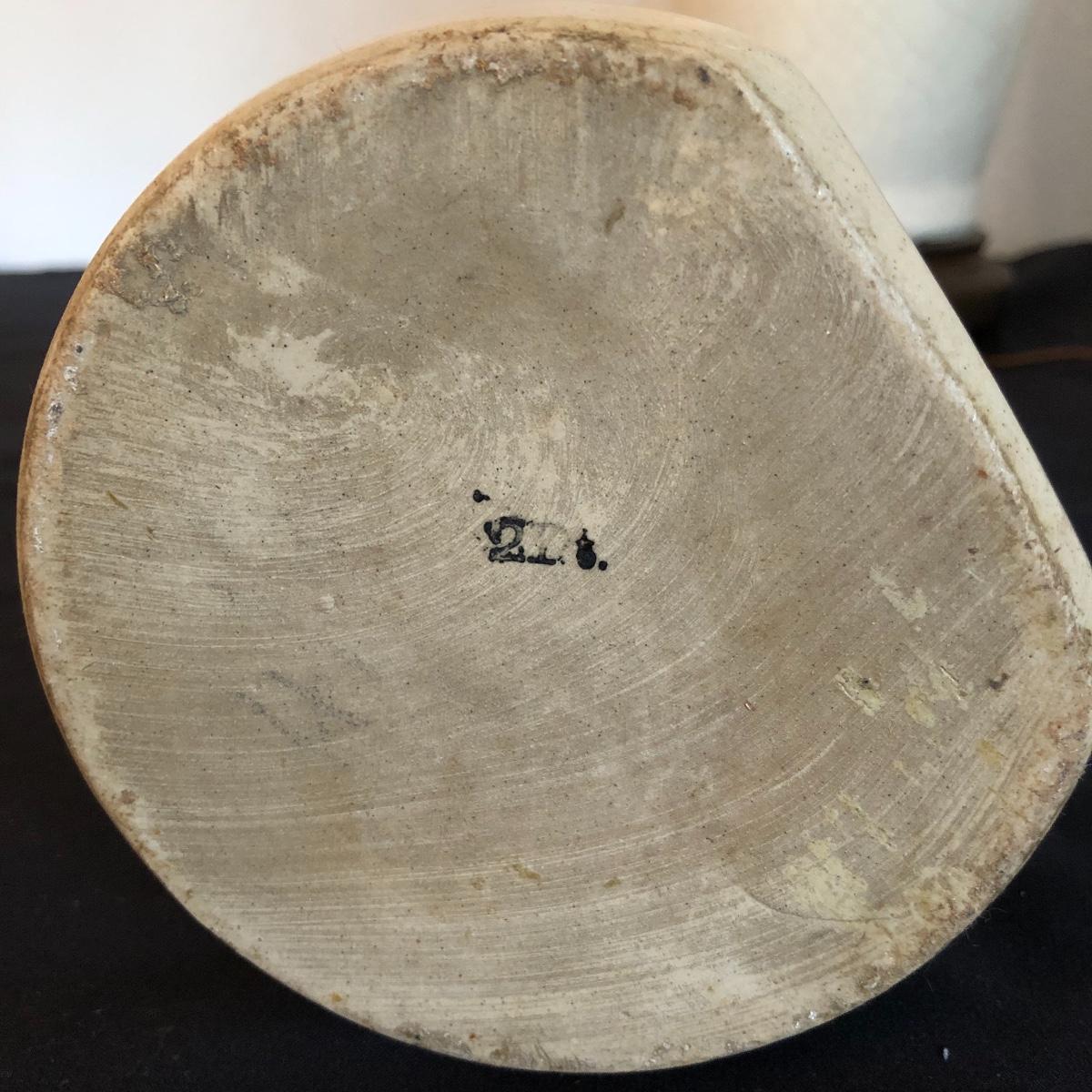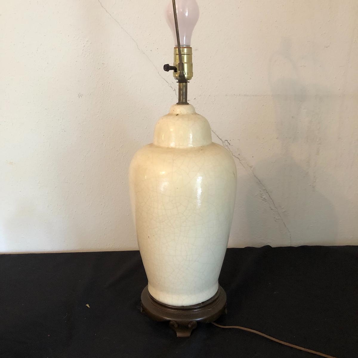 This vintage stoneware ceramic bed warmer is a buff color and in perfect condition. We have paired it with a cream ceramic lamp with a crazed glaze pattern on a wood foot that measures 27” tall.