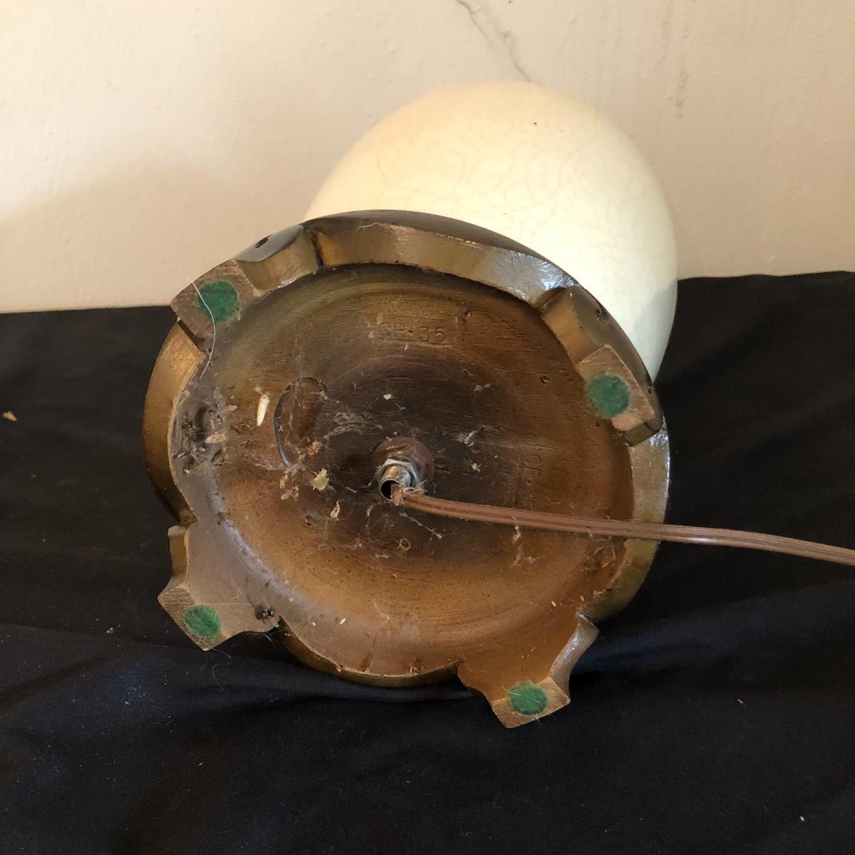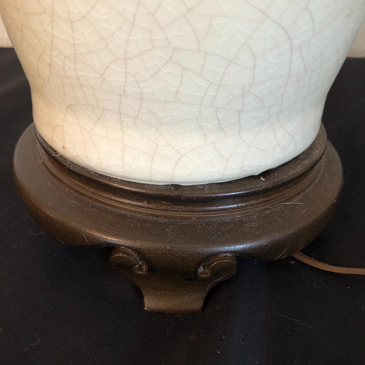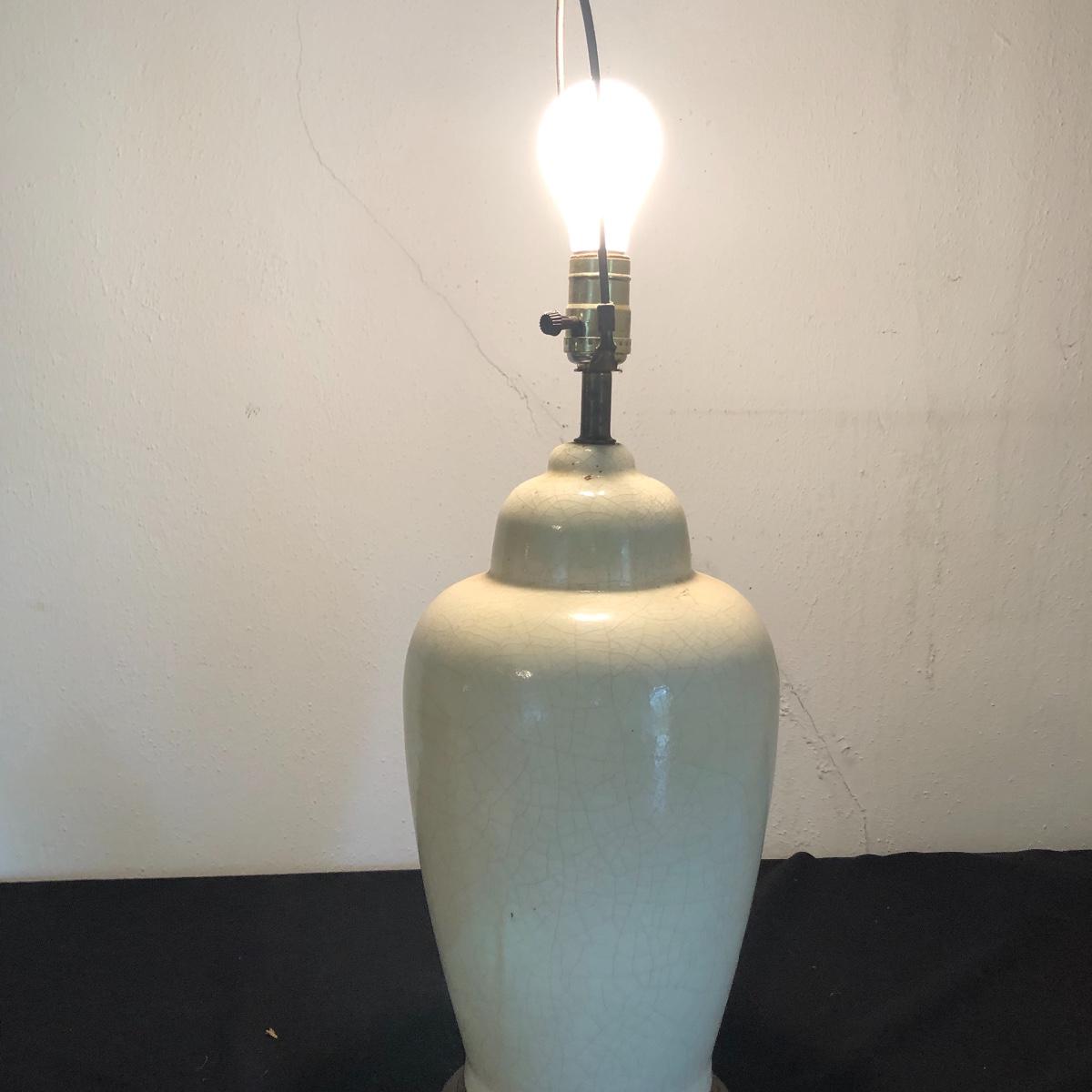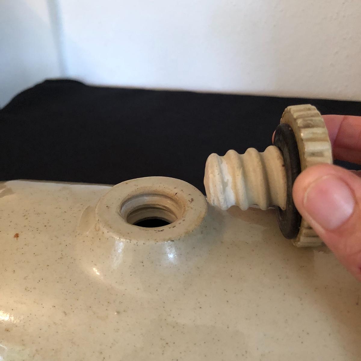 This vintage stoneware ceramic bed warmer is a buff color and in perfect condition. We have paired it with a cream ceramic lamp with a crazed glaze pattern on a wood foot that measures 27” tall.
