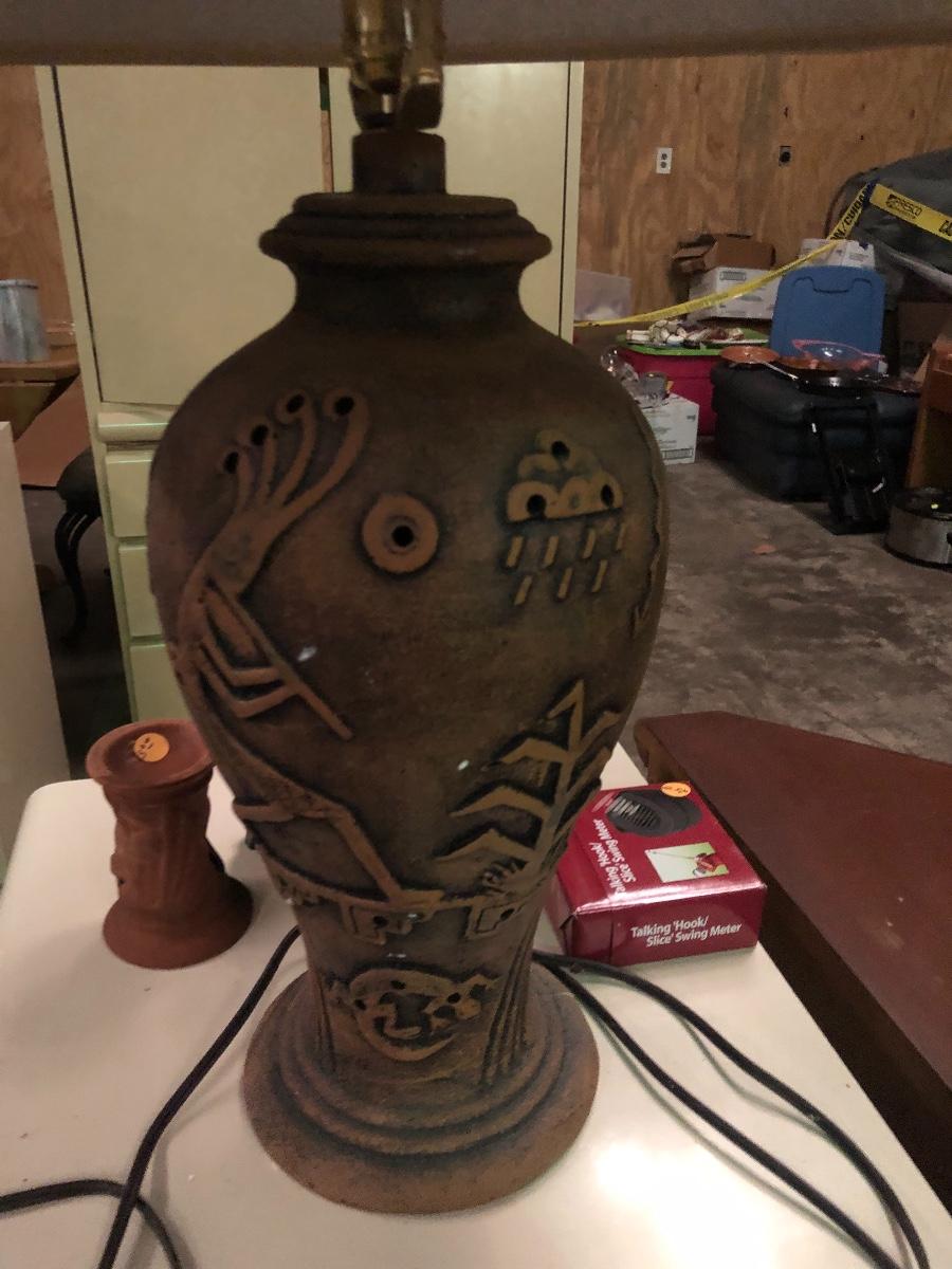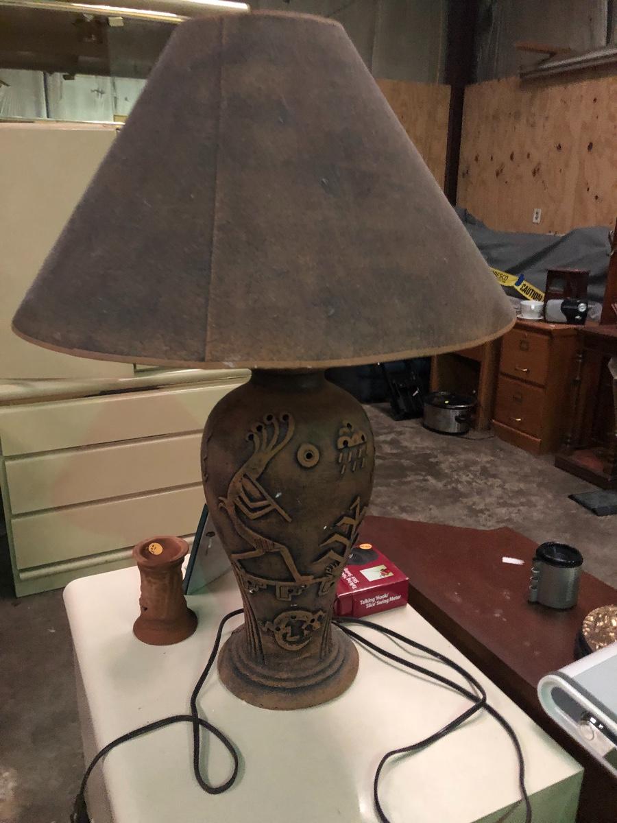 Nice large lamp and shade. Bottom is ceramic and lamp measures 31”