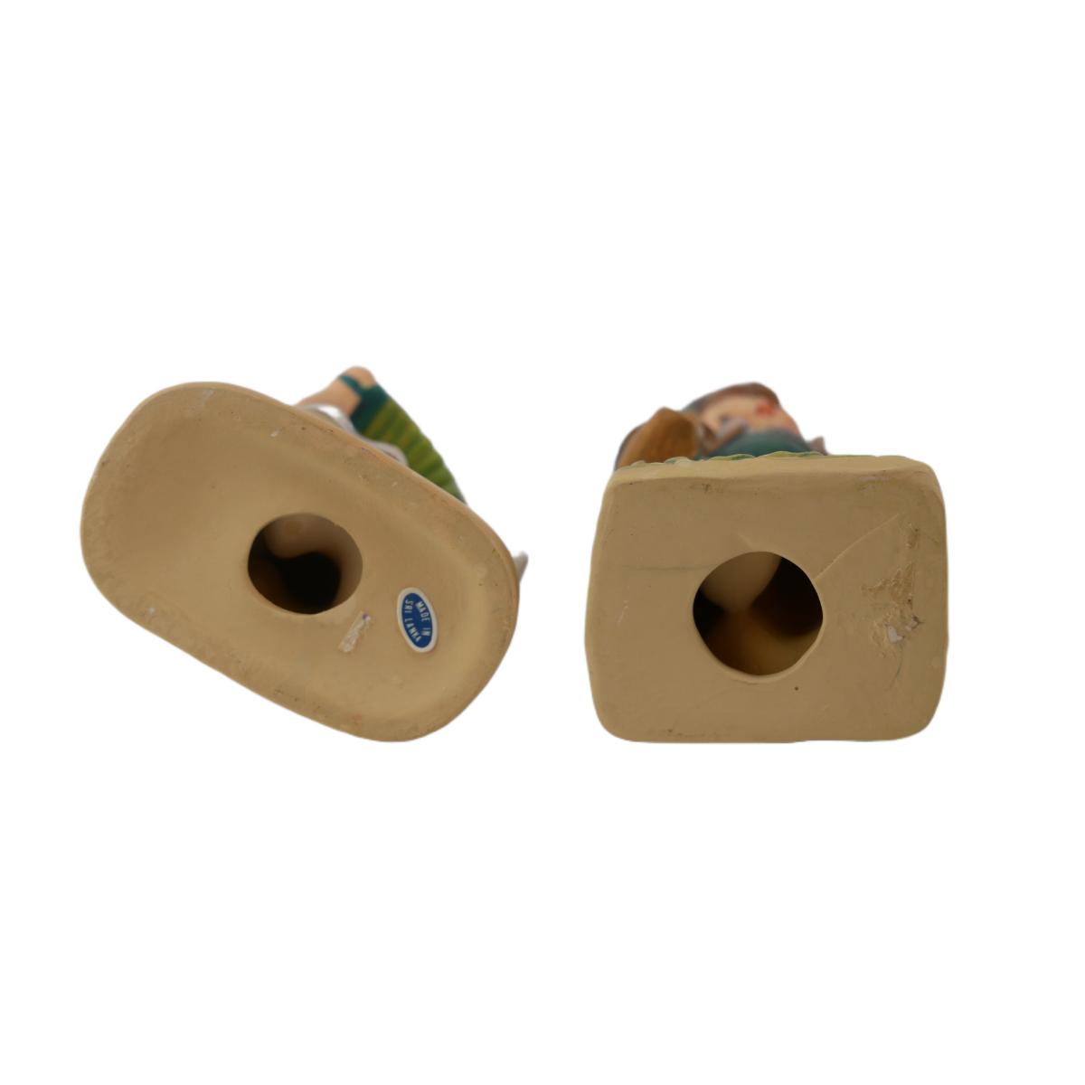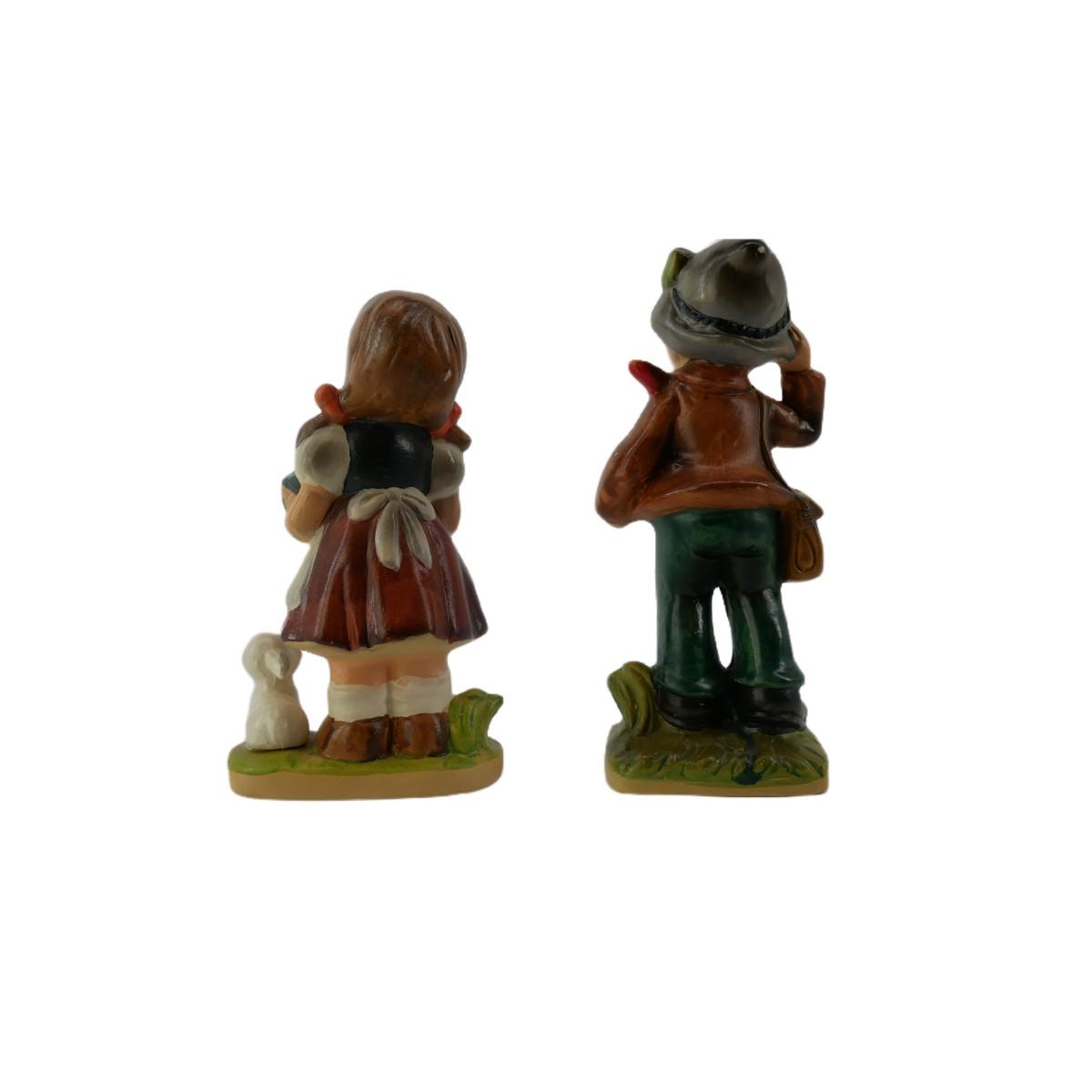 Vintage ceramic German style boy and girl figurines. Unmarked, made in Sri Lanka. Boy with hat and messenger bag and girl with accordian and baby sheep. Light chipping in paint, no major issues or flaws. Both in great condition. Each measures approximately L 2" x H 5.5". Weight of lot is 0.7 oz. (C40)