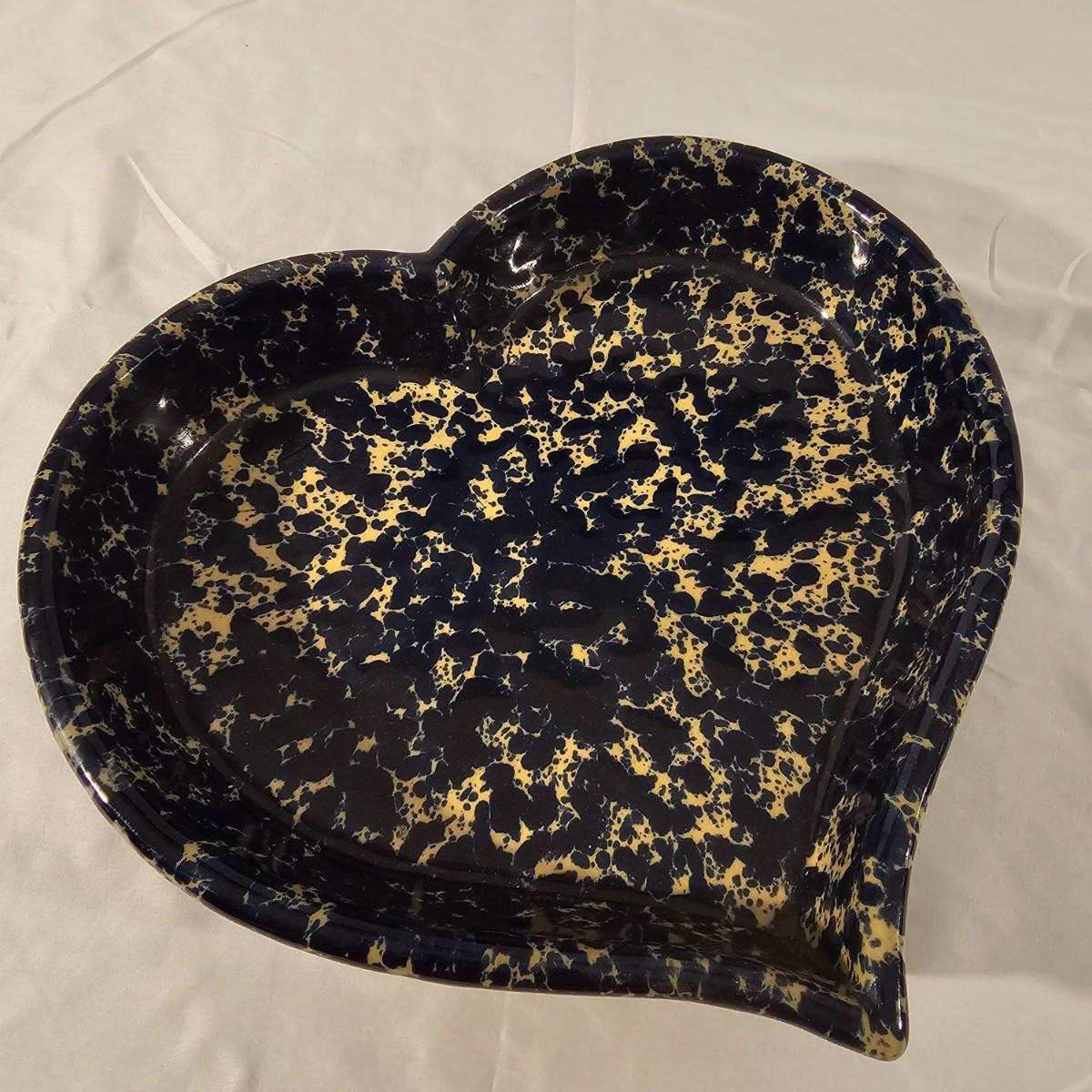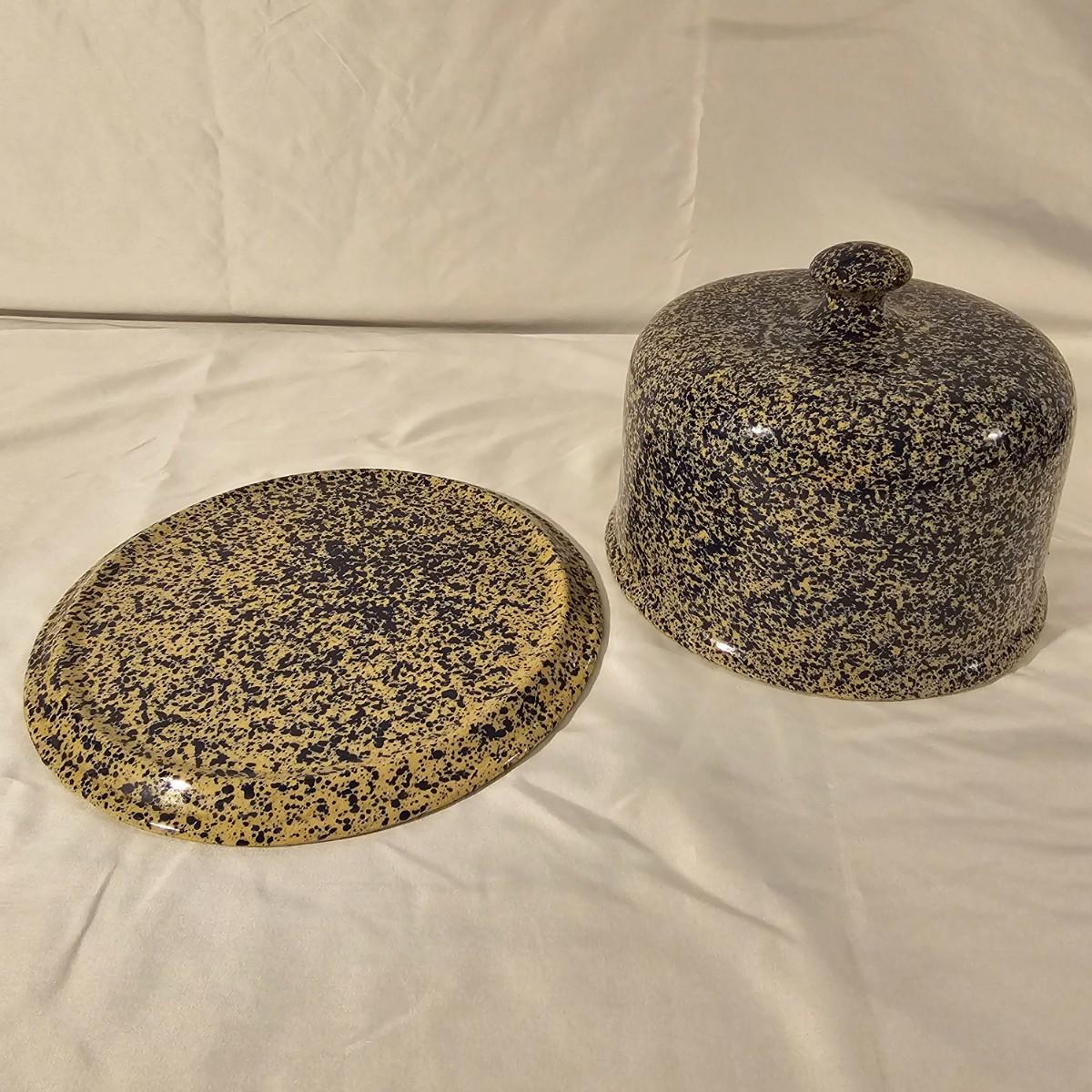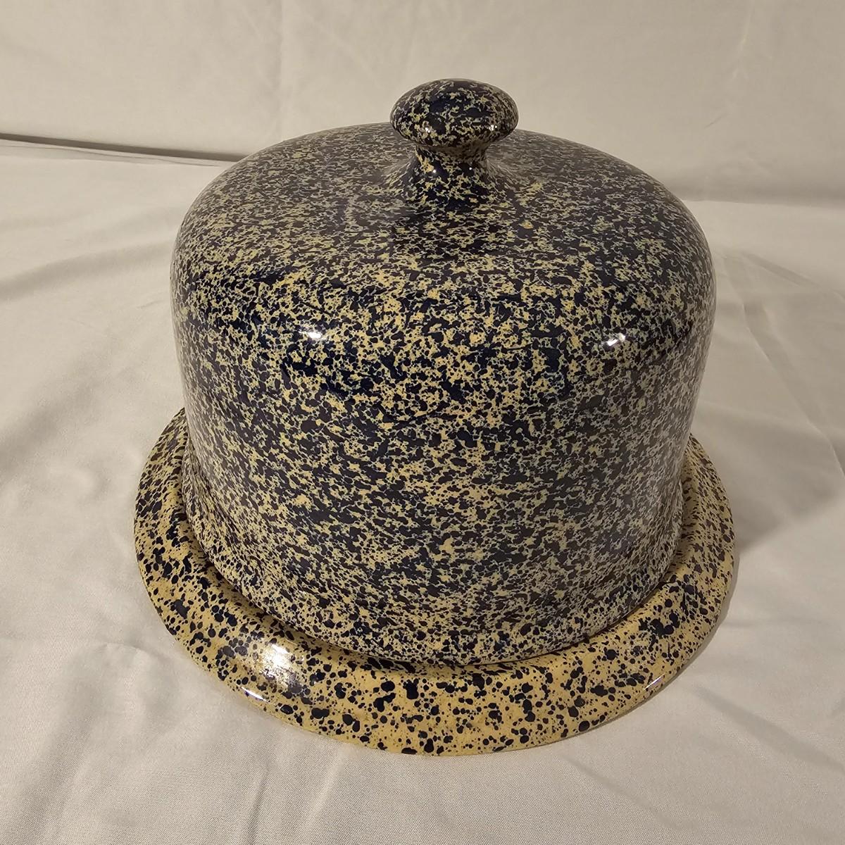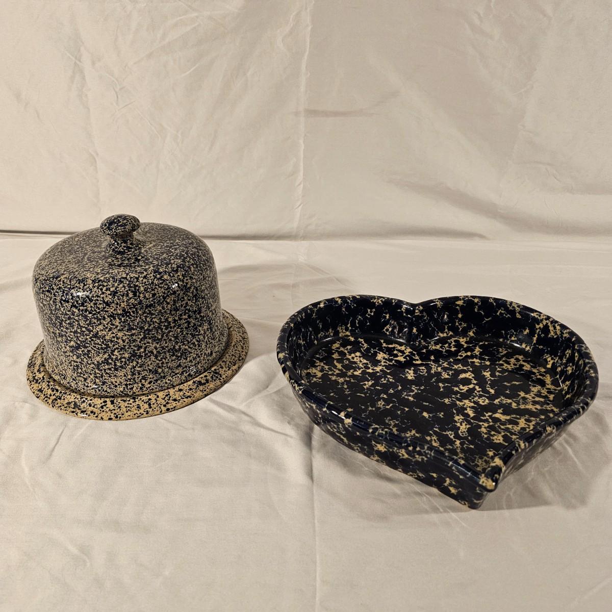 Speckled blue and white glazed on both of these pieces. Cheese dome has cover with knob on top, ridged base below. Stamped "Moira Pottery of England". This piece measures 9"D x 6"H. Heart shaped bowl is a bit deeper blue, has rolled lip edge and is stamped "Bennington Potters of Vermont". Heart measures 12" x 11" x 2"H. See photos for details. Shipping available.