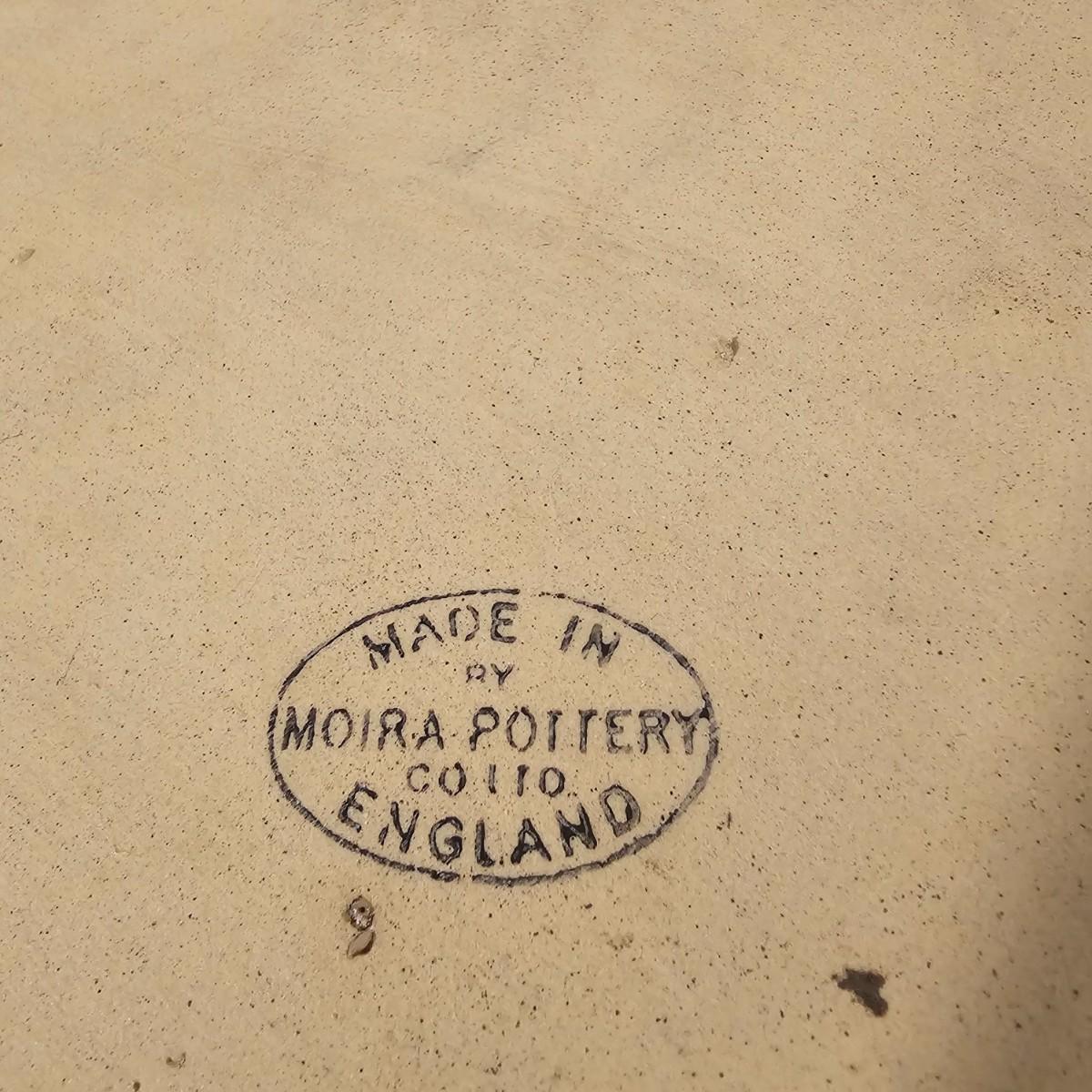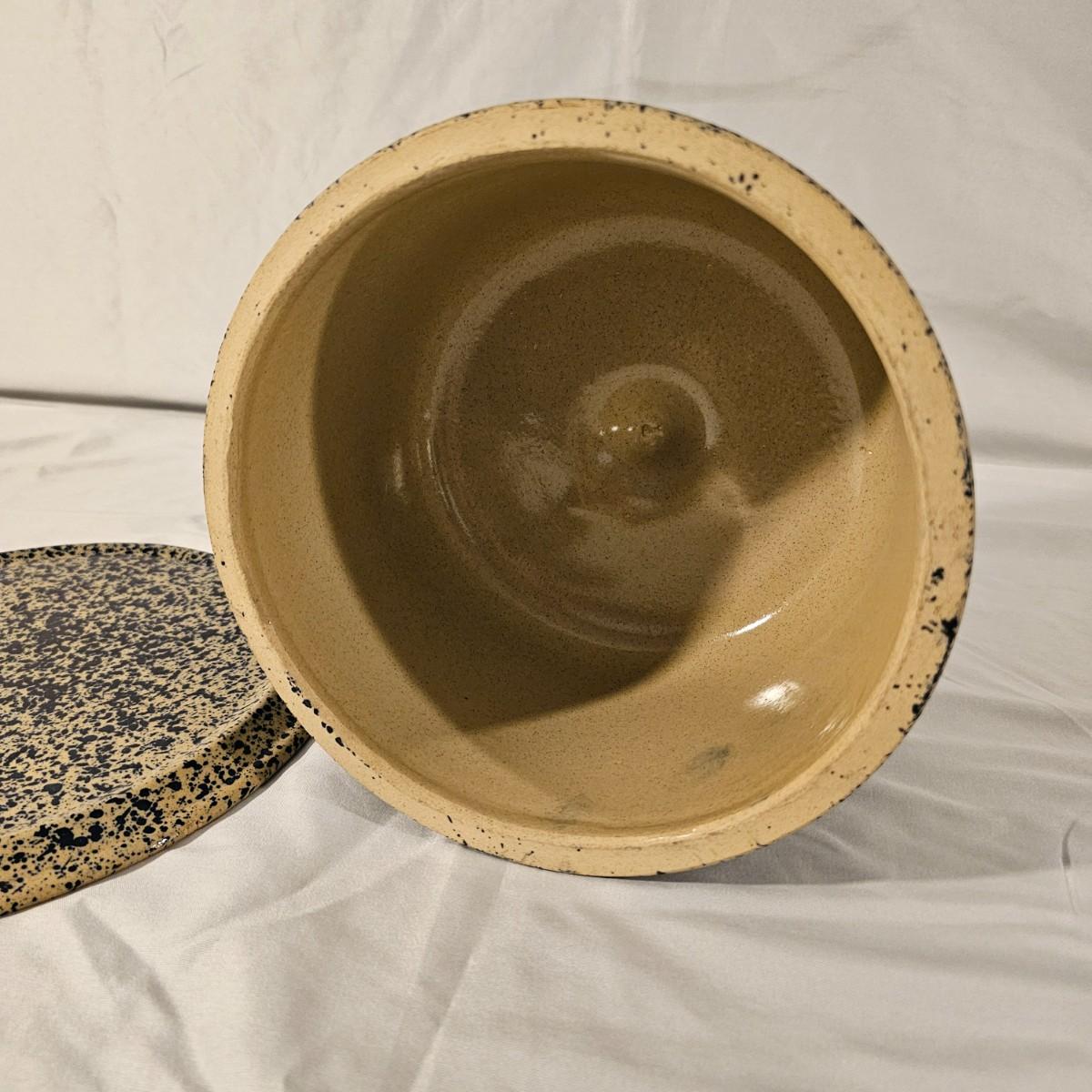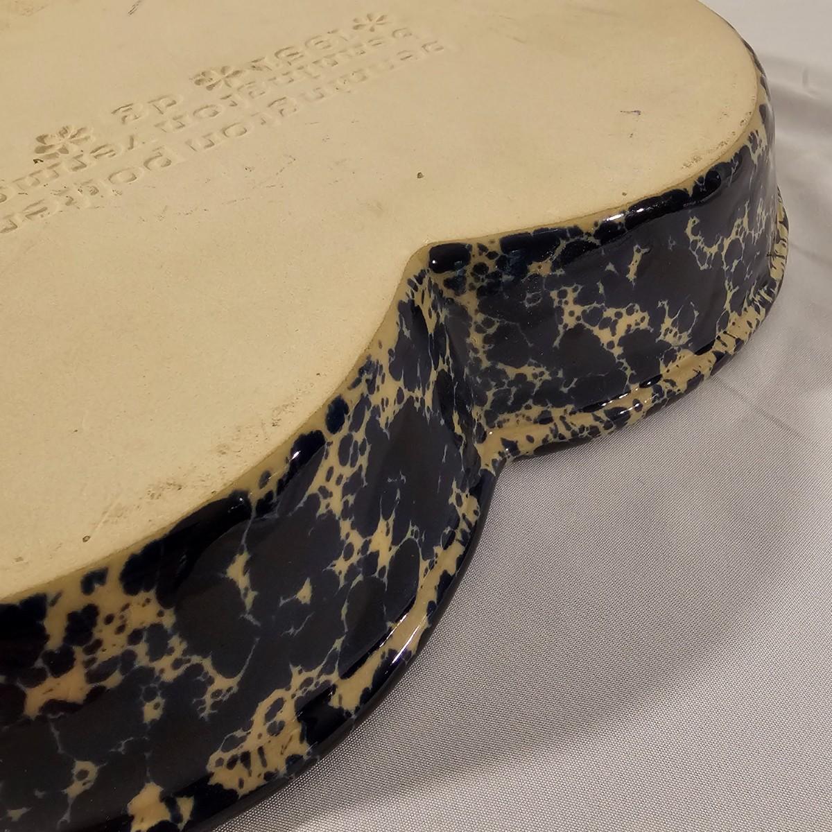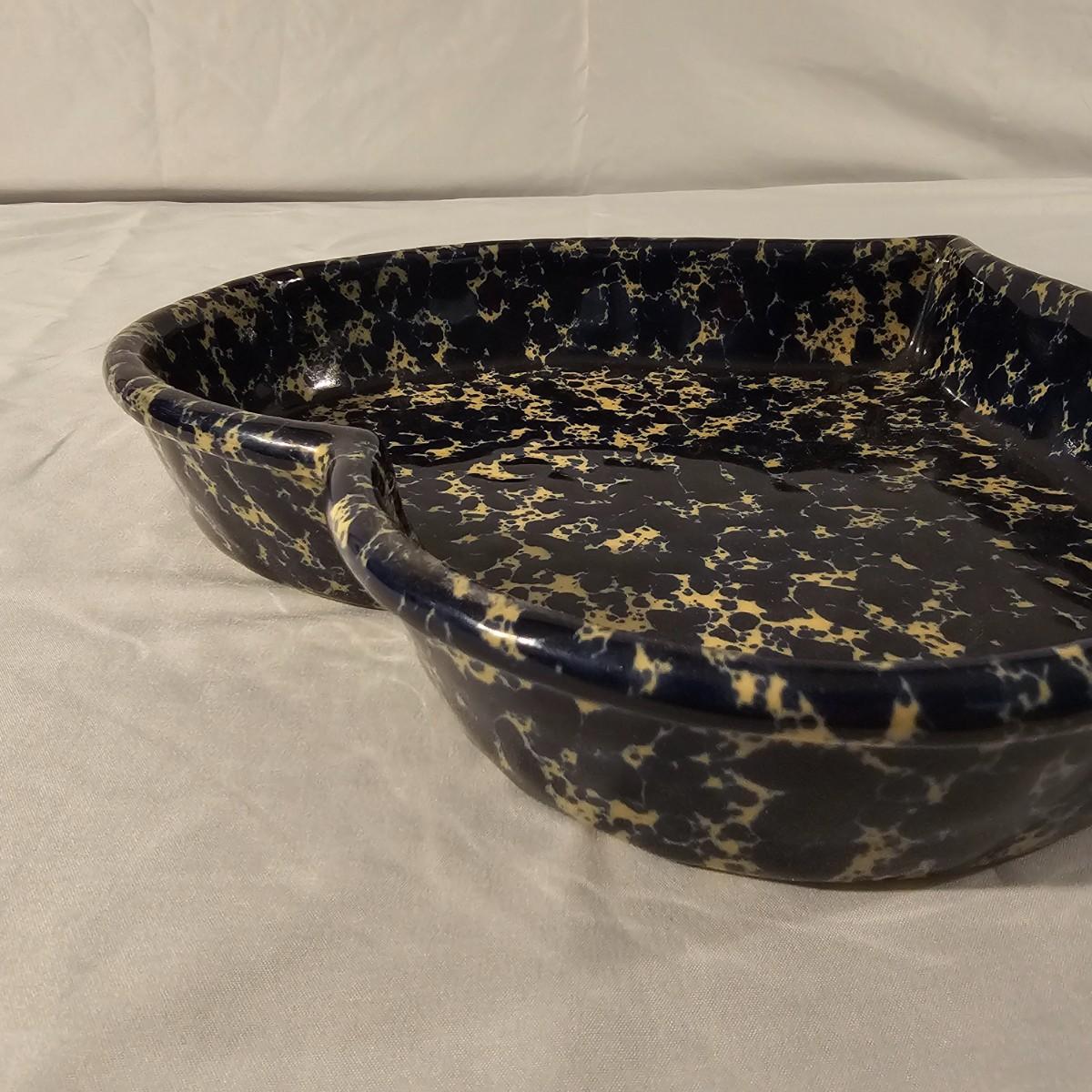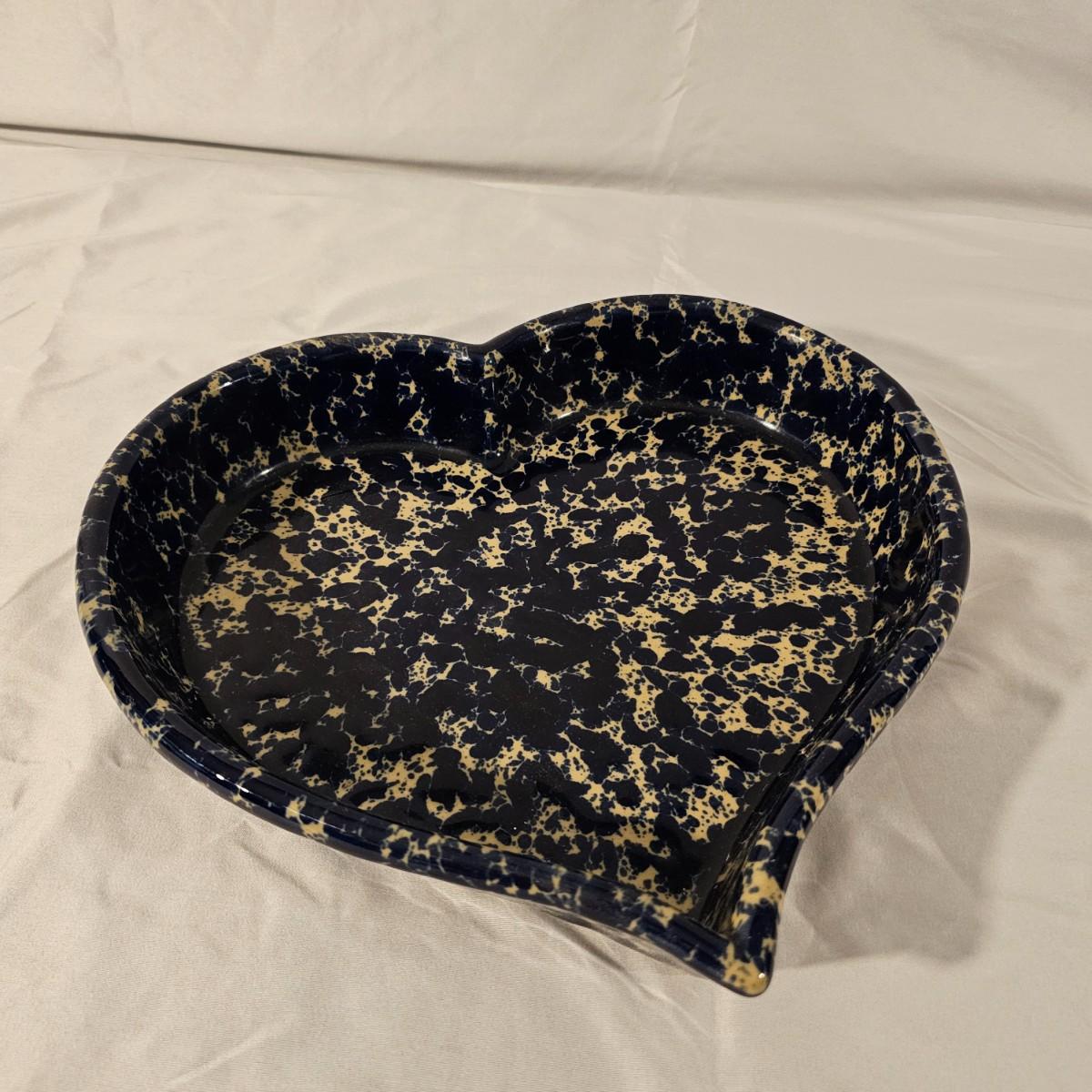 Speckled blue and white glazed on both of these pieces. Cheese dome has cover with knob on top, ridged base below. Stamped "Moira Pottery of England". This piece measures 9"D x 6"H. Heart shaped bowl is a bit deeper blue, has rolled lip edge and is stamped "Bennington Potters of Vermont". Heart measures 12" x 11" x 2"H. See photos for details. Shipping available.