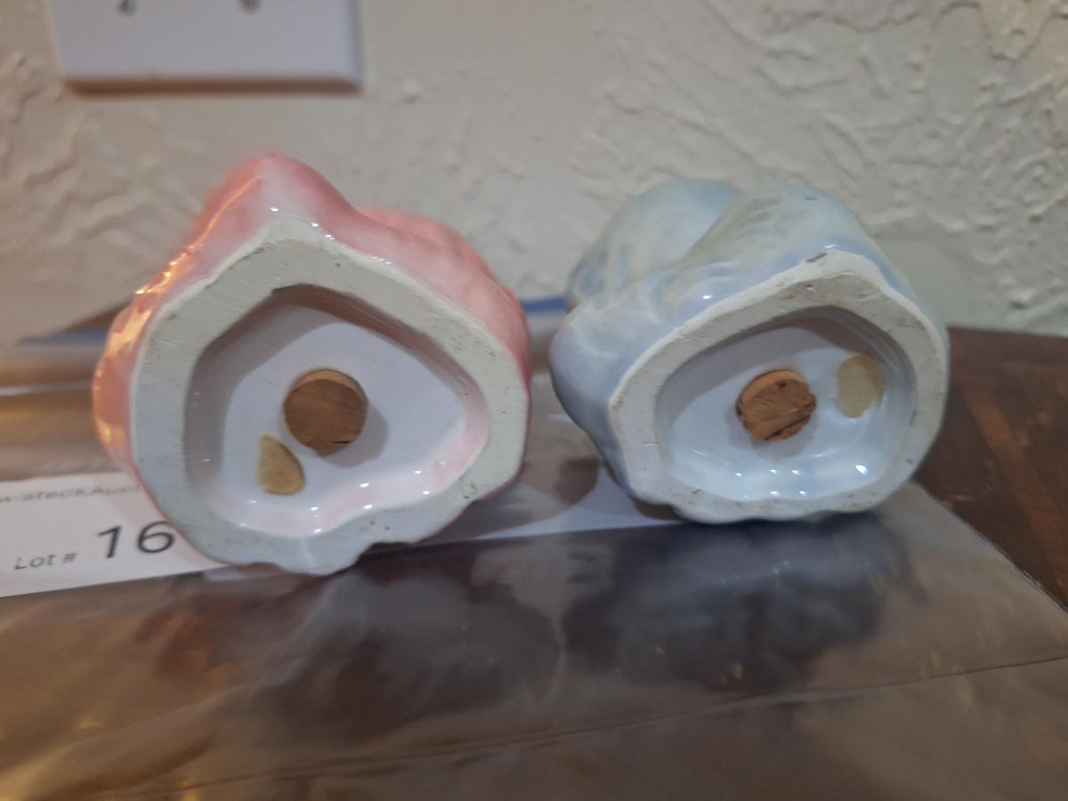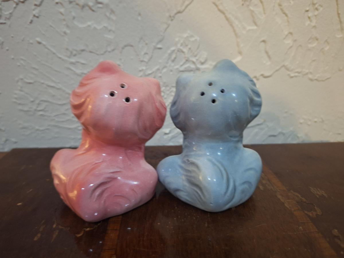 vintage ceramic cat salt and pepper shakers, one pink and one blue gray cat.