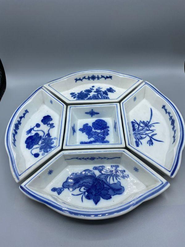 Vintage ceramic 5 piece vegetable dip tray set. Made in the People's Republic of China. White with a blue floral design, each piece has a different image. Use the pieces together or separate. Together it measures about 15" across. Good condition.