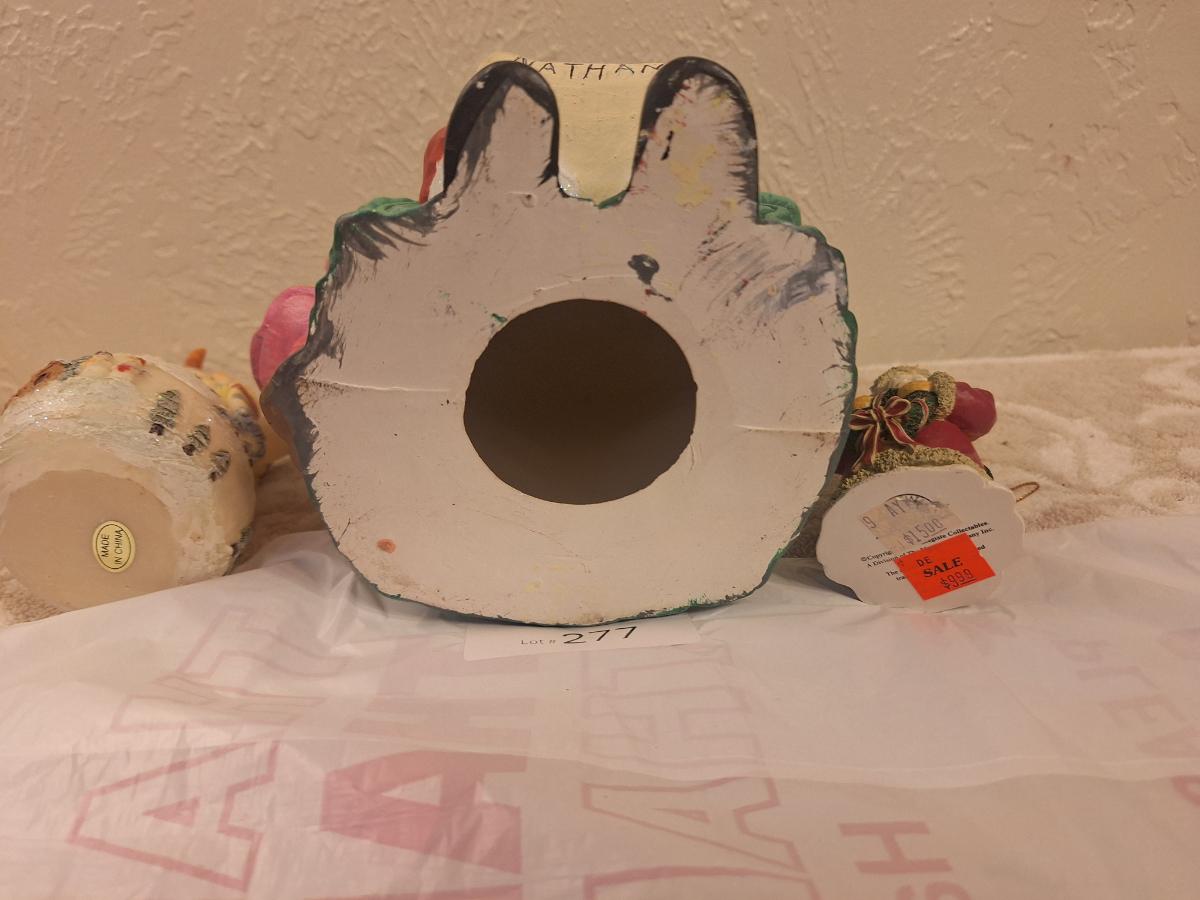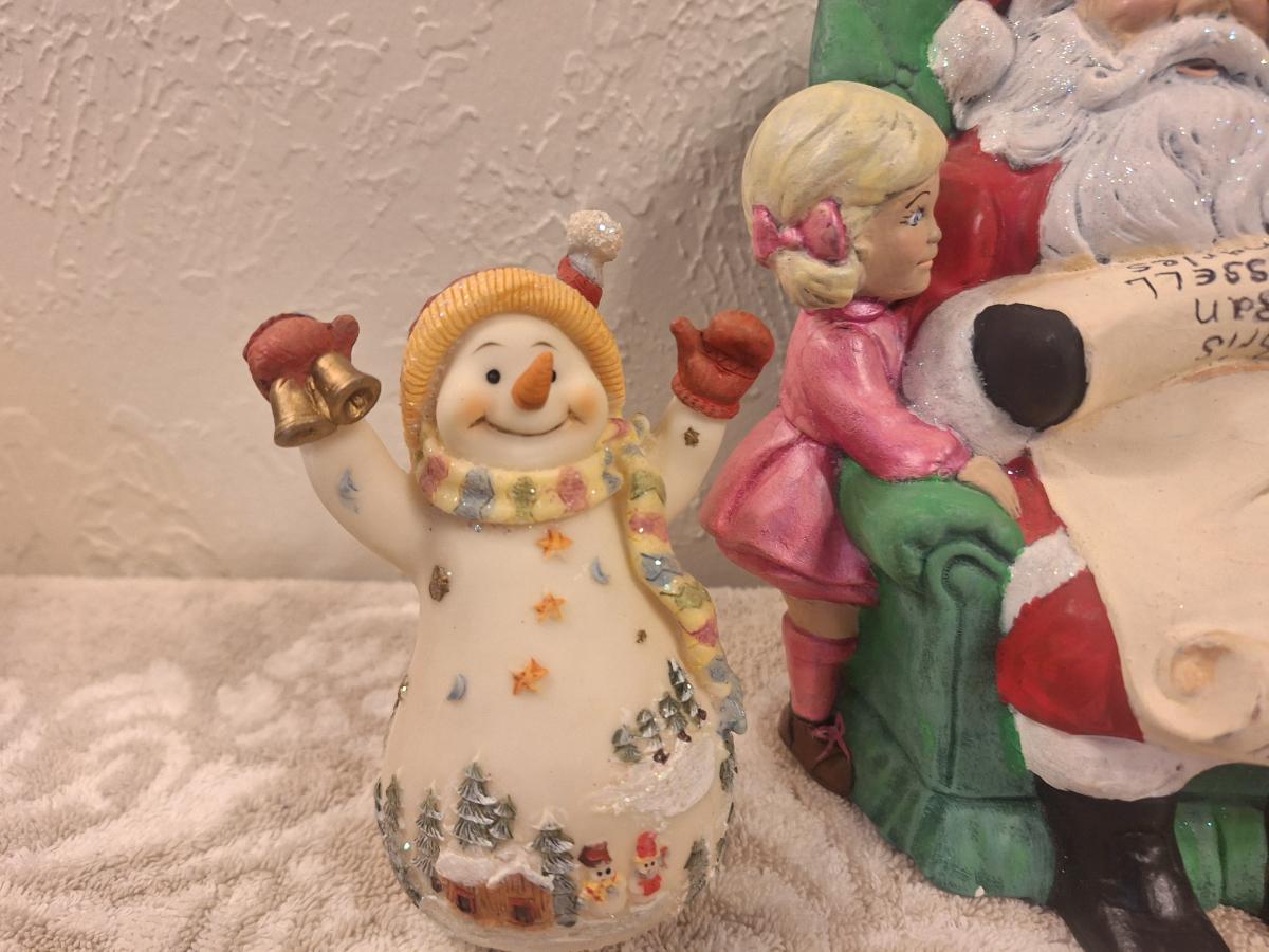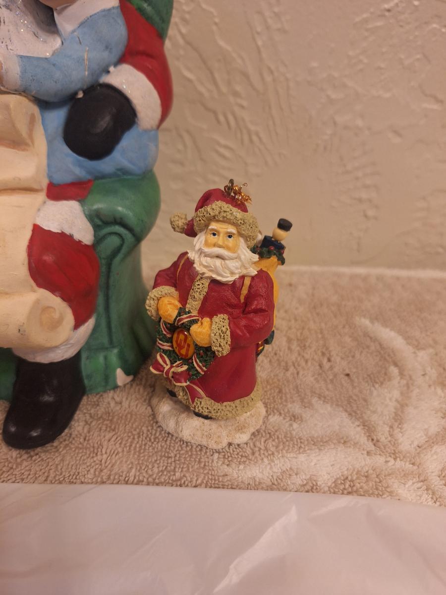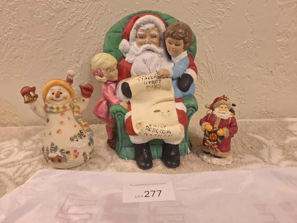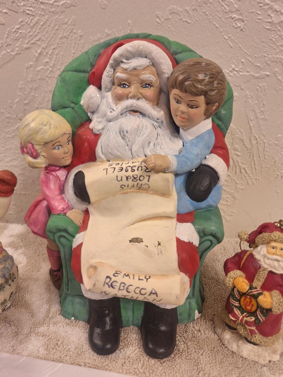vintage ceramic Christmas figurine of Santa with two kids, and then two smaller Christmas items