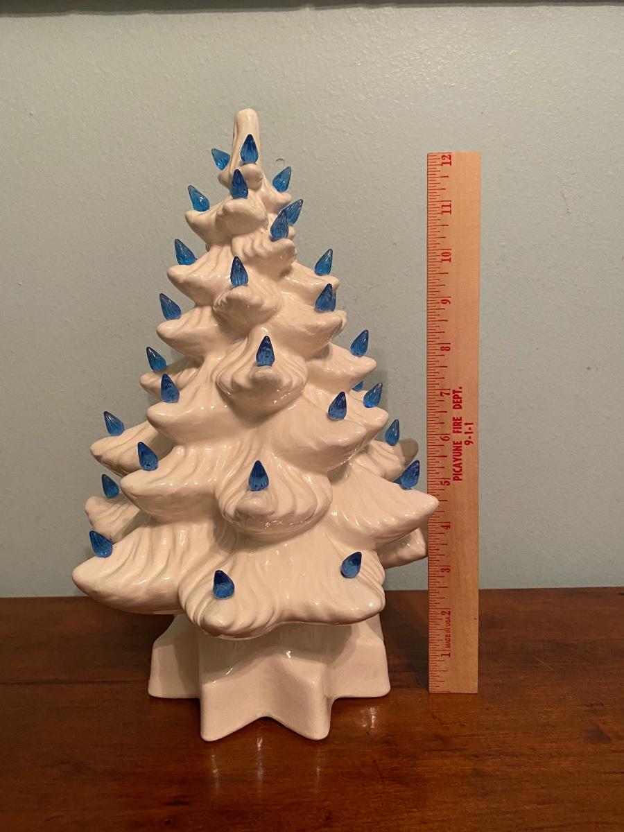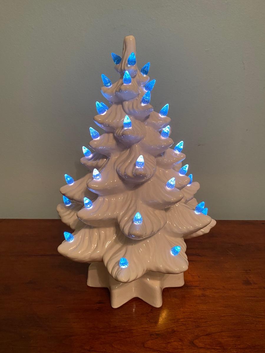 Vintage 1994 ceramic Christmas tree, white with blue lights, handmade. The tree topper light is missing. Otherwise in very good condition