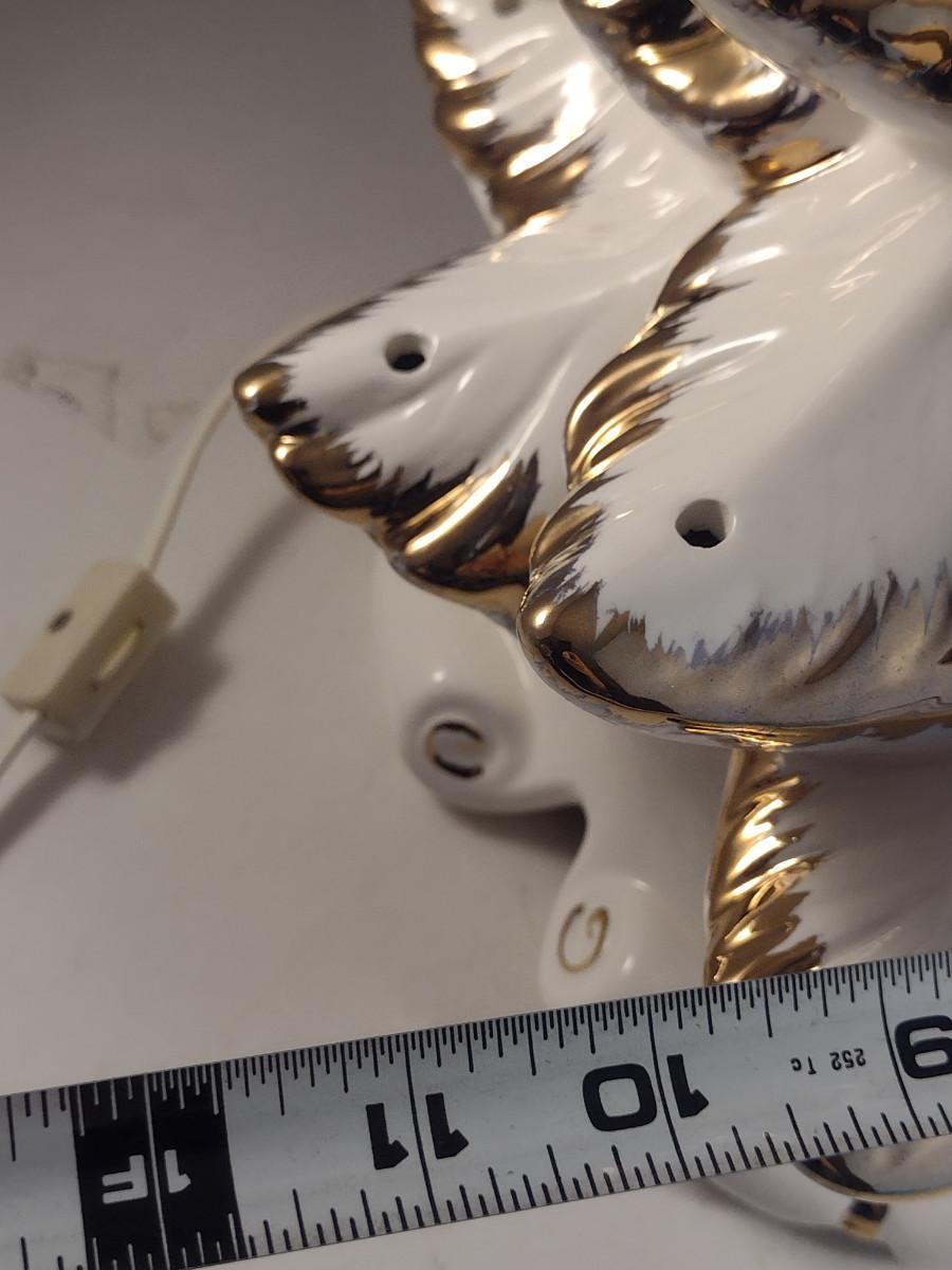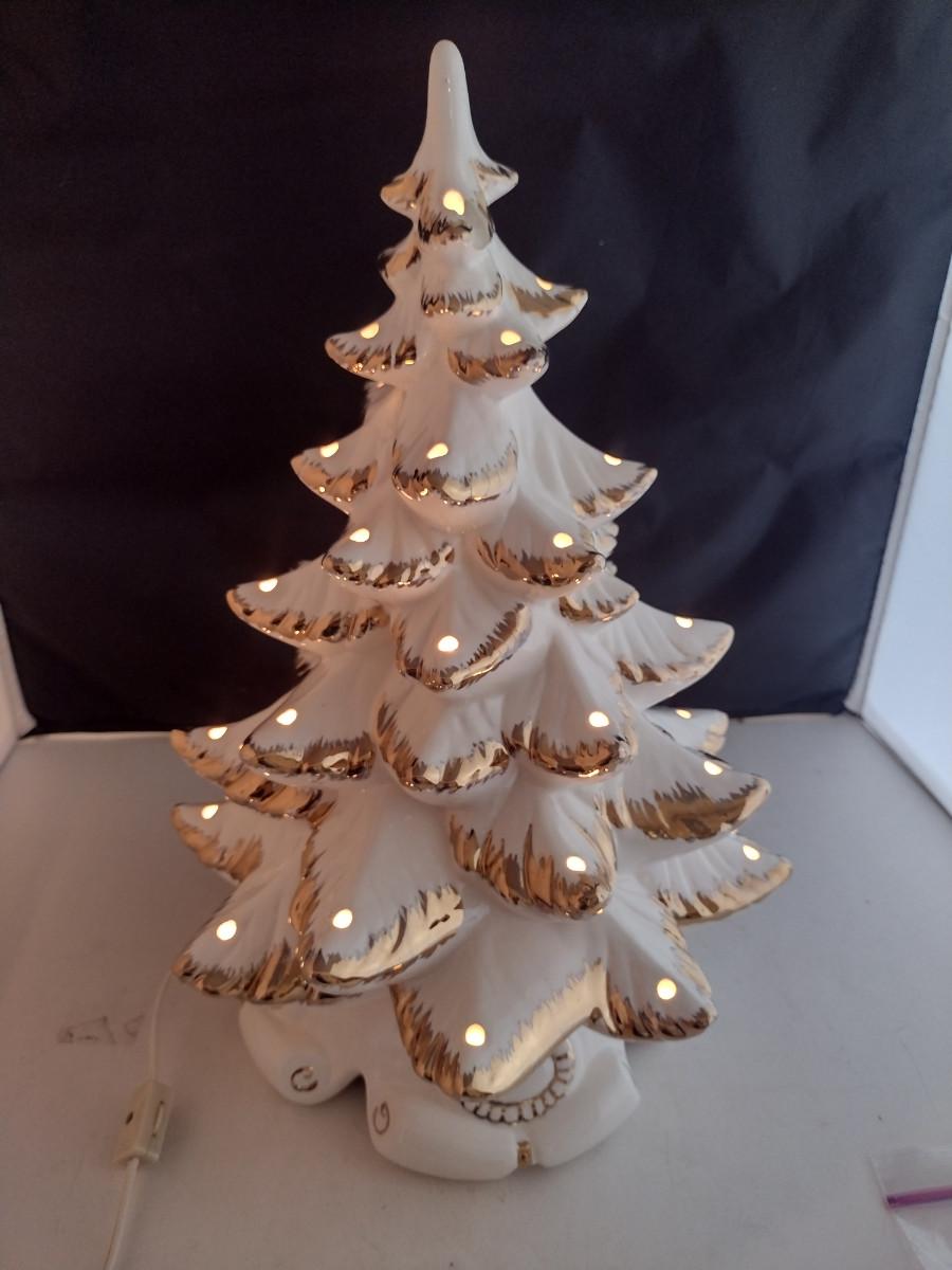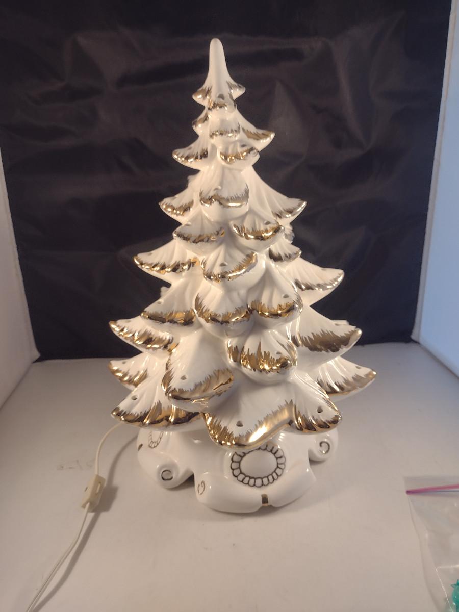 Vintage Ceramic Christmas Tree- Approx 16 3/8" Tall- Atlantic Mold. Item lights up. Item has some chipping/breakage. Please see all pictures for condition. Comes with bag of aqua blue 'bulbs'.