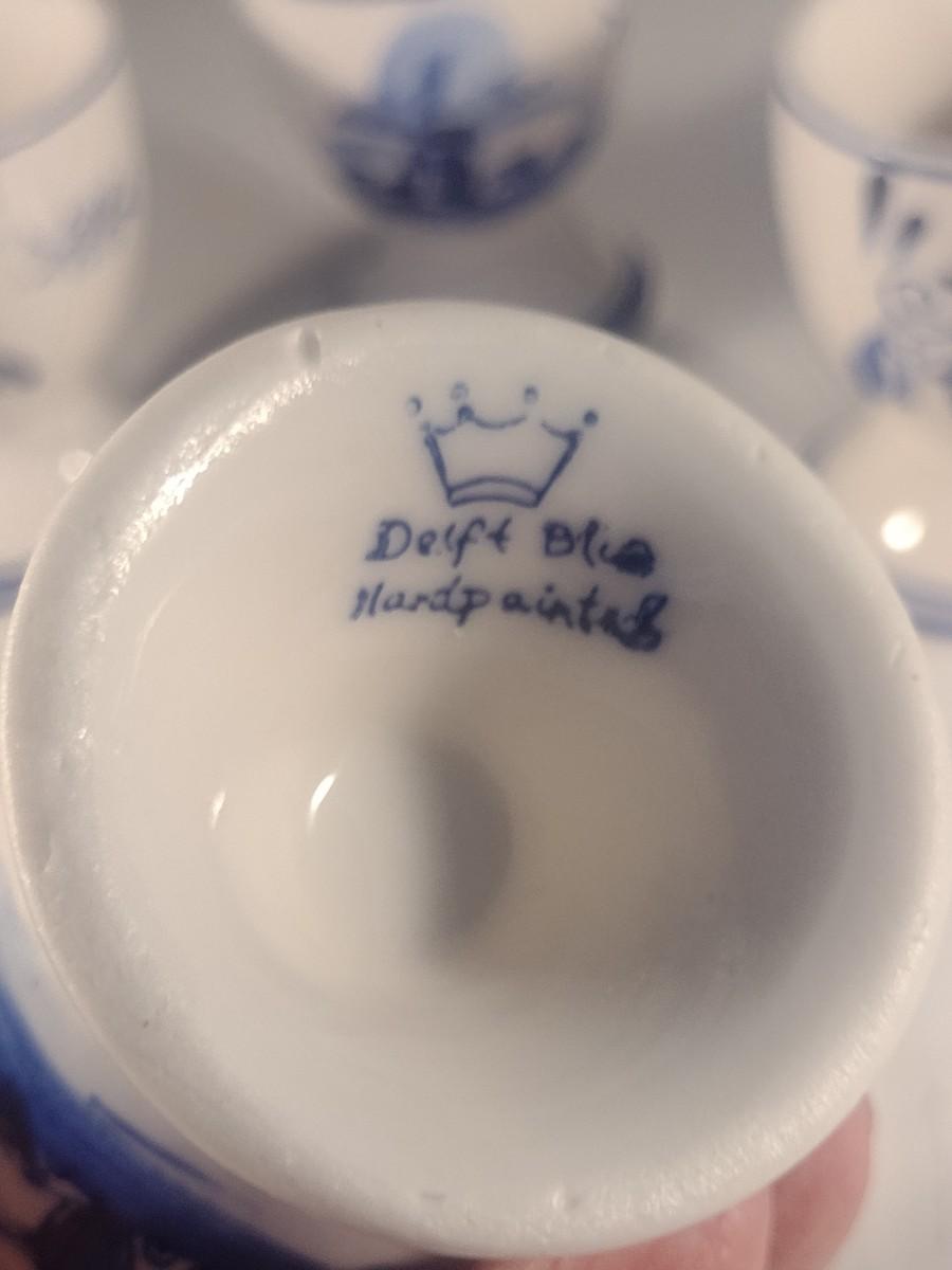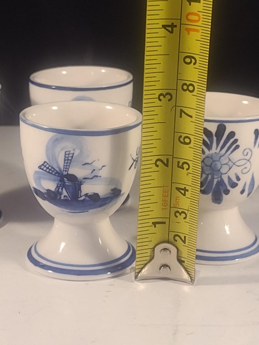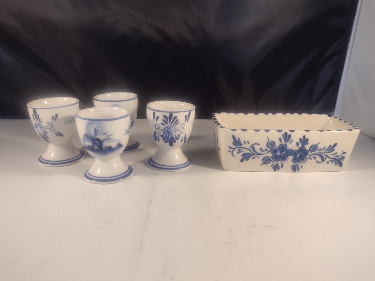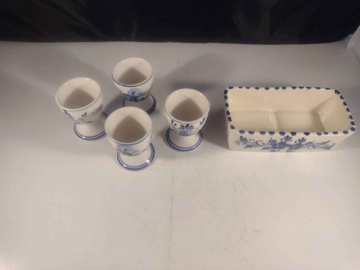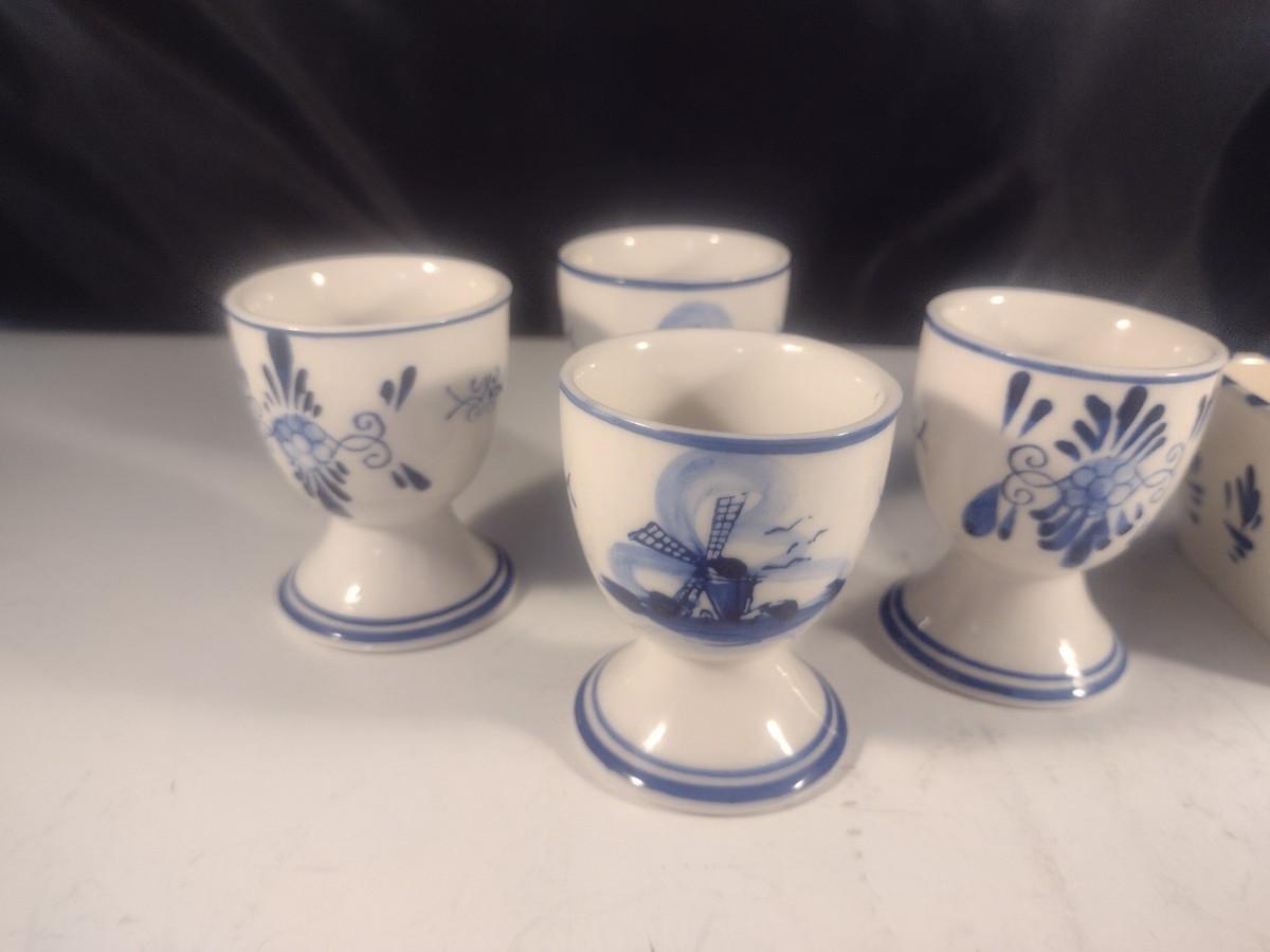 Vintage Ceramic Delft Blue Holland Hand-Painted Egg Cups and Caddy