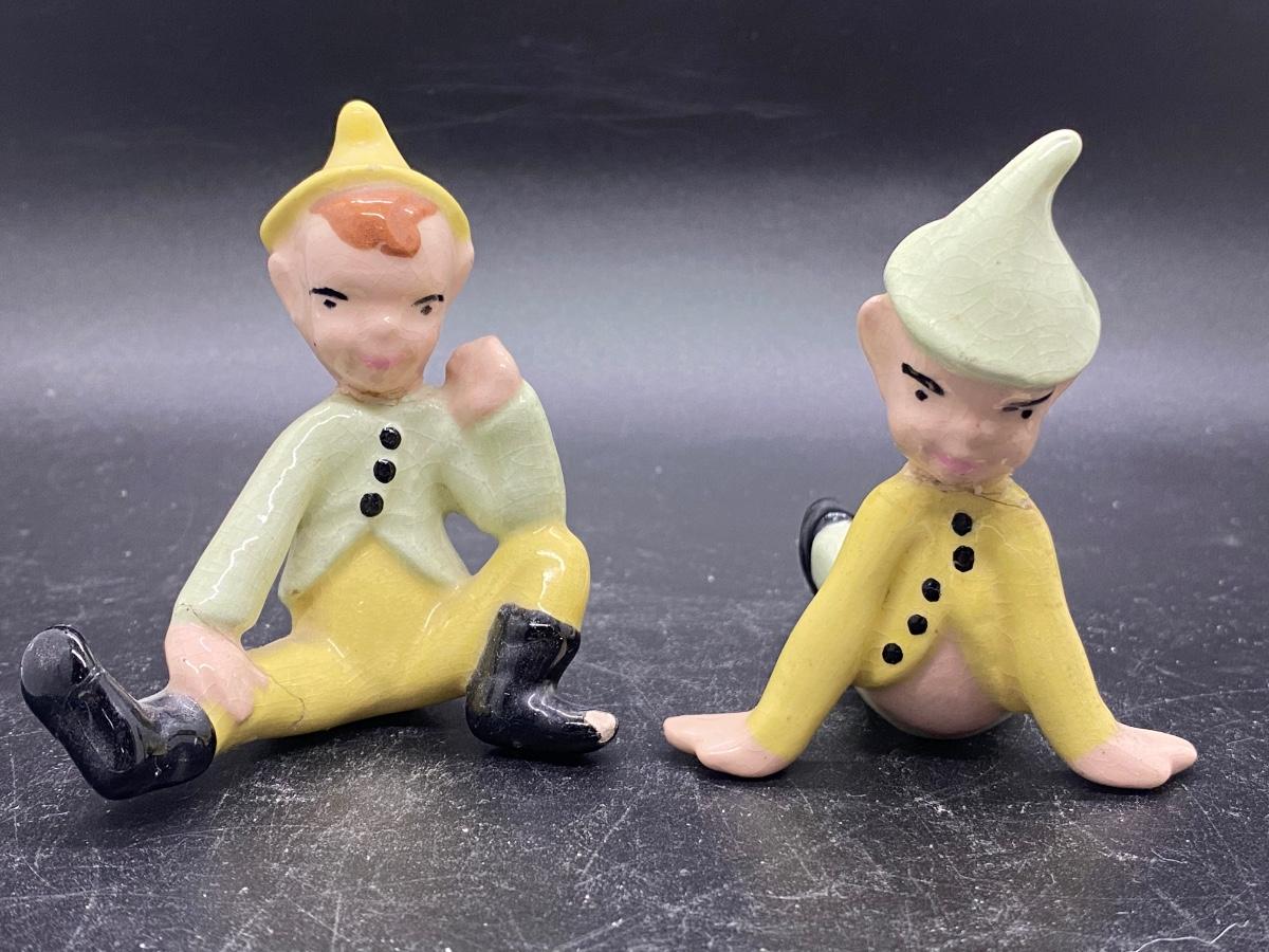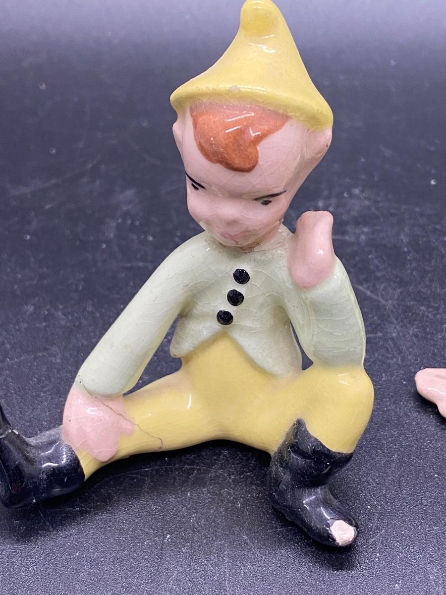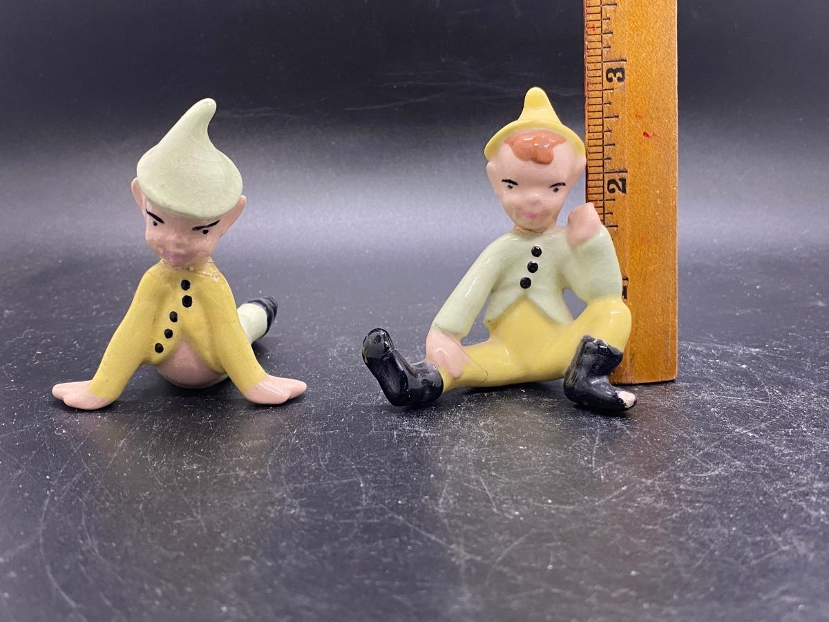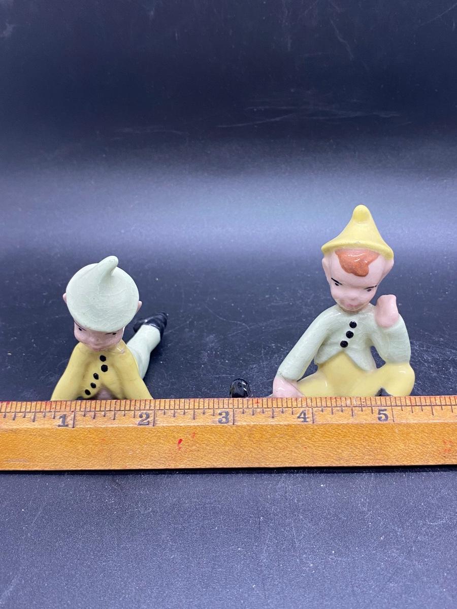 Pair of vintage elf figurines. Both have been damaged and repaired. Display nicely. See photos on conditions. Small, about 3" size.
