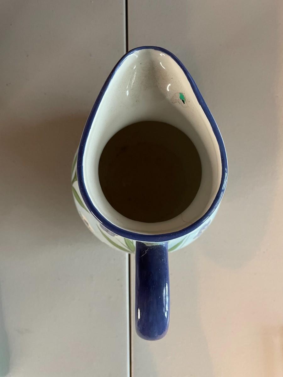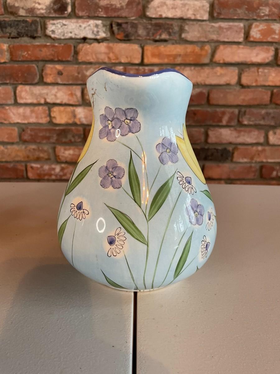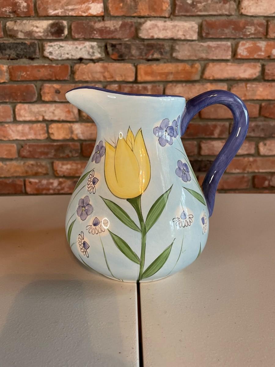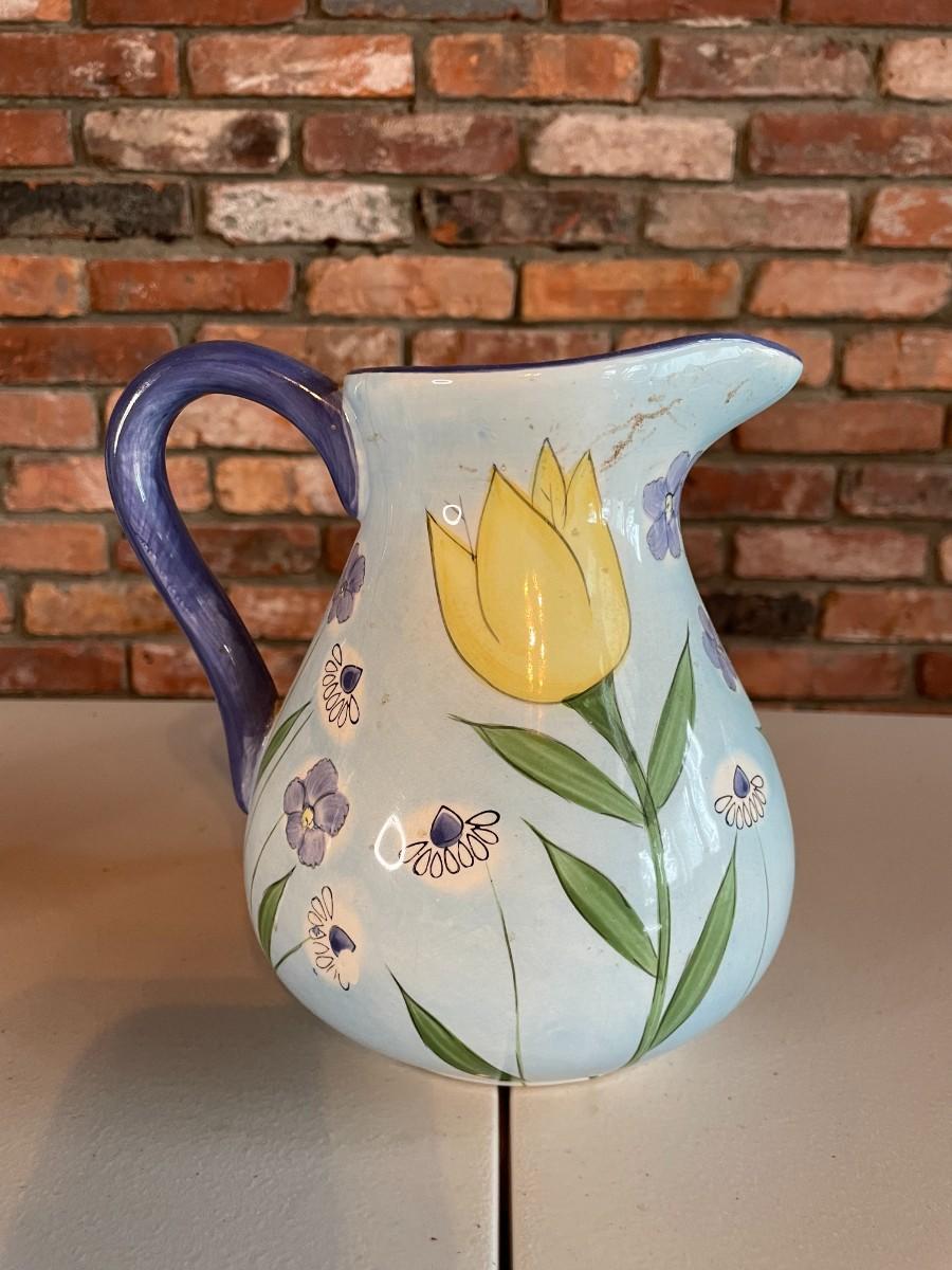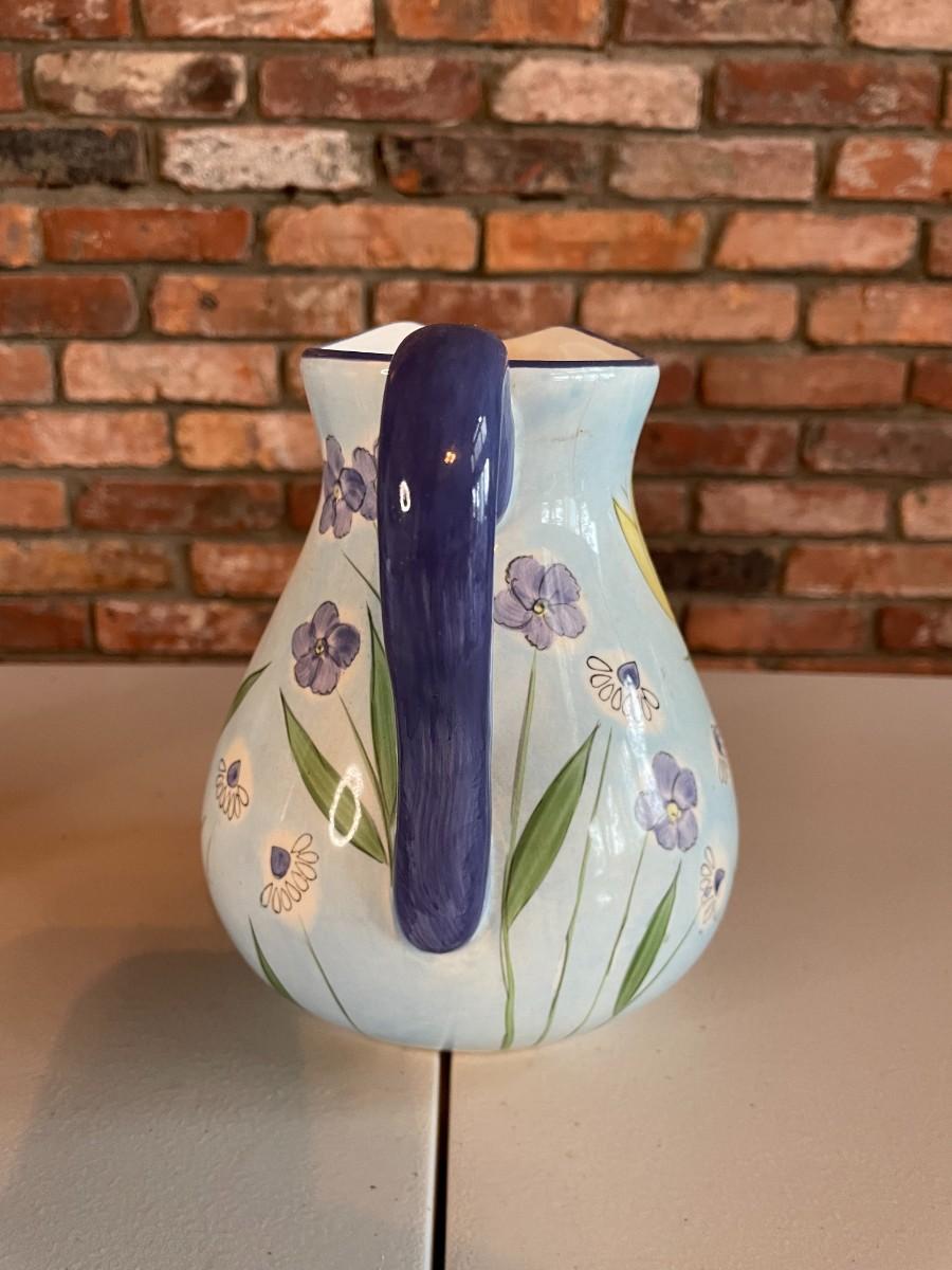 Blue ceramic pitcher with yellow and white floral details. 7W x 7H.