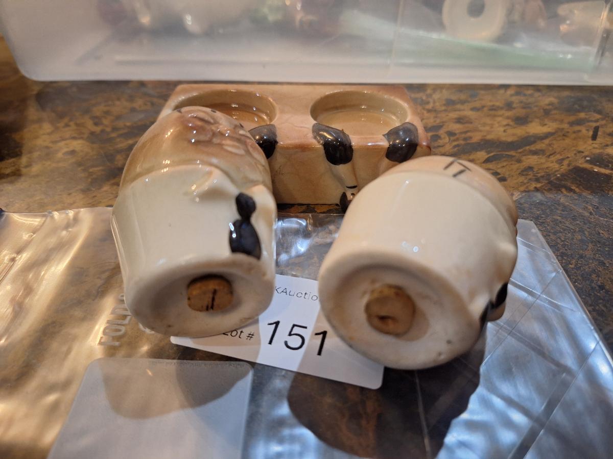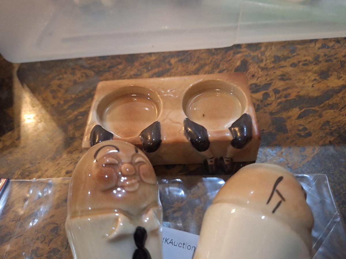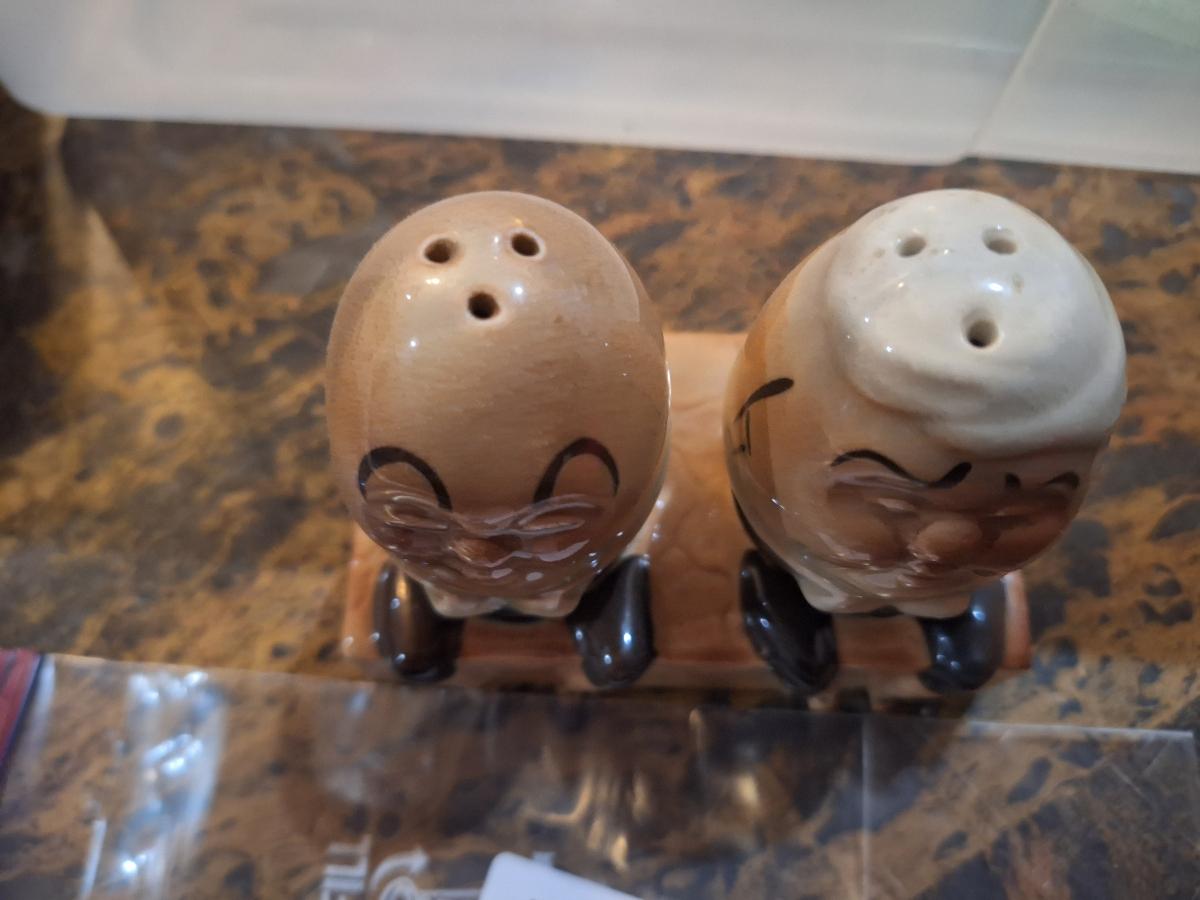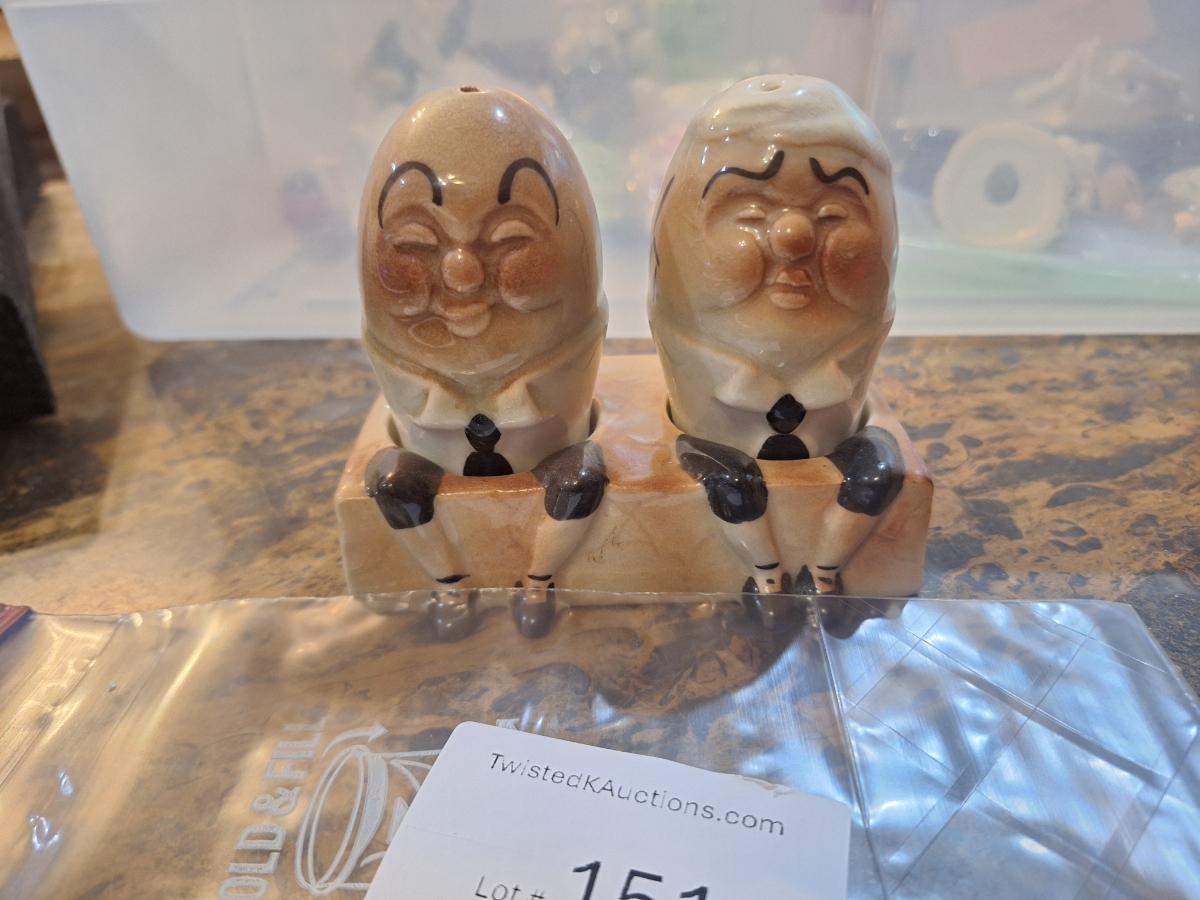 vintage ceramic Humpty Dumpty salt and pepper shakers set, likely from Japan in the 1950s