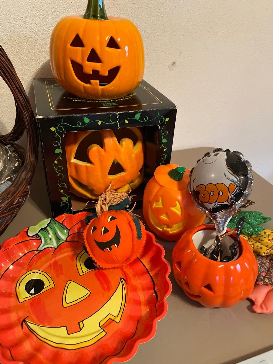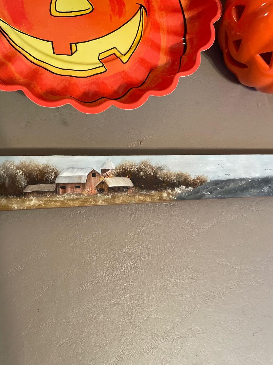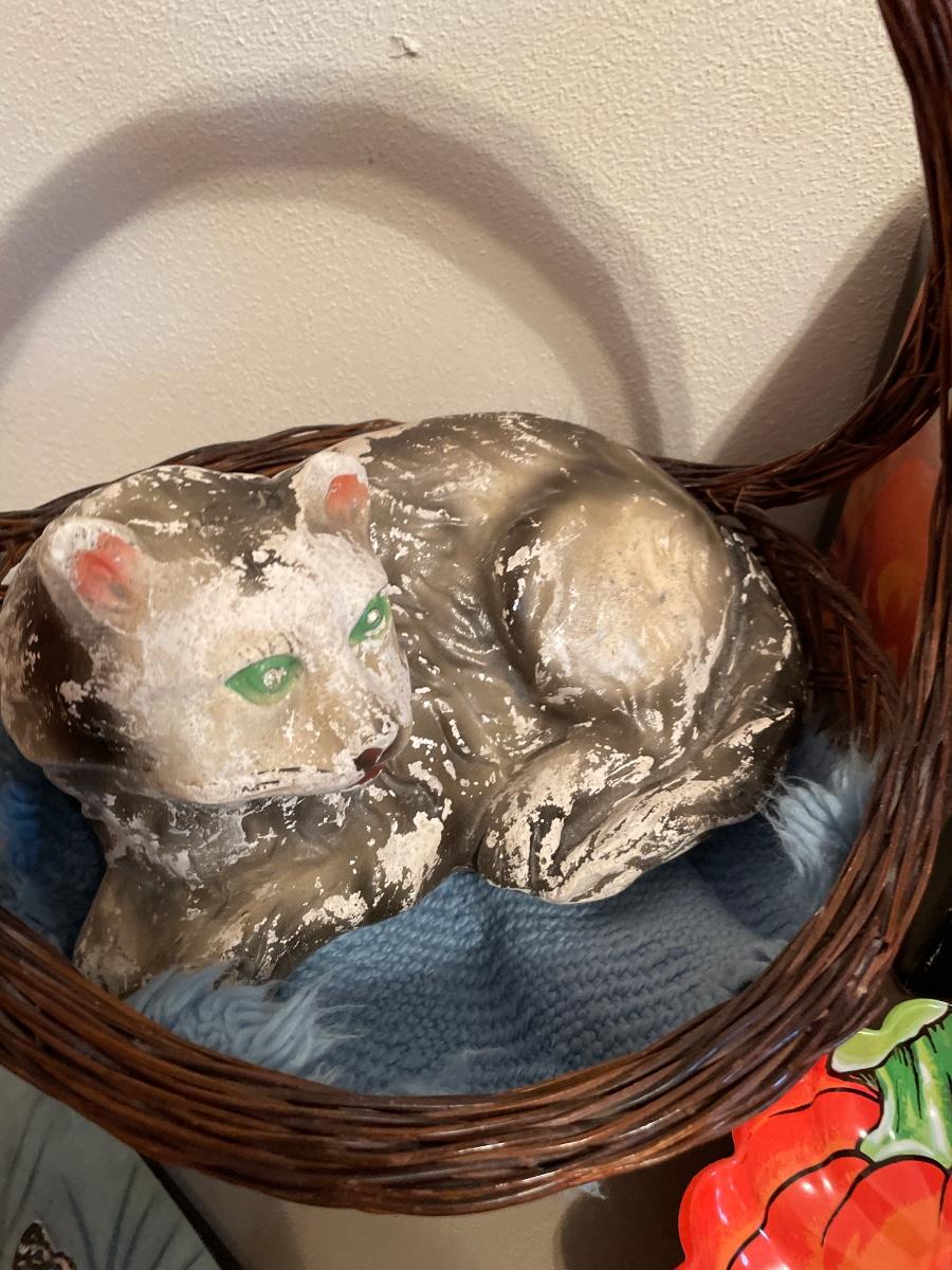 Vintage ceramic kitten, painted wood yardstick, and Halloween decor