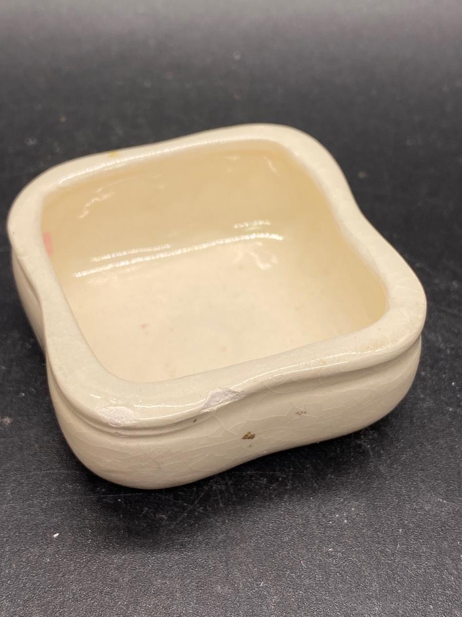 Small, lidded trinket dish with a puppy on top. Vintage condition with crazing. There is a small chip in the edge. About 2" size.