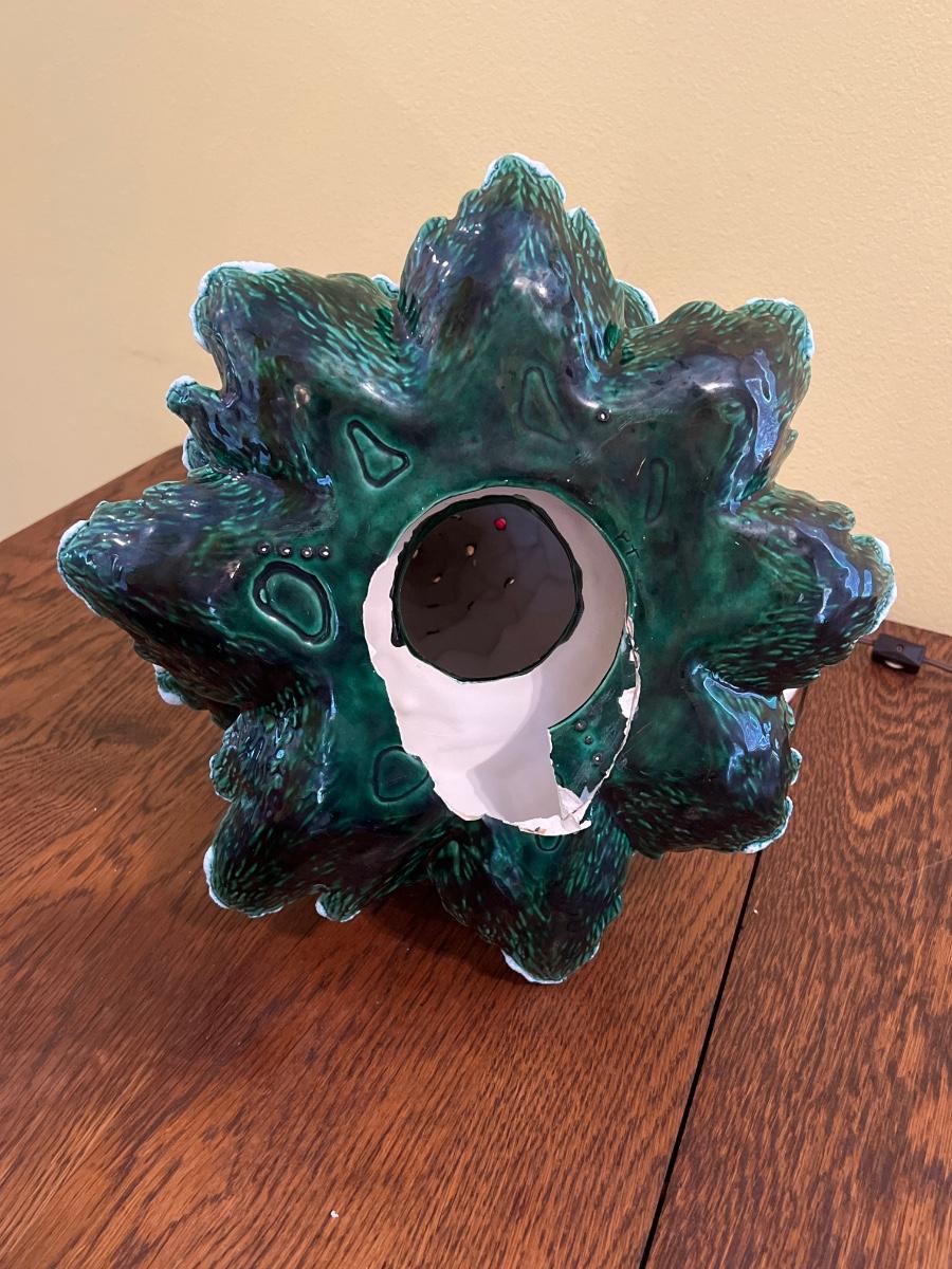 Works! Has all its ornaments. Bottom of pedestal is broken but it stands upright and sits on its stand perfectly. See Photo ~ 19” H x 14” Round.