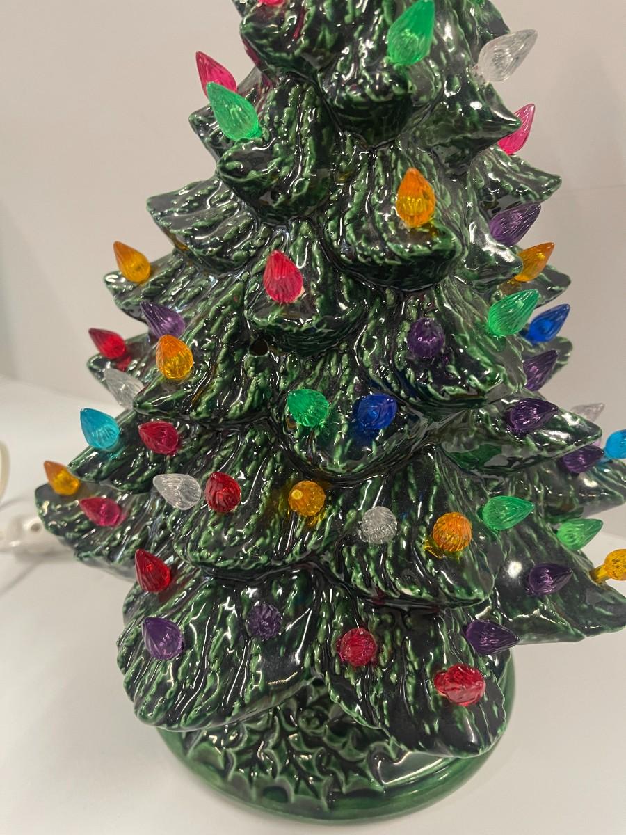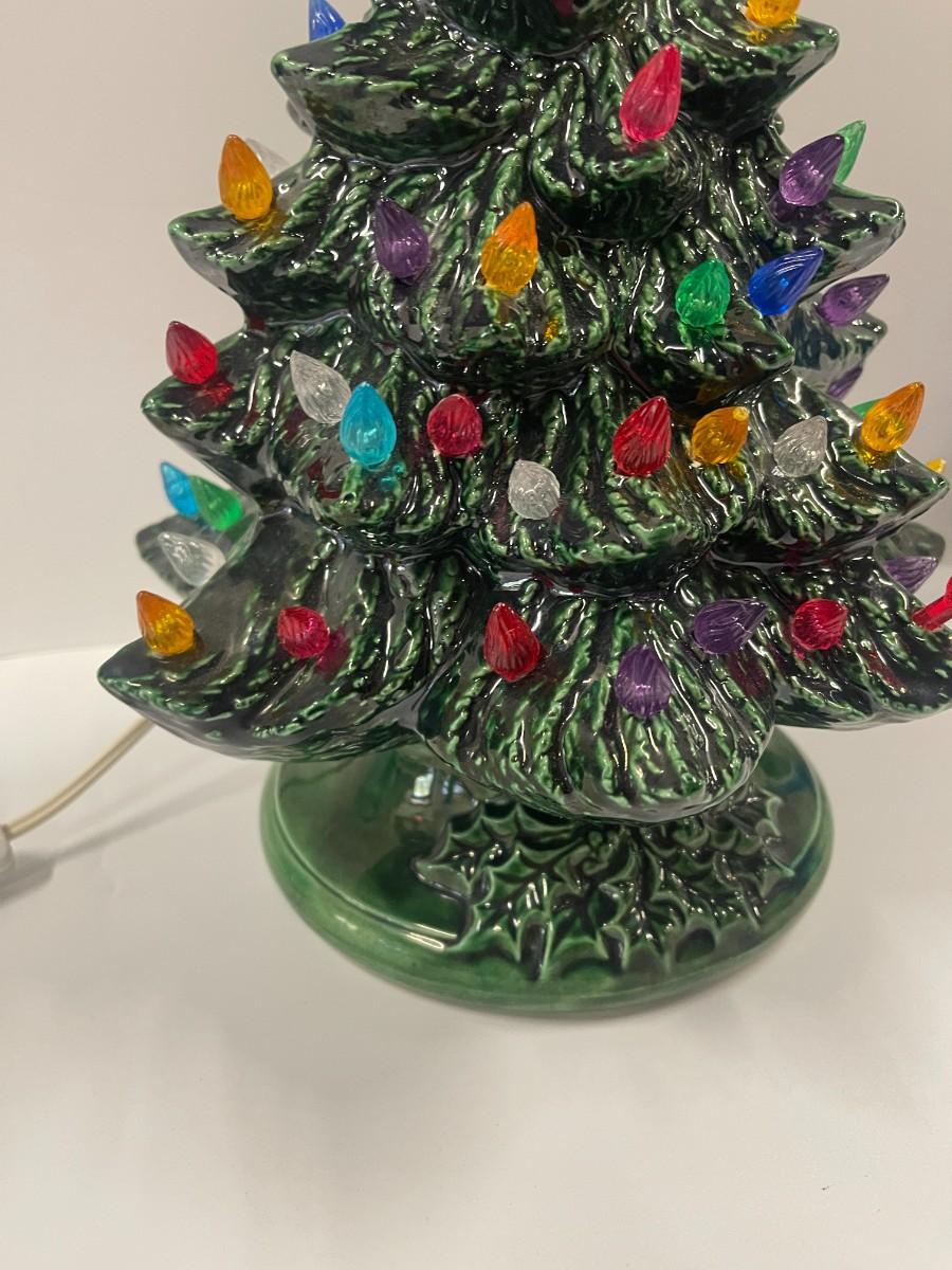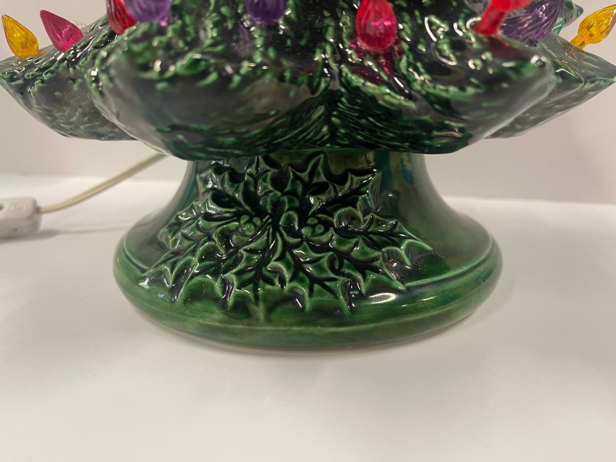 Vintage green ceramic lighted Christmas tree. Good condition, missing some ornaments. 13"