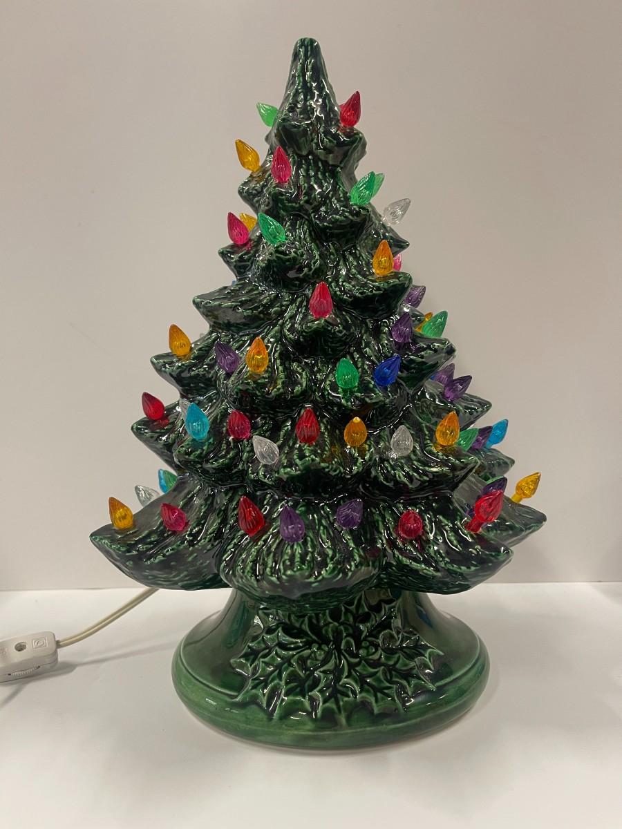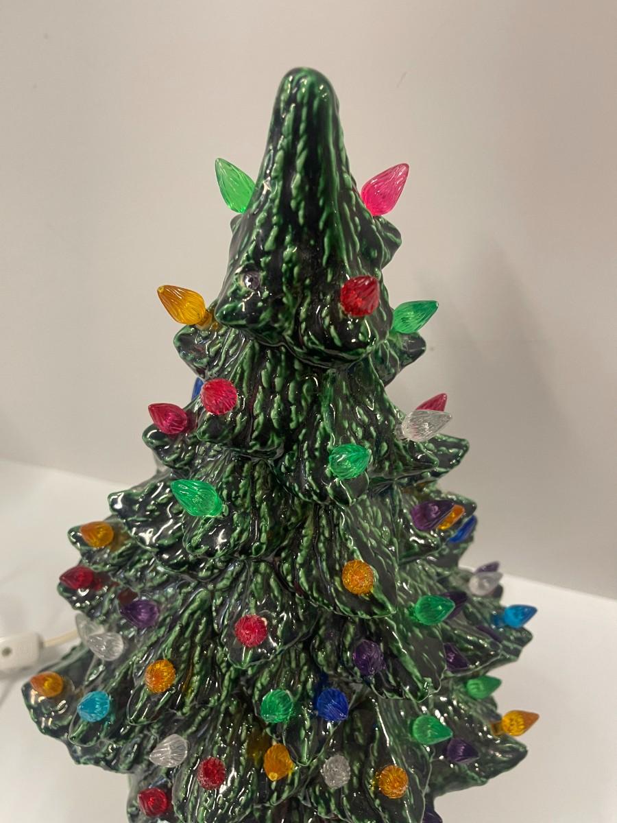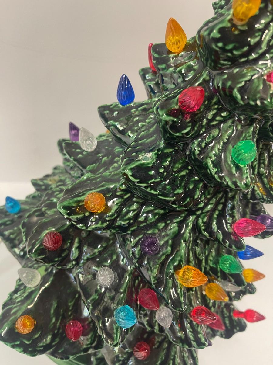 Vintage green ceramic lighted Christmas tree. Good condition, missing some ornaments. 13"