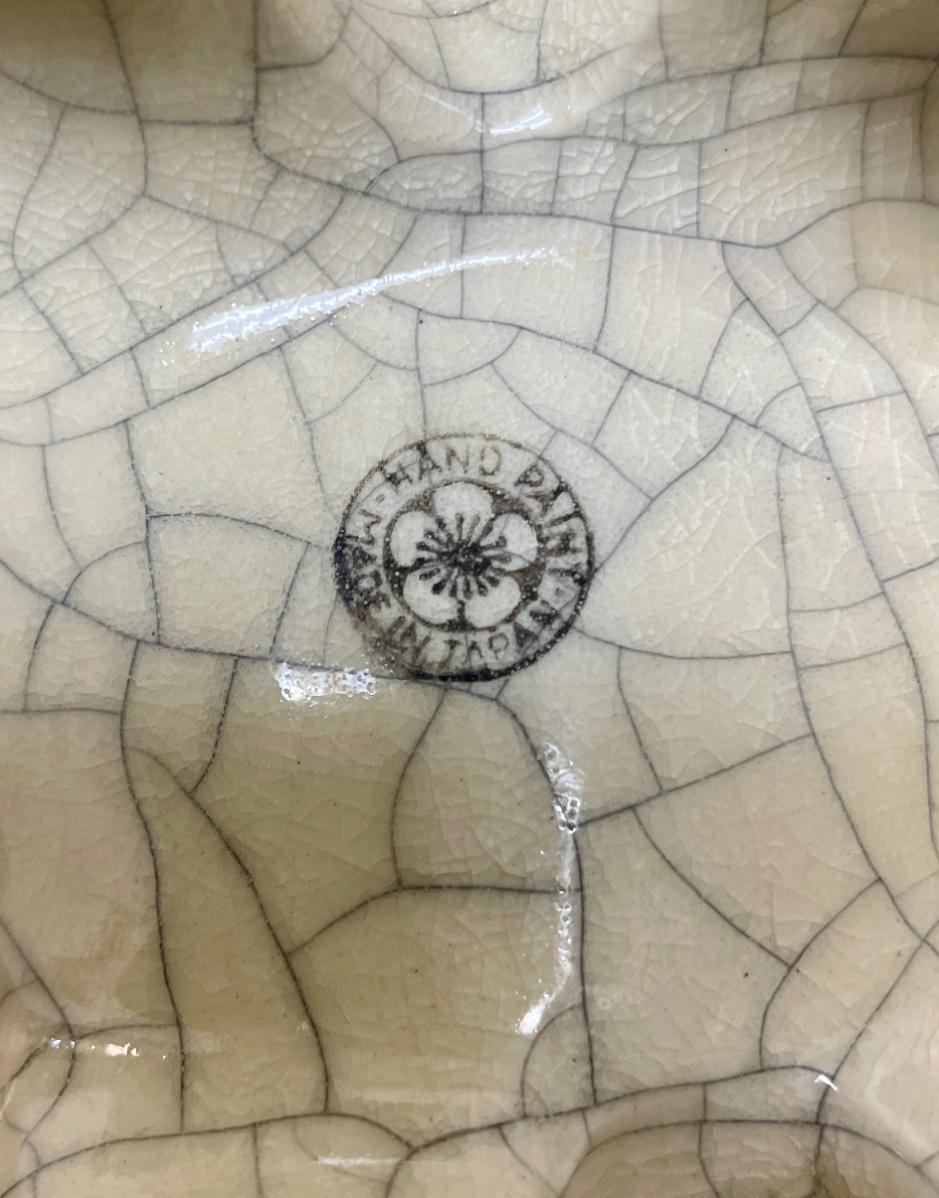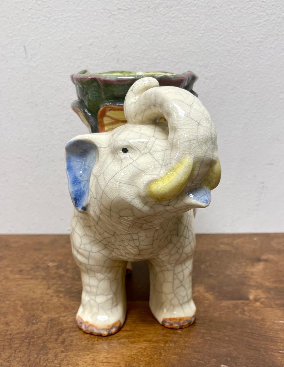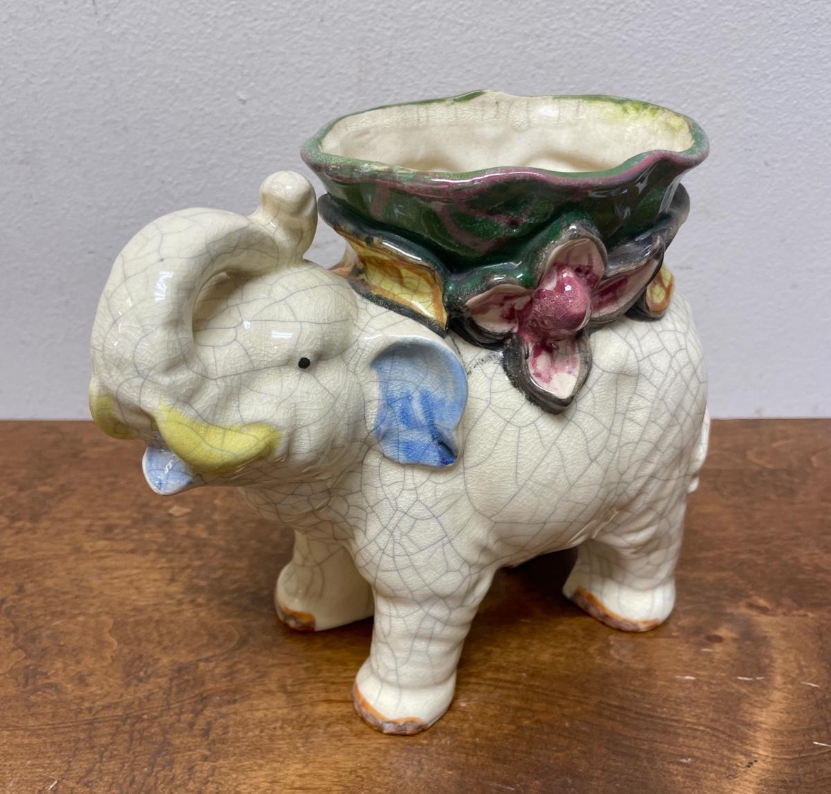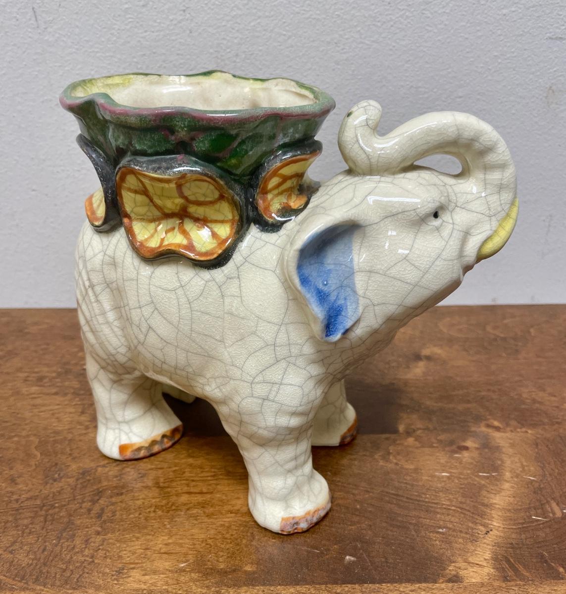 Hand painted, crackle finish, from Japan. Good condition except that one elephant has a chip in the rear of the green planter basket, see photos. Approx. 7" tall and 8" long.