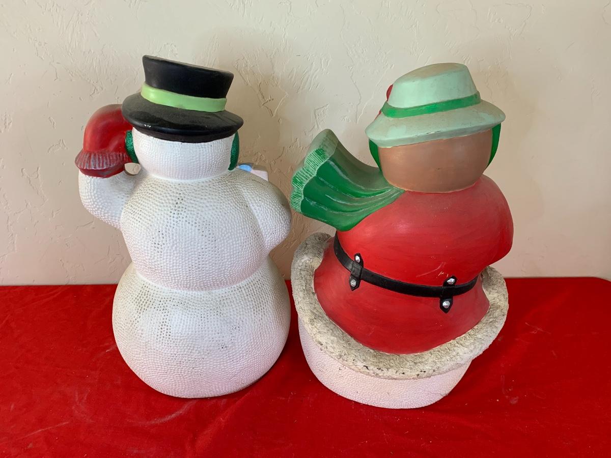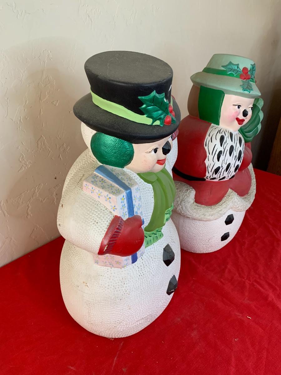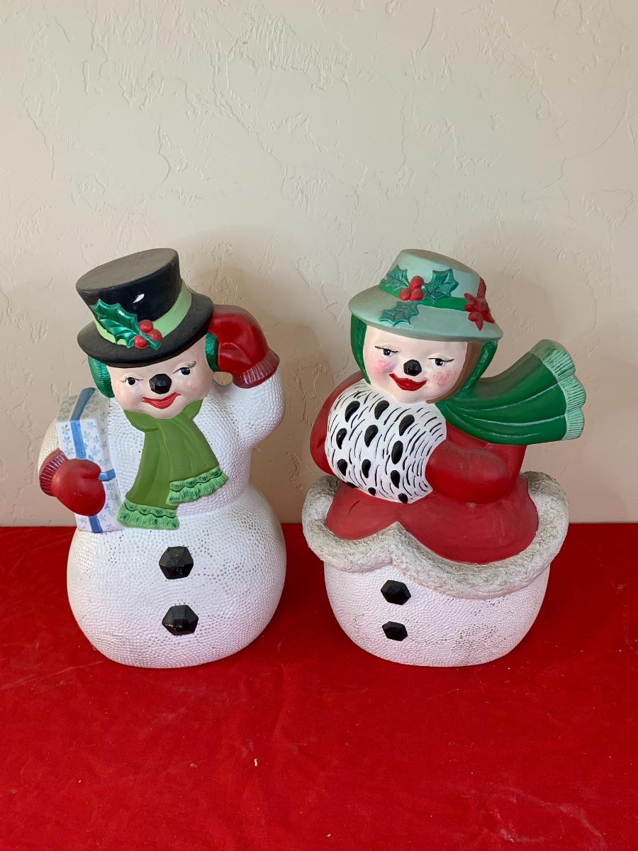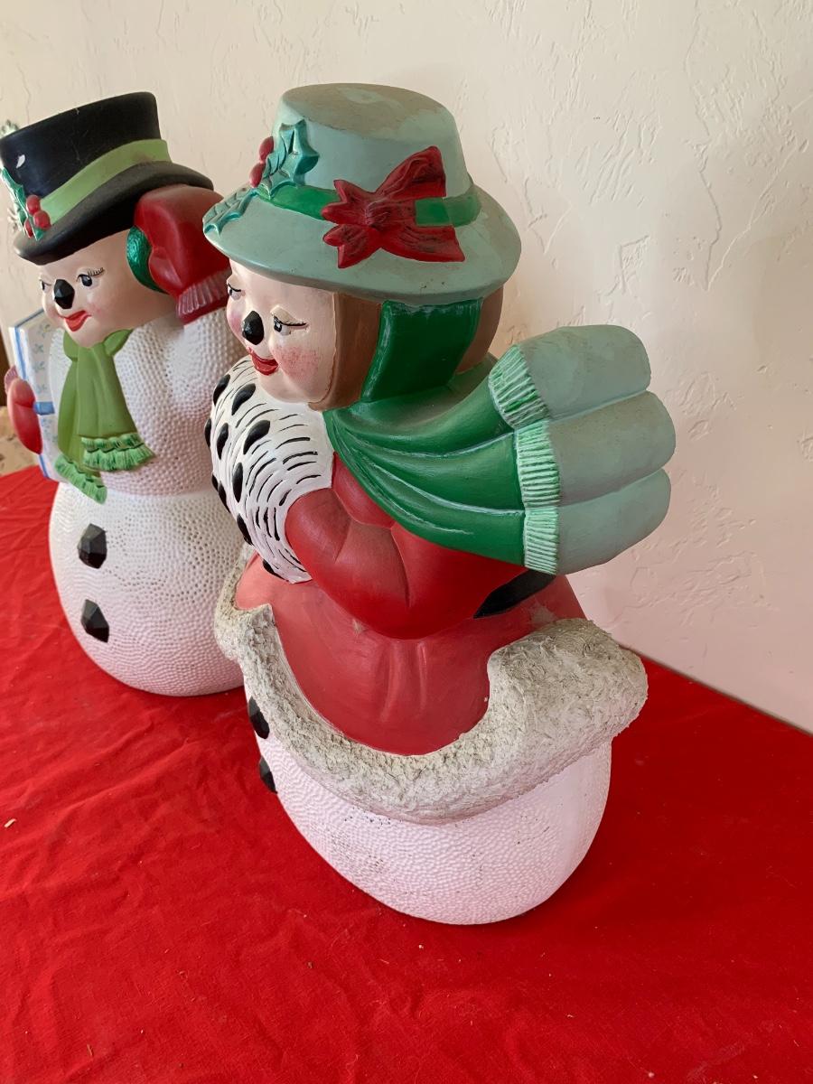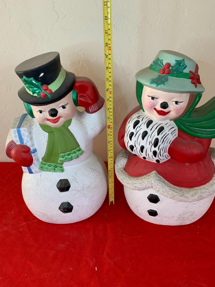 Vintage Ceramic MCM snow people. Minor wear, due to age. Would look great once they are all cleaned up! Each Measure in at about 20” tall.