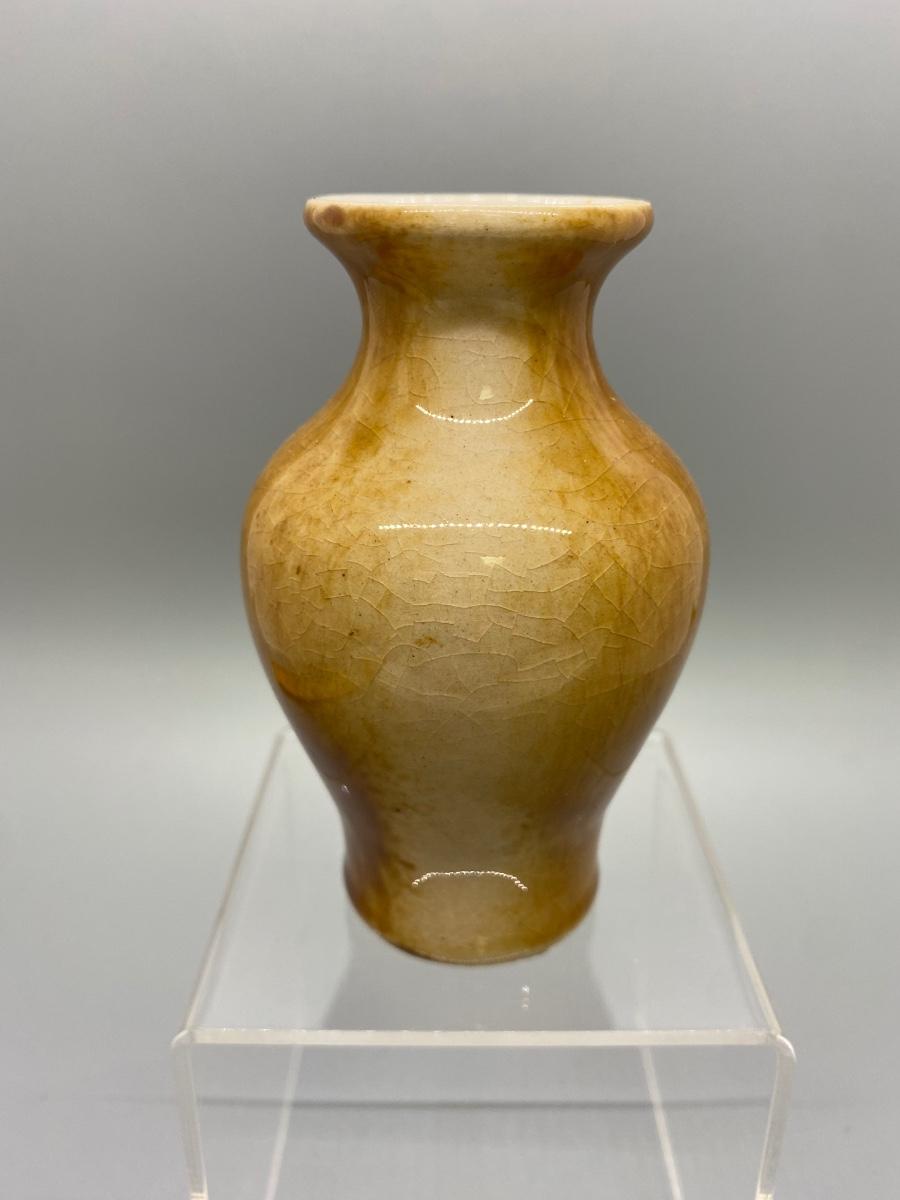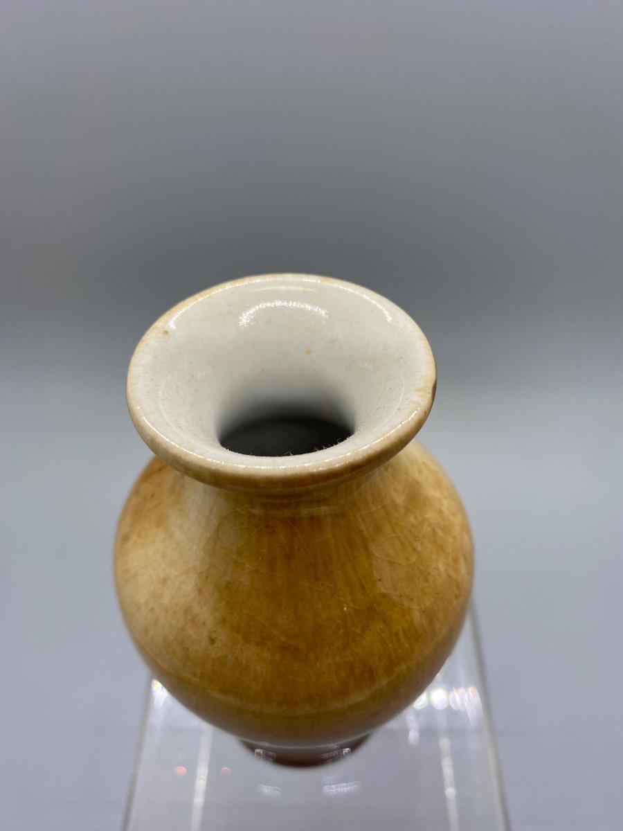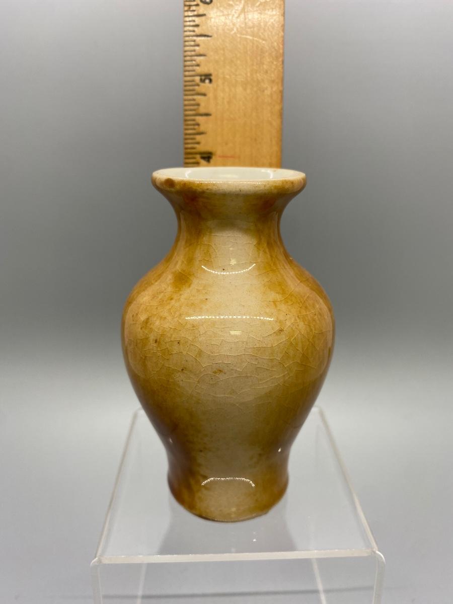 Vintage ceramic bud vase. Has a tan color glaze. Only 4" size. No chips but there is crazing to the glaze.