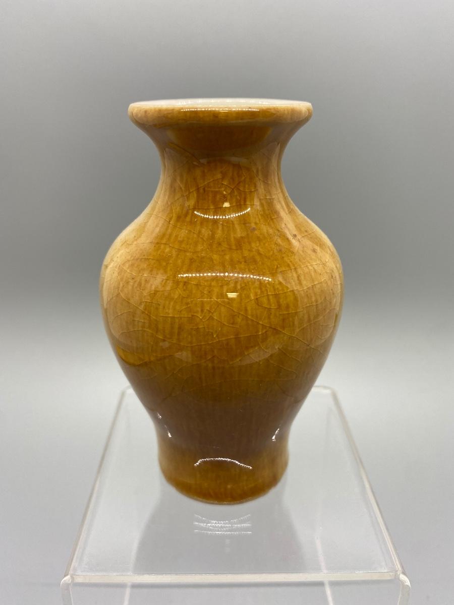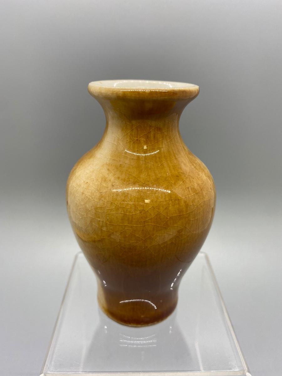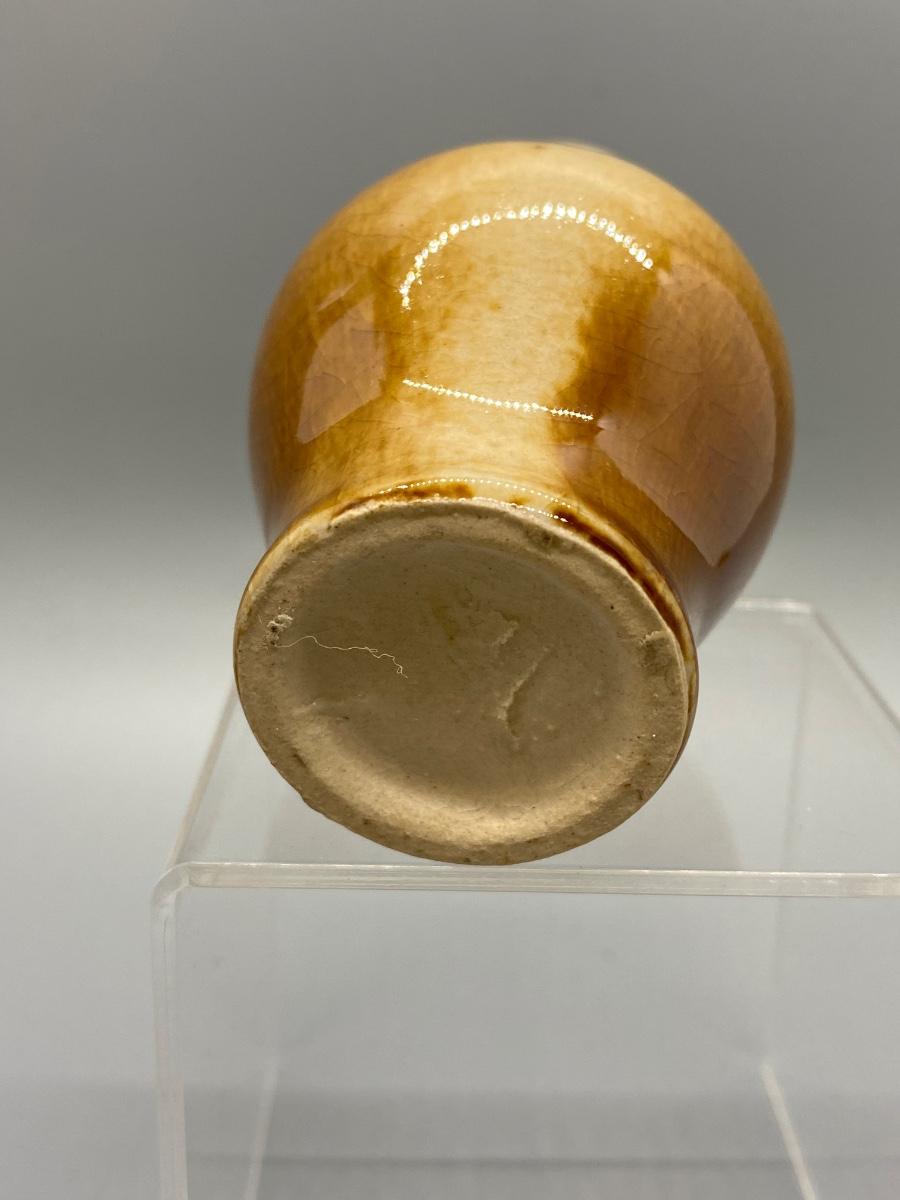 Vintage ceramic bud vase. Has a tan color glaze. Only 4" size. No chips but there is crazing to the glaze.