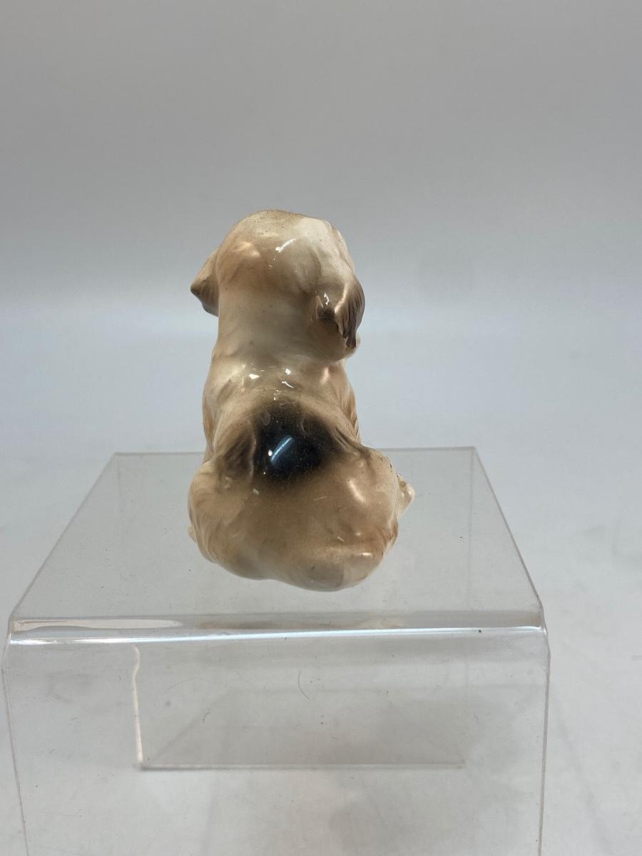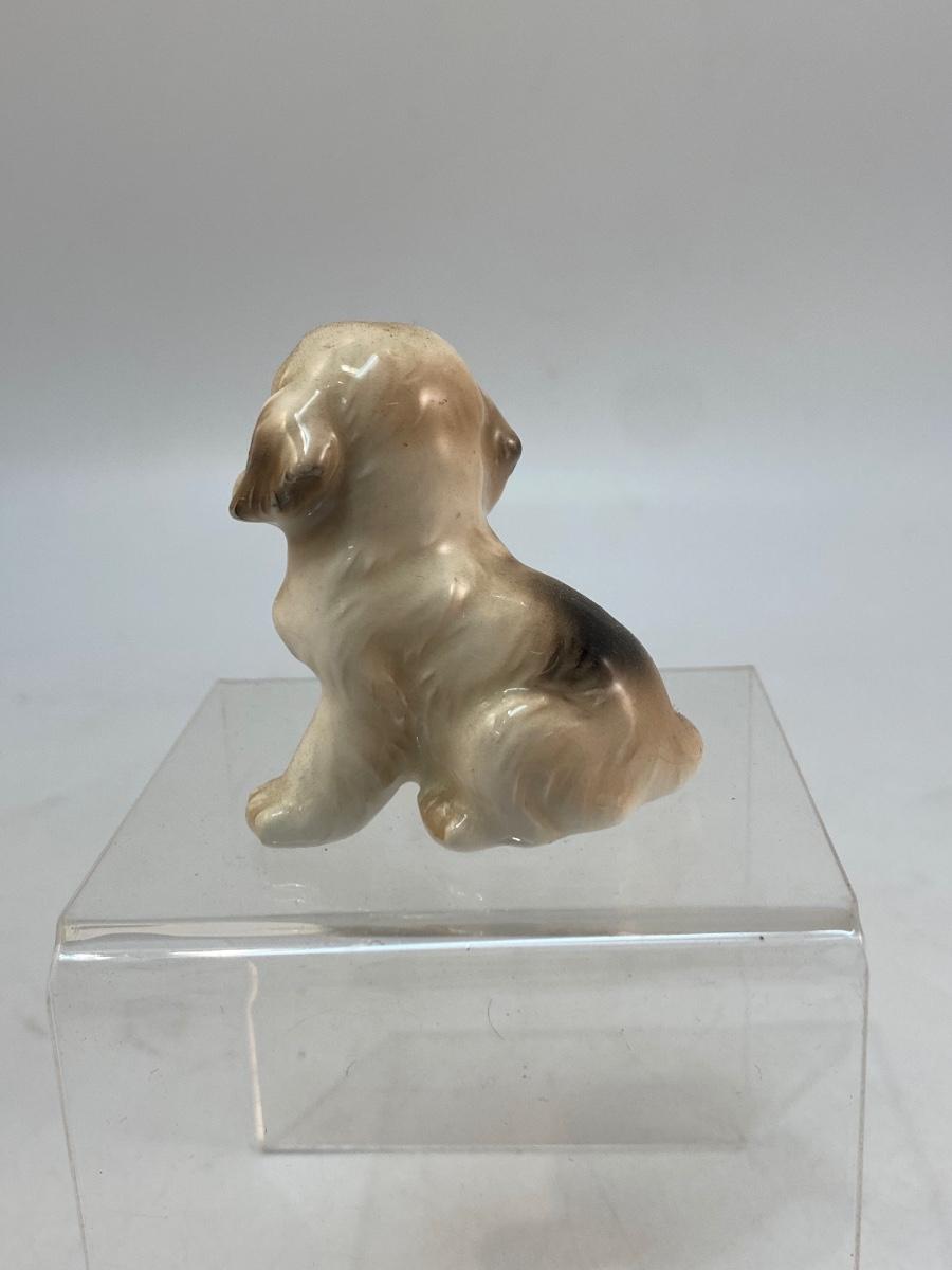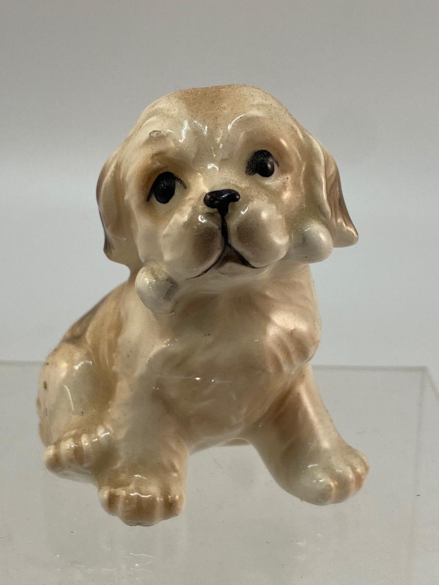 Vintage Ceramic Miniature Dog with Bone Figurine. Good condition. About 2" size.