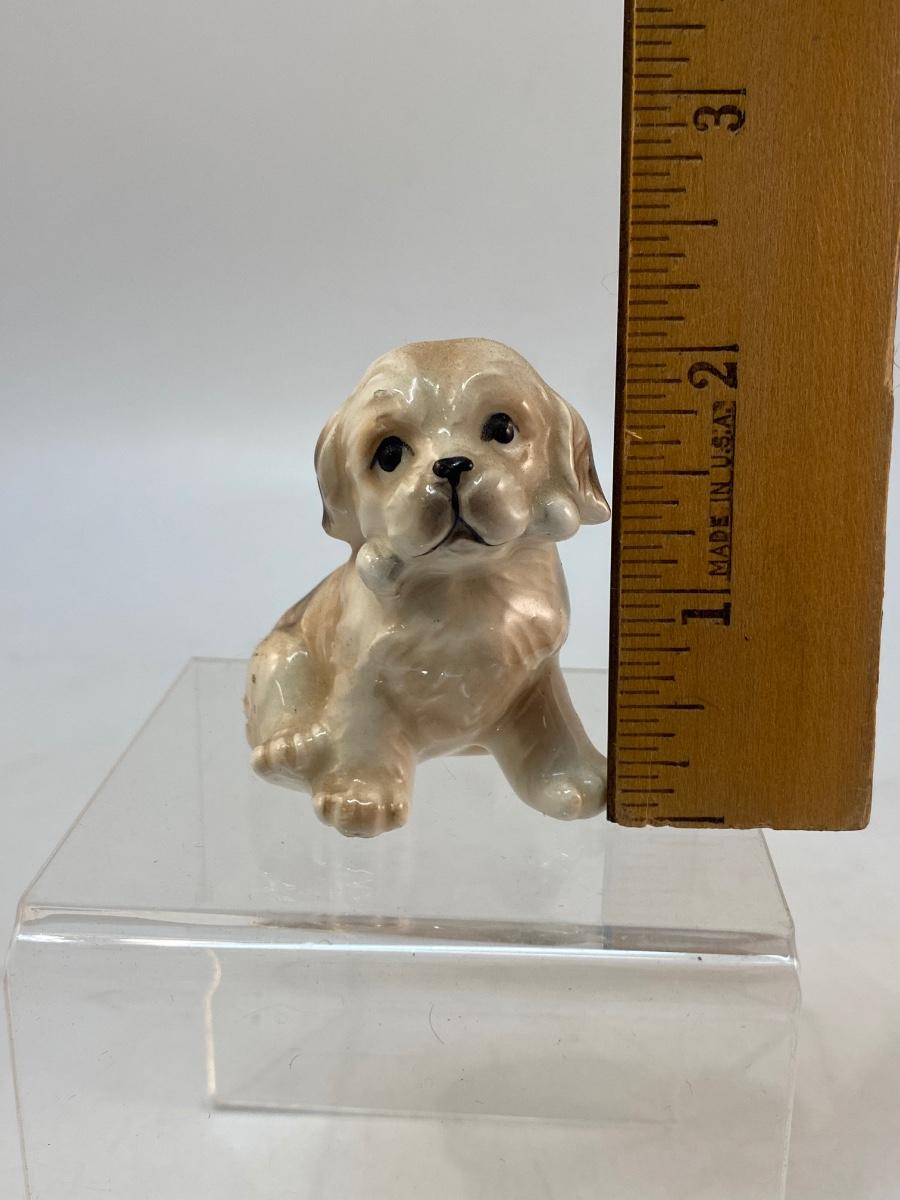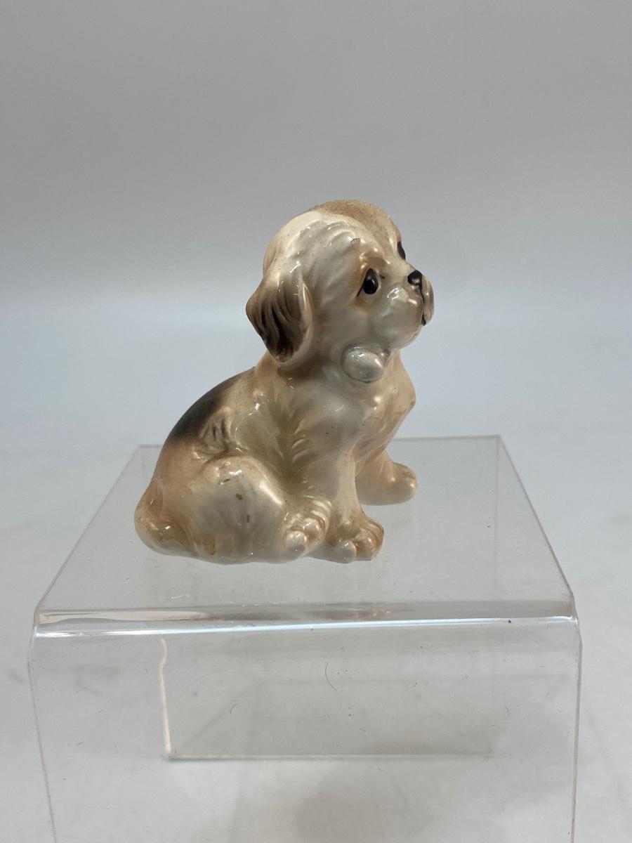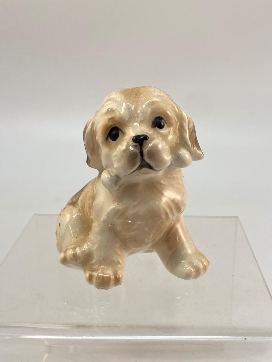 Vintage Ceramic Miniature Dog with Bone Figurine. Good condition. About 2" size.