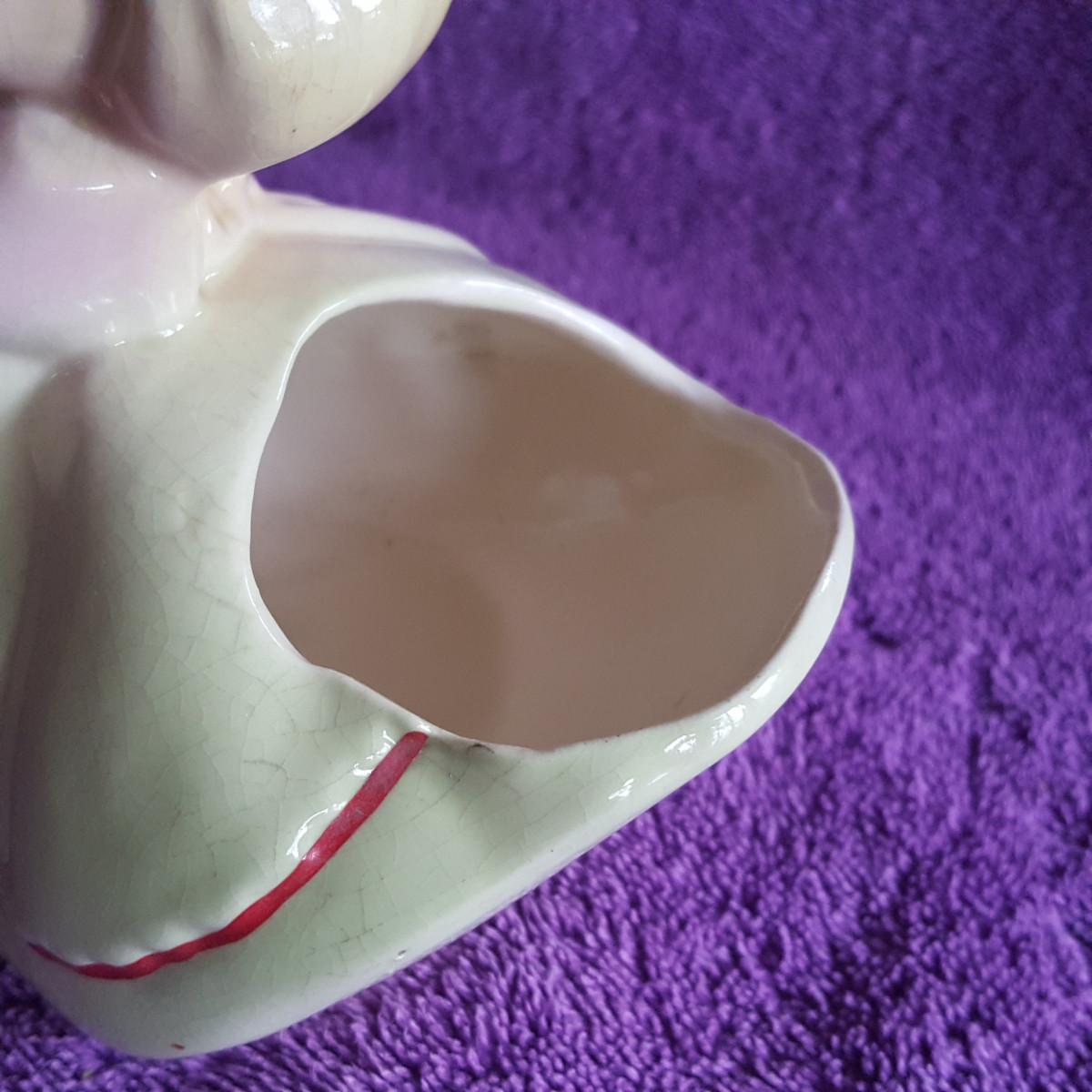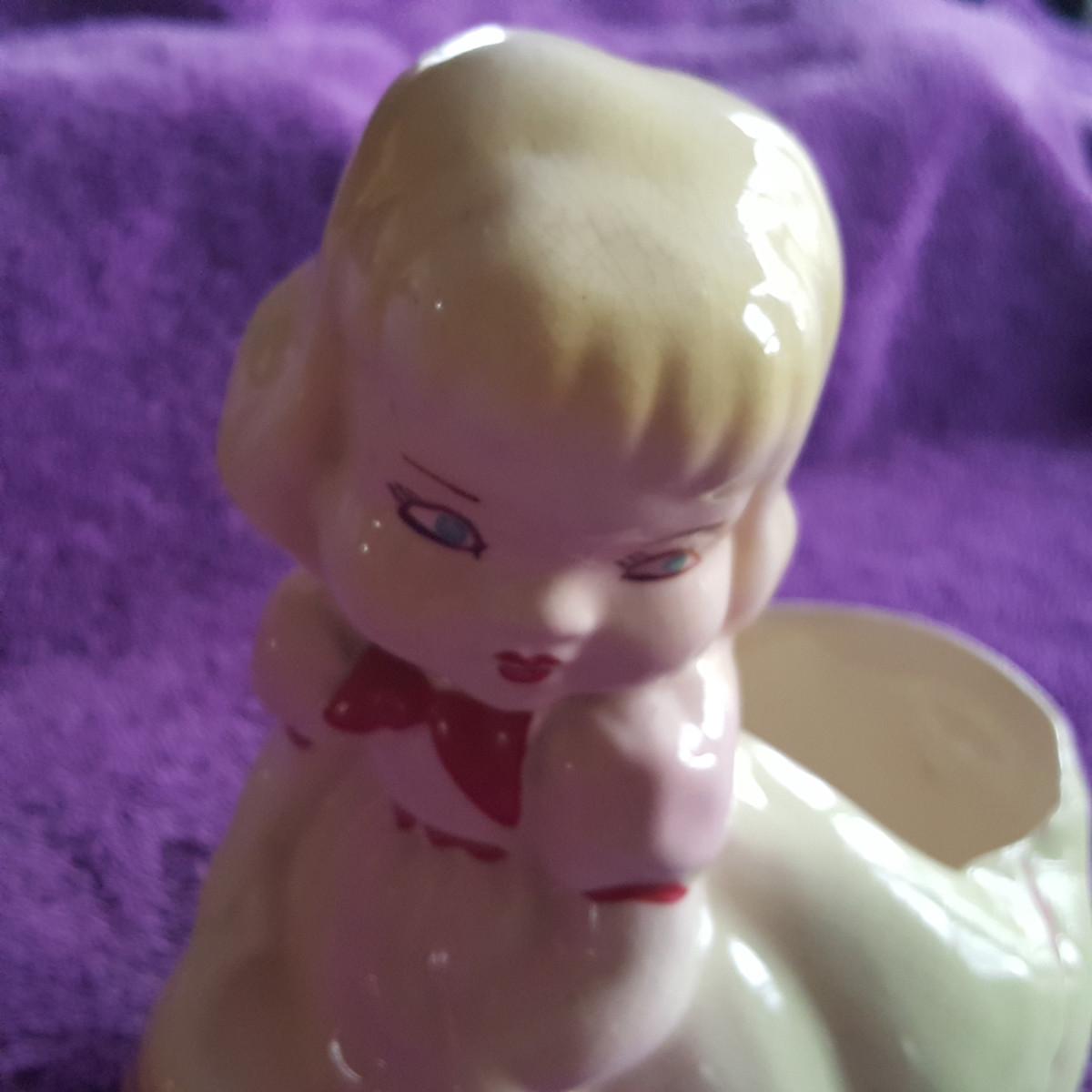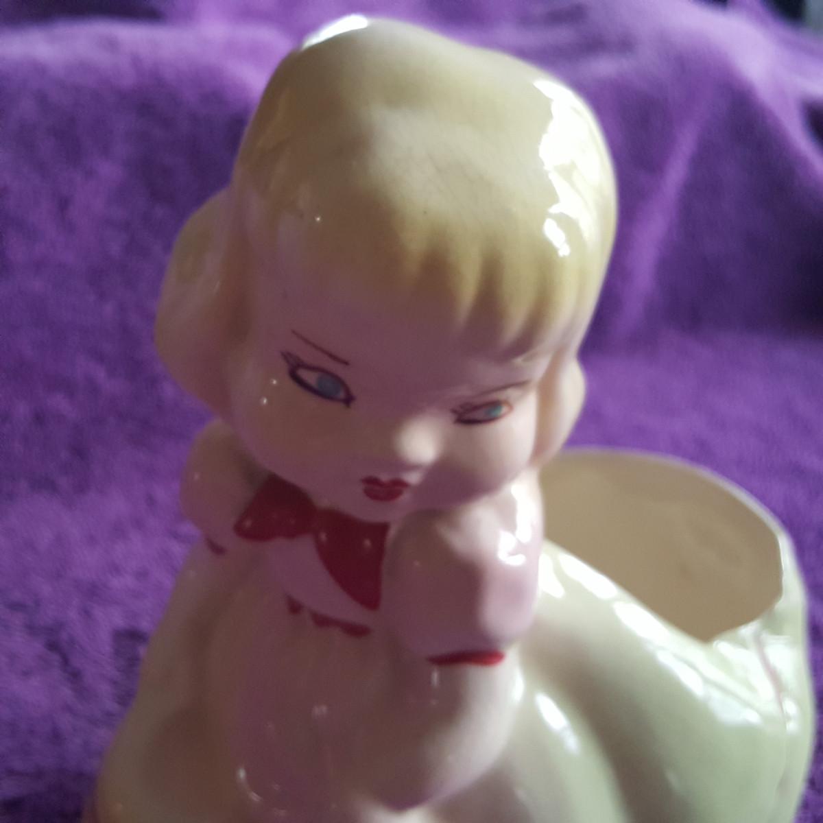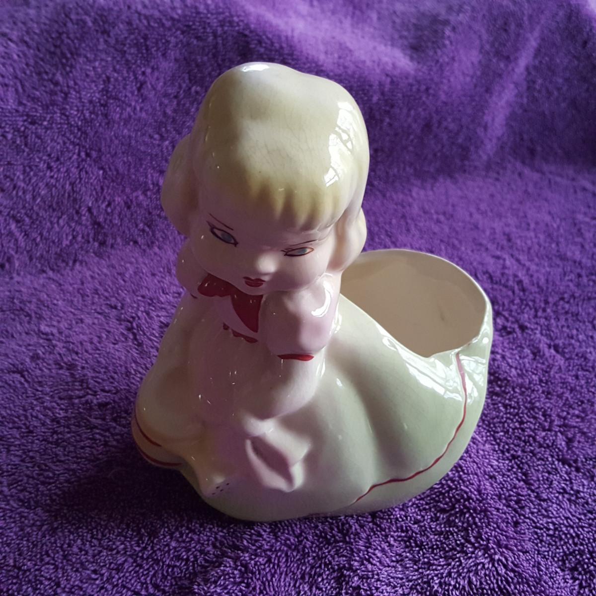 This auction lot is for a Vintage Ceramic Planter in the shape of a little girl. The planter measures about 6.5-inches tall and is about 6-inches at its widest point. The little girl is wearing a pink dress and is using a watering can - quite quite, especially once you put your favorite succulent in the container. Has age crazing and pottery spots as would be expected with an item of its age.