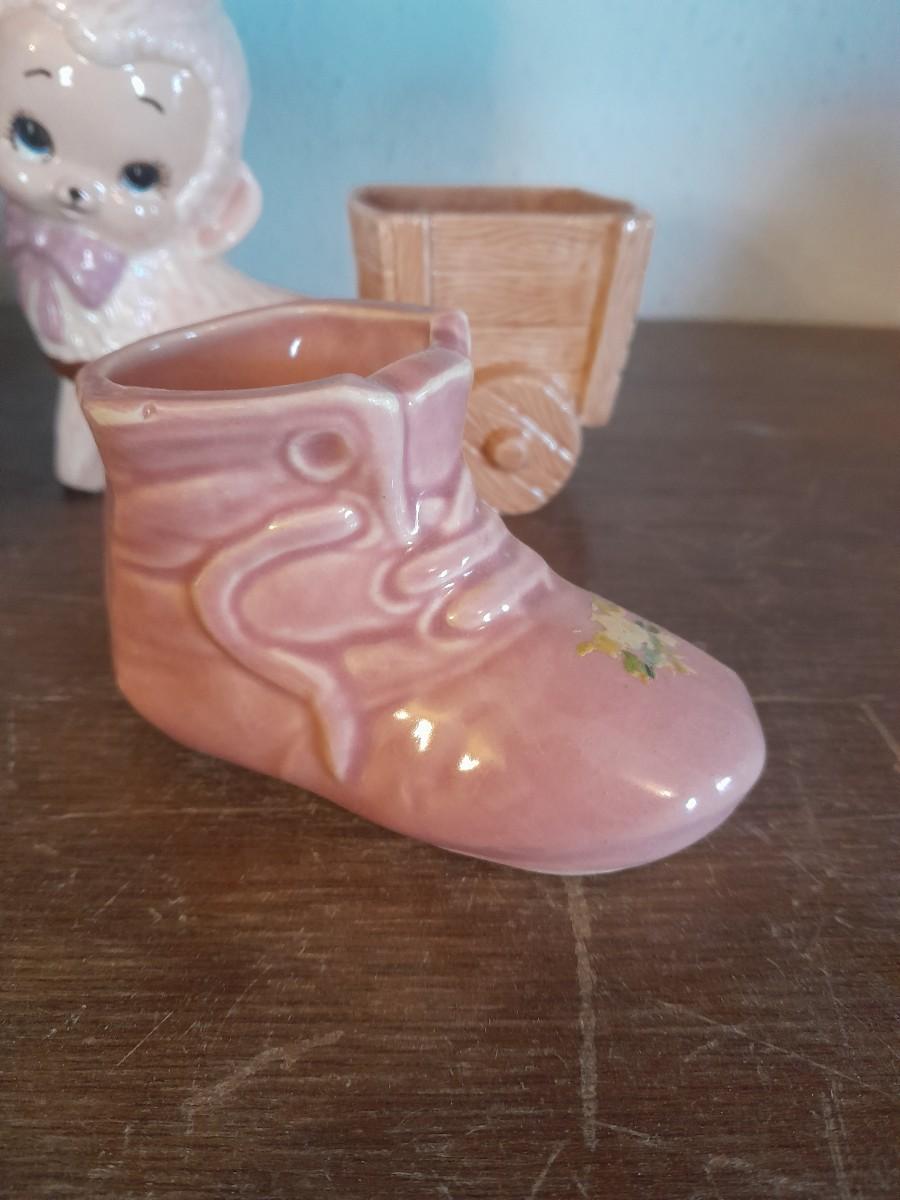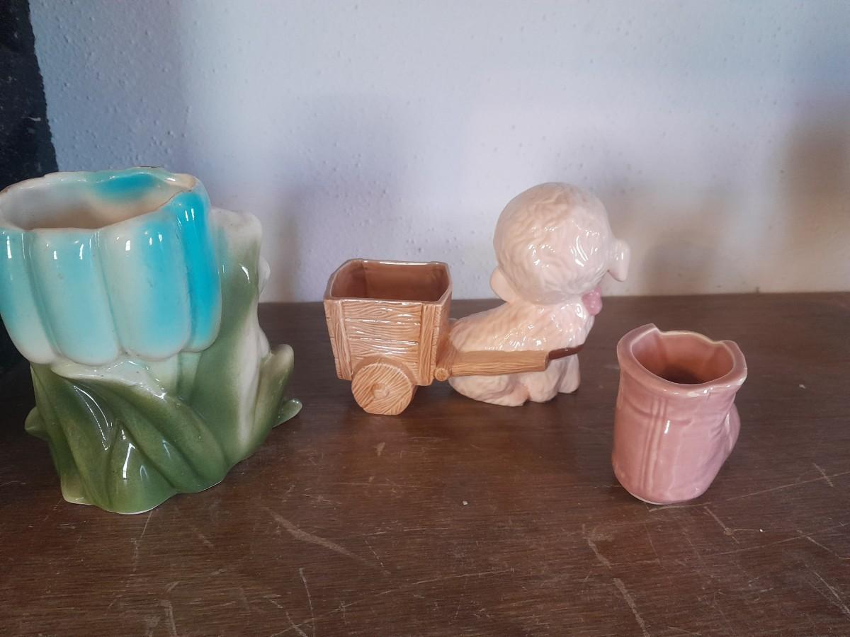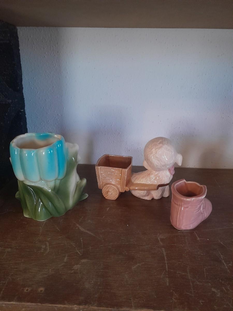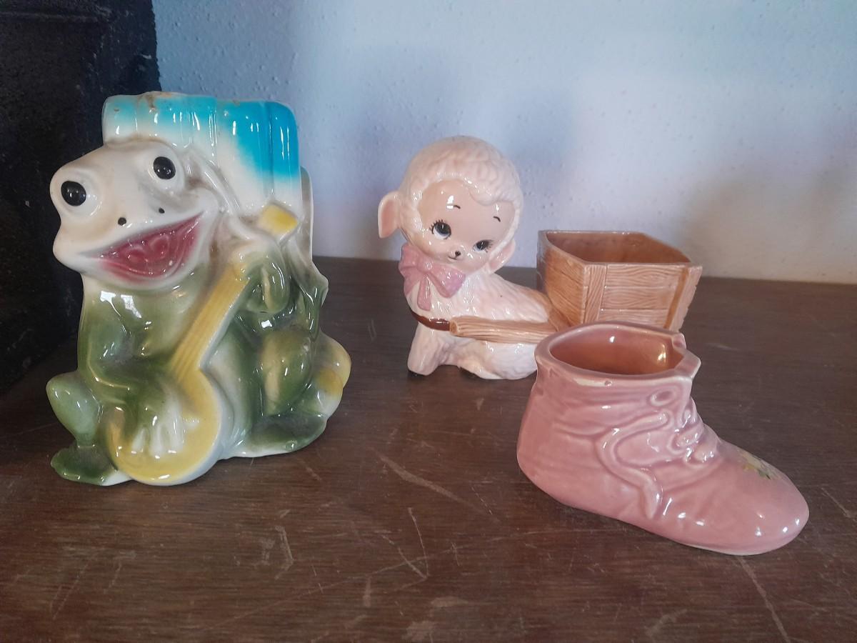 VINTAGE CERAMIC PLANTERS / FIGURES, FROG, LAMB WITH CART AND A BABY SHOE
