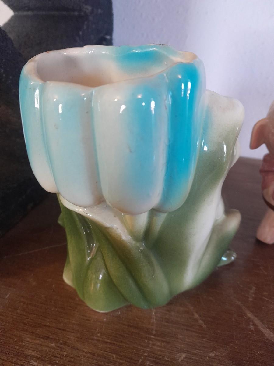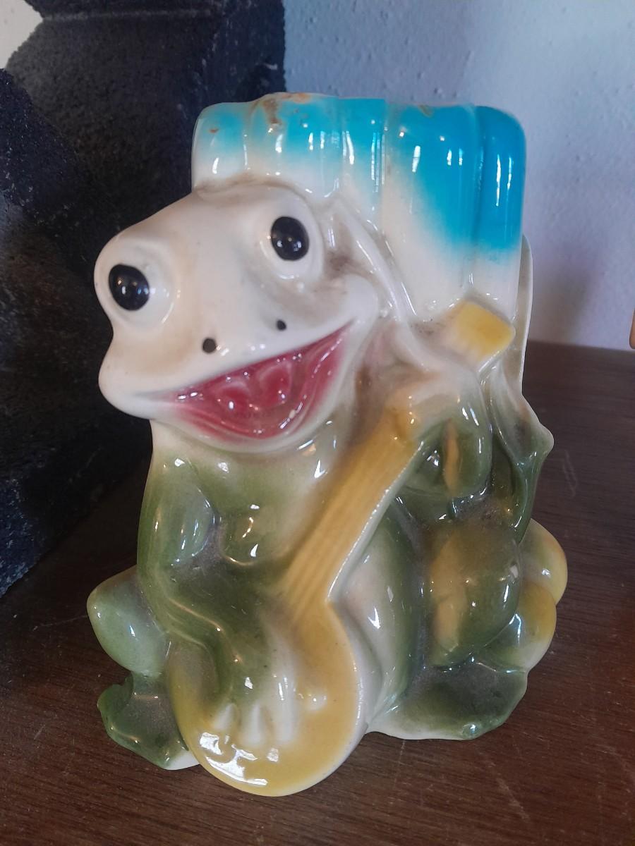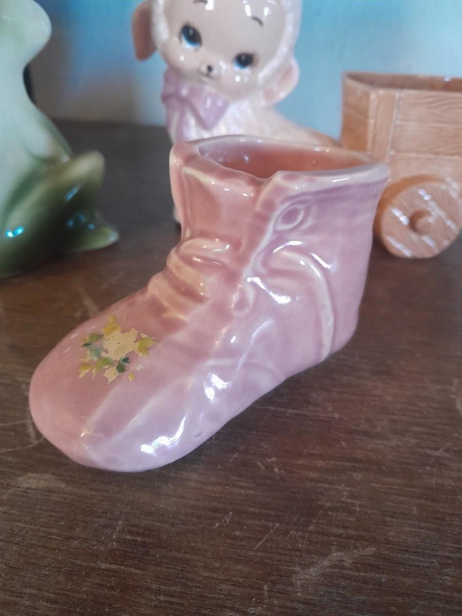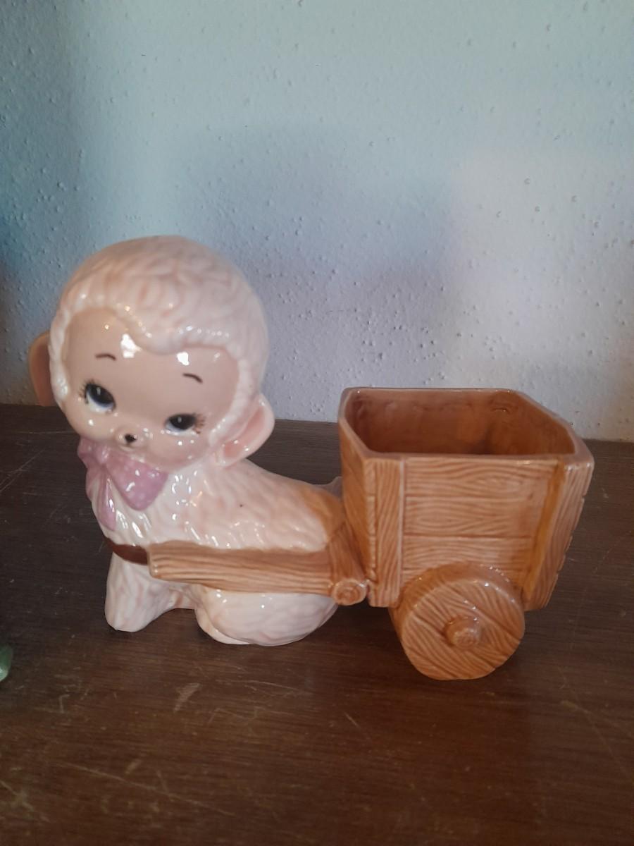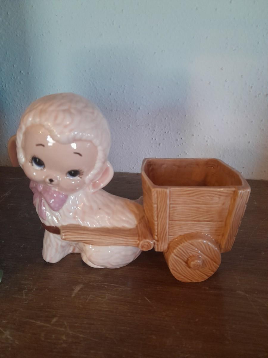 VINTAGE CERAMIC PLANTERS / FIGURES, FROG, LAMB WITH CART AND A BABY SHOE