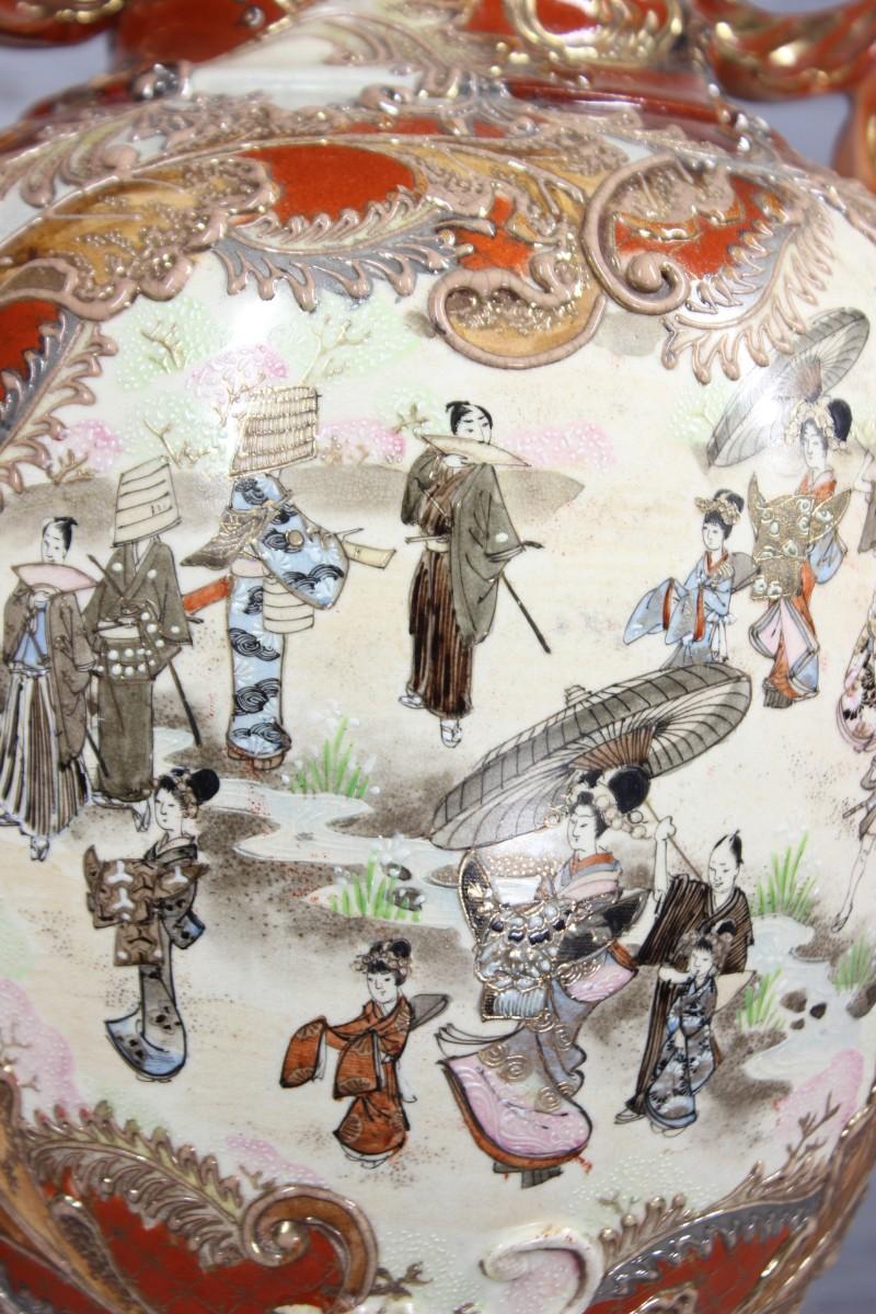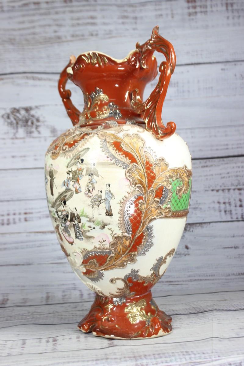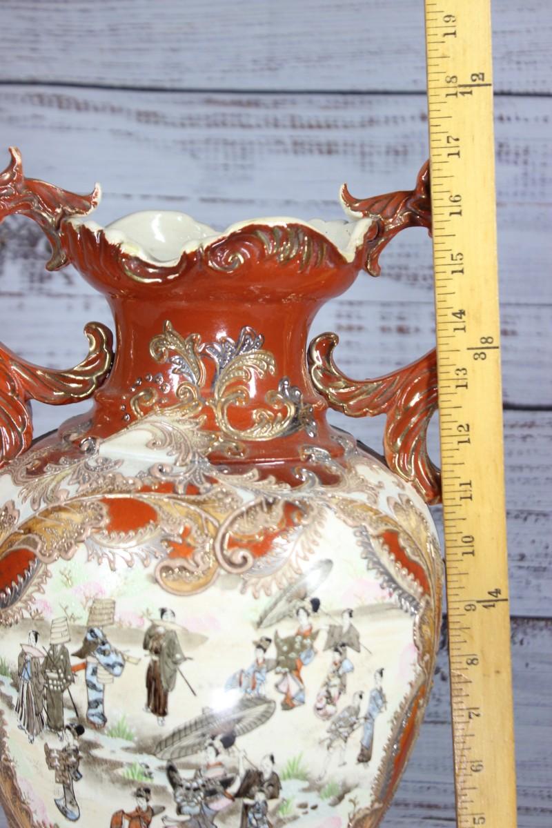 Vintage ceramic Chinese double handle vase. Beautiful details feature people on one side, floral design all over. There has been repair done to the base. Large about 18" tall.