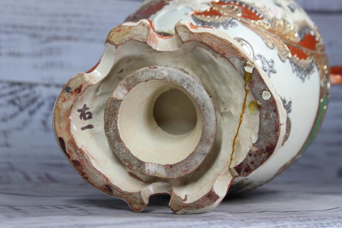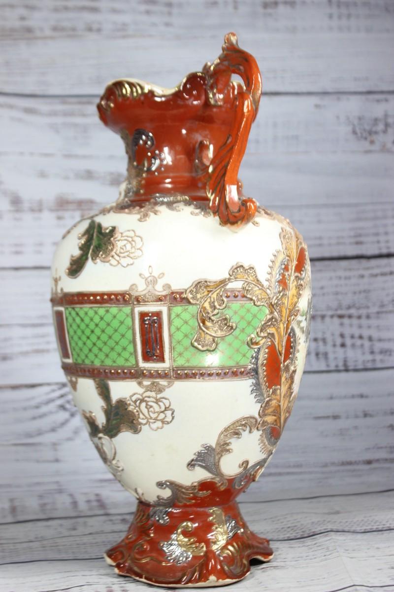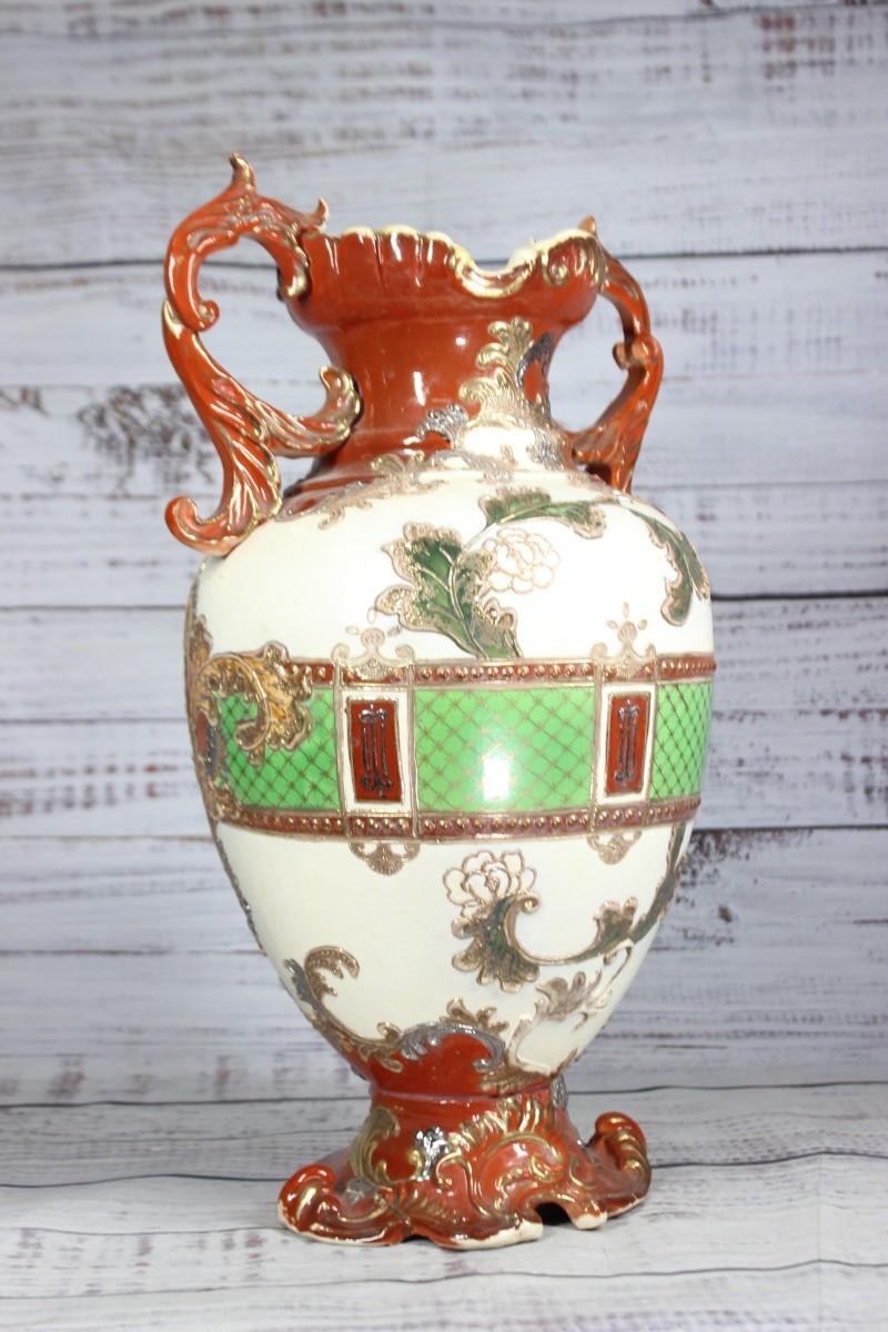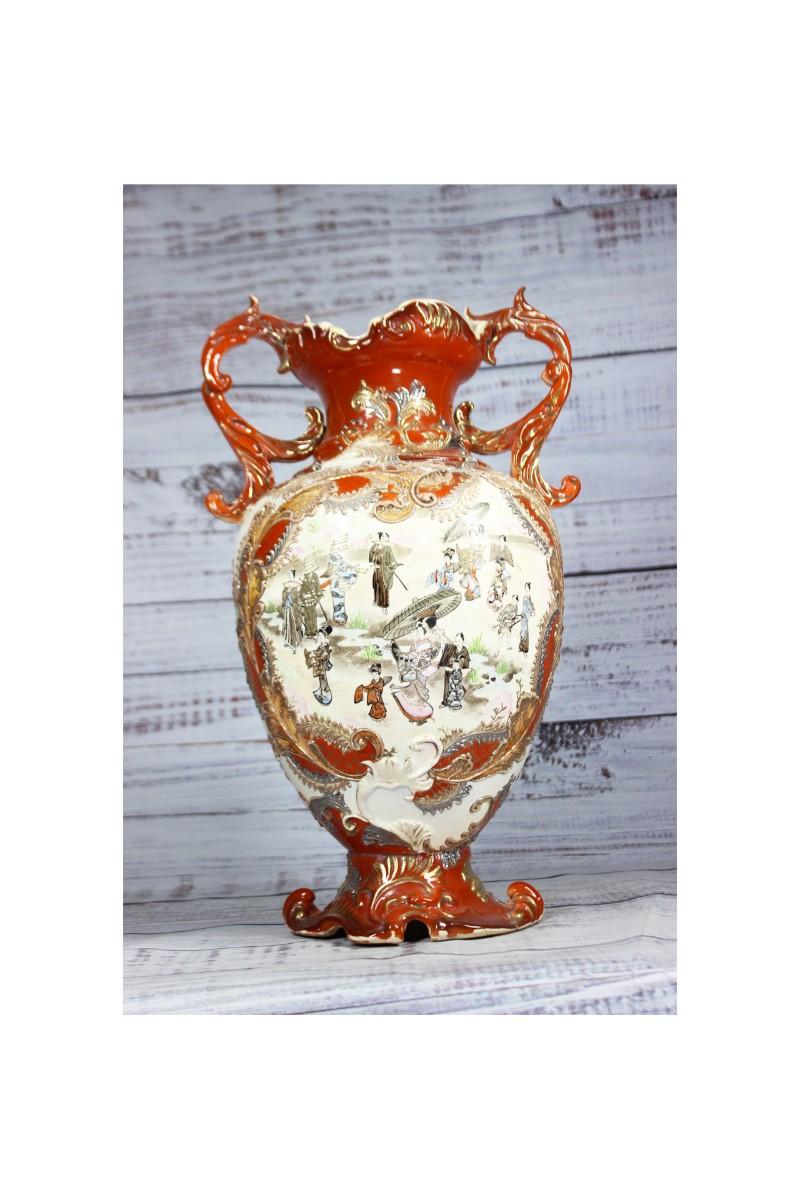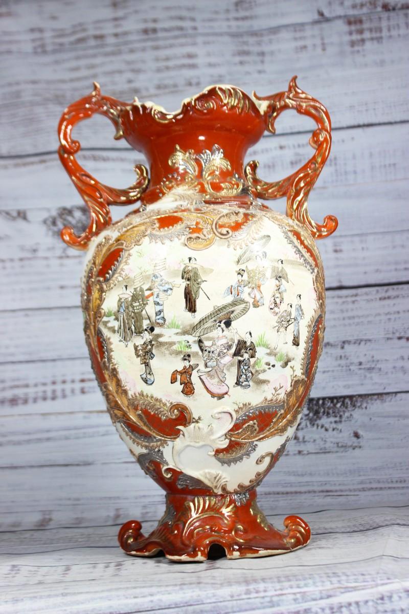 Vintage ceramic Chinese double handle vase. Beautiful details feature people on one side, floral design all over. There has been repair done to the base. Large about 18" tall.