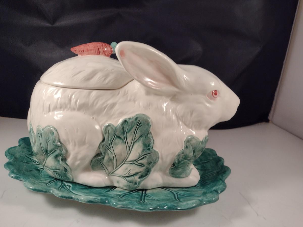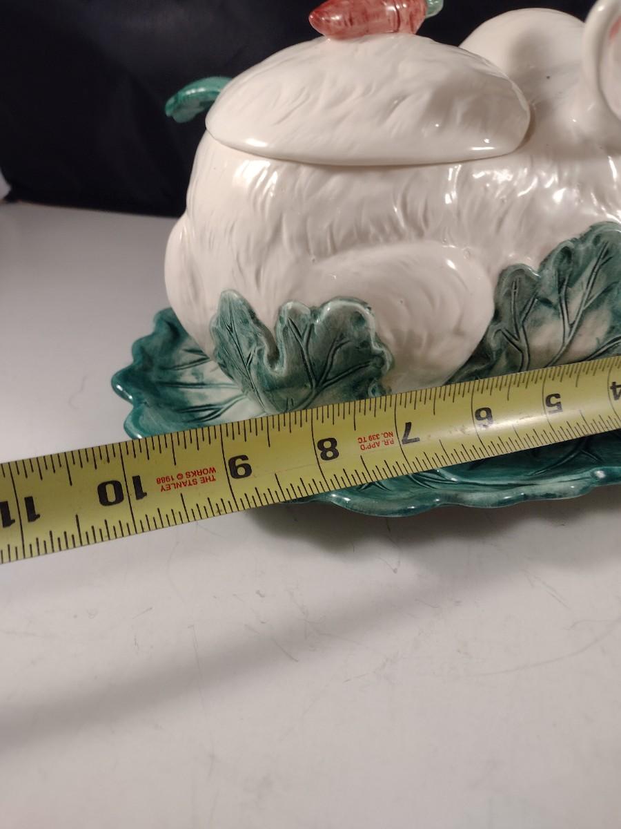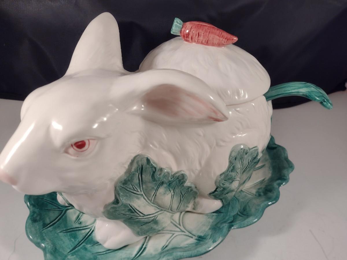 Vintage Ceramic Rabbit Resting on Cabbage Leaf Soup Tureen with Ladle Haldon Group