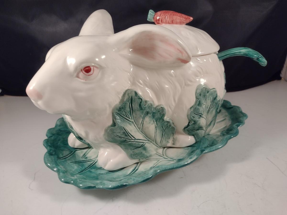 Vintage Ceramic Rabbit Resting on Cabbage Leaf Soup Tureen with Ladle